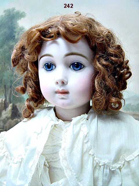 Bouche fermée, beaux yeux de sulfure bleu, oreilles percées et rapportées, corps articulé d'origine avec orteils détachés, beaux vêtements anciens, perruque d'époque, bottines taille 13 marquées "E Jumeau Médaille d'Or 1878". 70 cm.