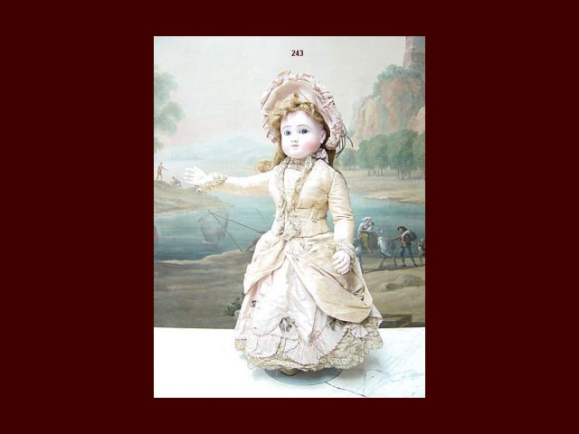 Bouche fermée, yeux bleus mobiles avec mécanisme Bourgoin, oreilles percées, beau corps articulé d'orgine avec belles mains en biscuit, calotte et perruque d'origine. 62 cm.