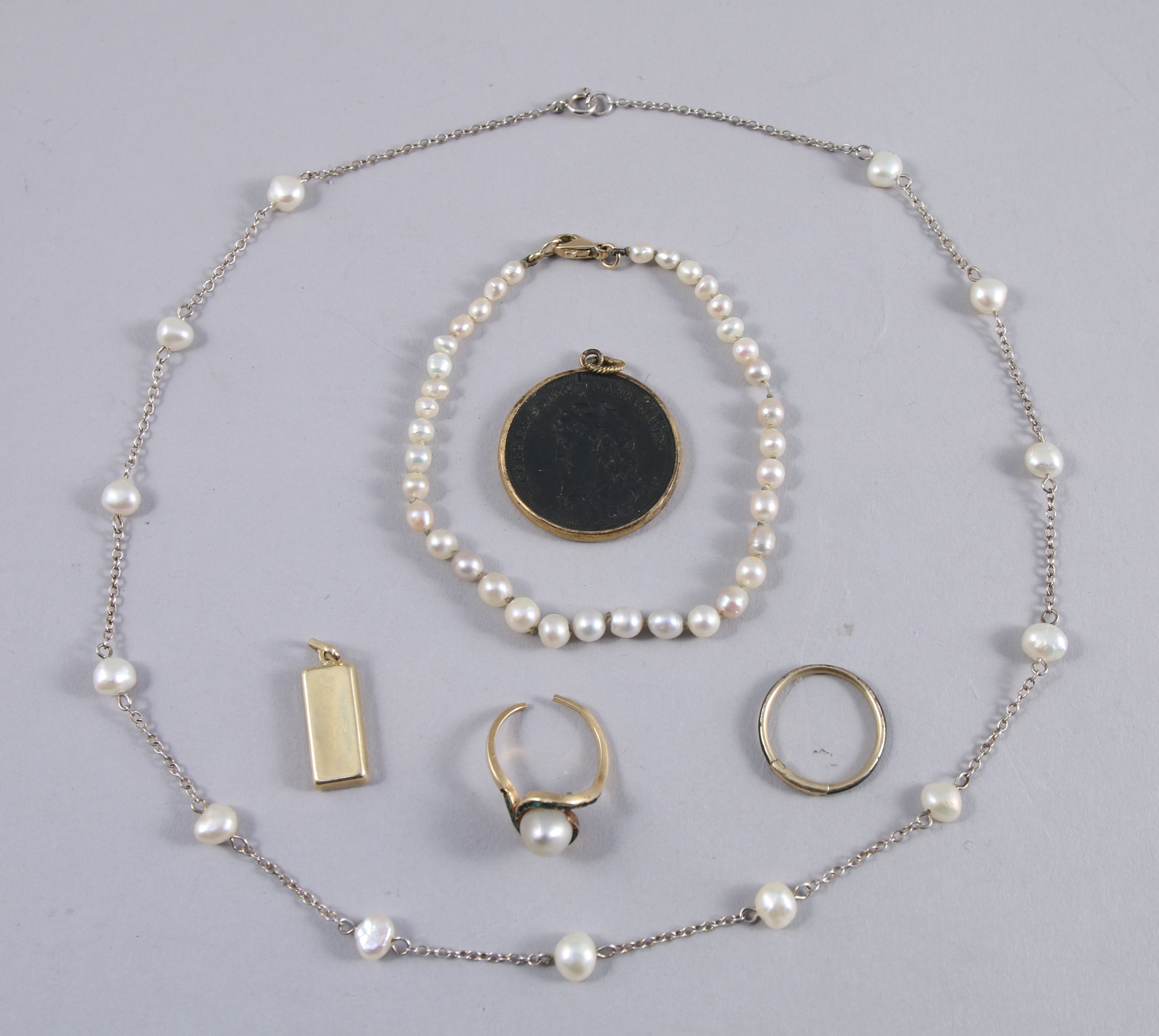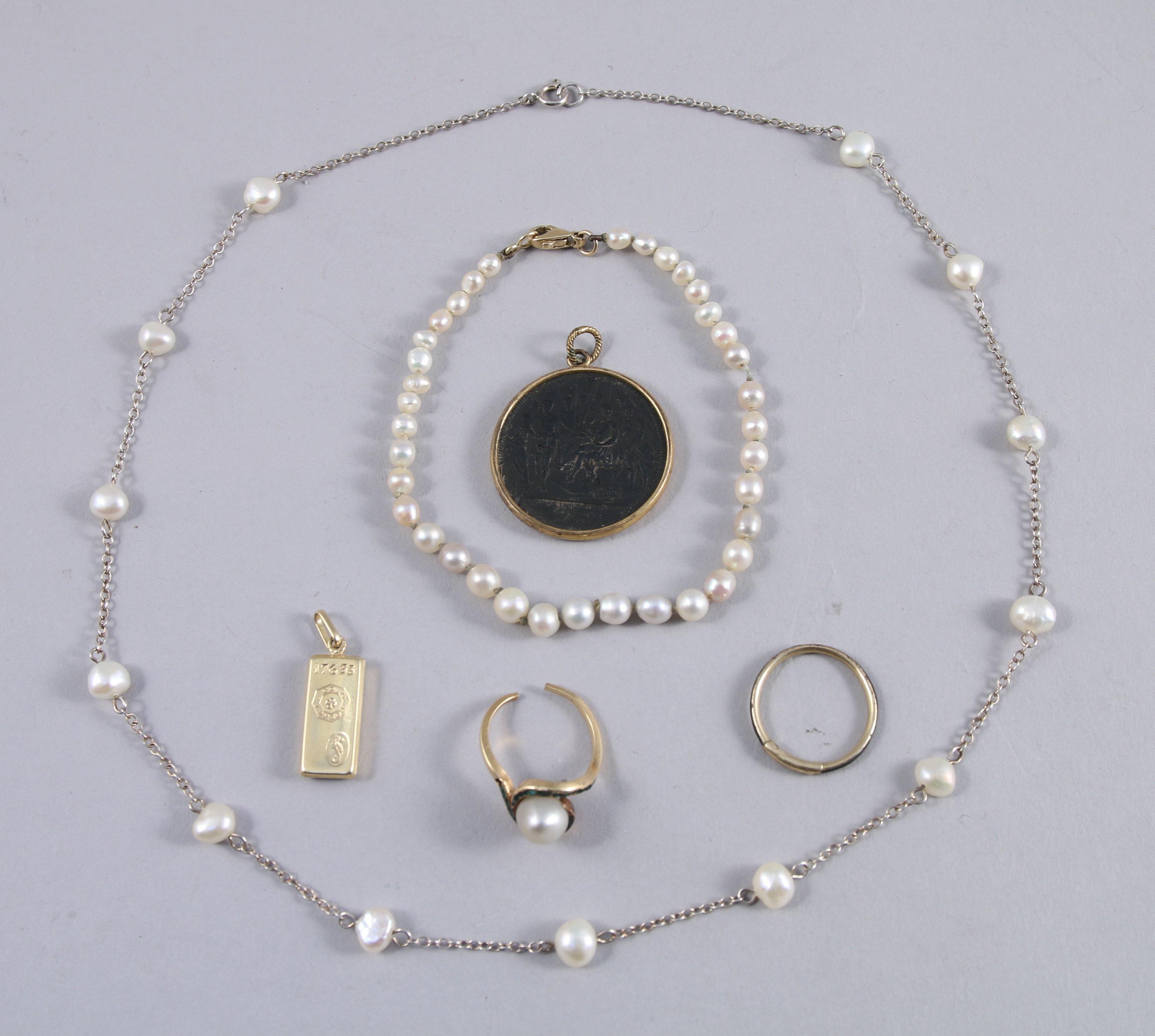 JOINT : QUATRE BIJOUX : un PENDENTIF LINGOT en or jaune (1,1 g), une BAGUE en or jaune ornée d'un poil animal (Poids brut 0,4 g), un JETON de SCPION L'AFRICAIN par DASSIER monté en or jaune (Diam. 25 mm, Poids brut 4,5 g) et une BAGUE en or jaune ornée d'une perle et de petites pierres vertes (Poids brut 2,5 g).