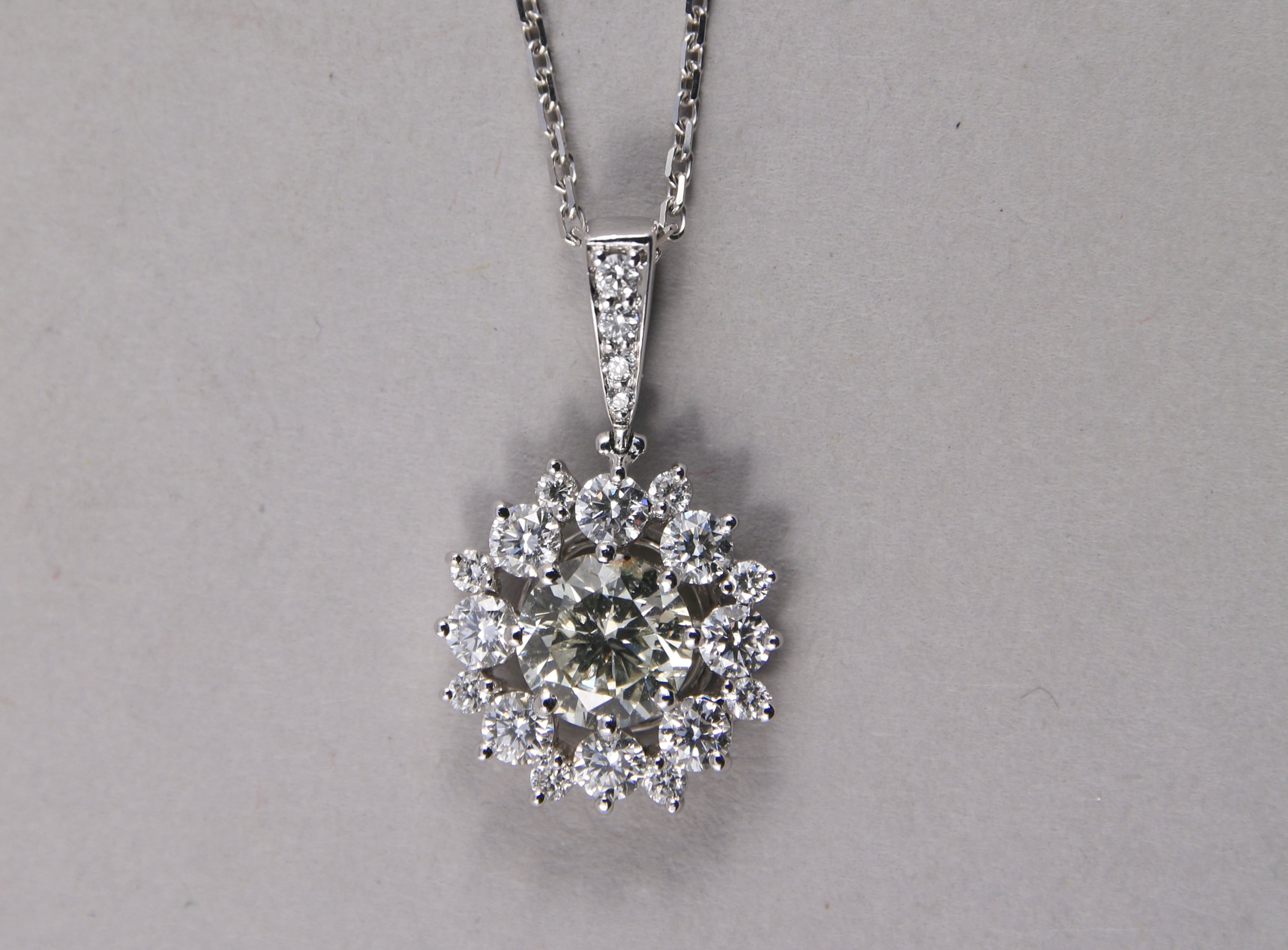 PENDENTIF marguerite en or blanc 750 millièmes orné d'un DIAMANT taille moderne de 1,02 carat dans un entourage de 20 DIAMANTS taille moderne.