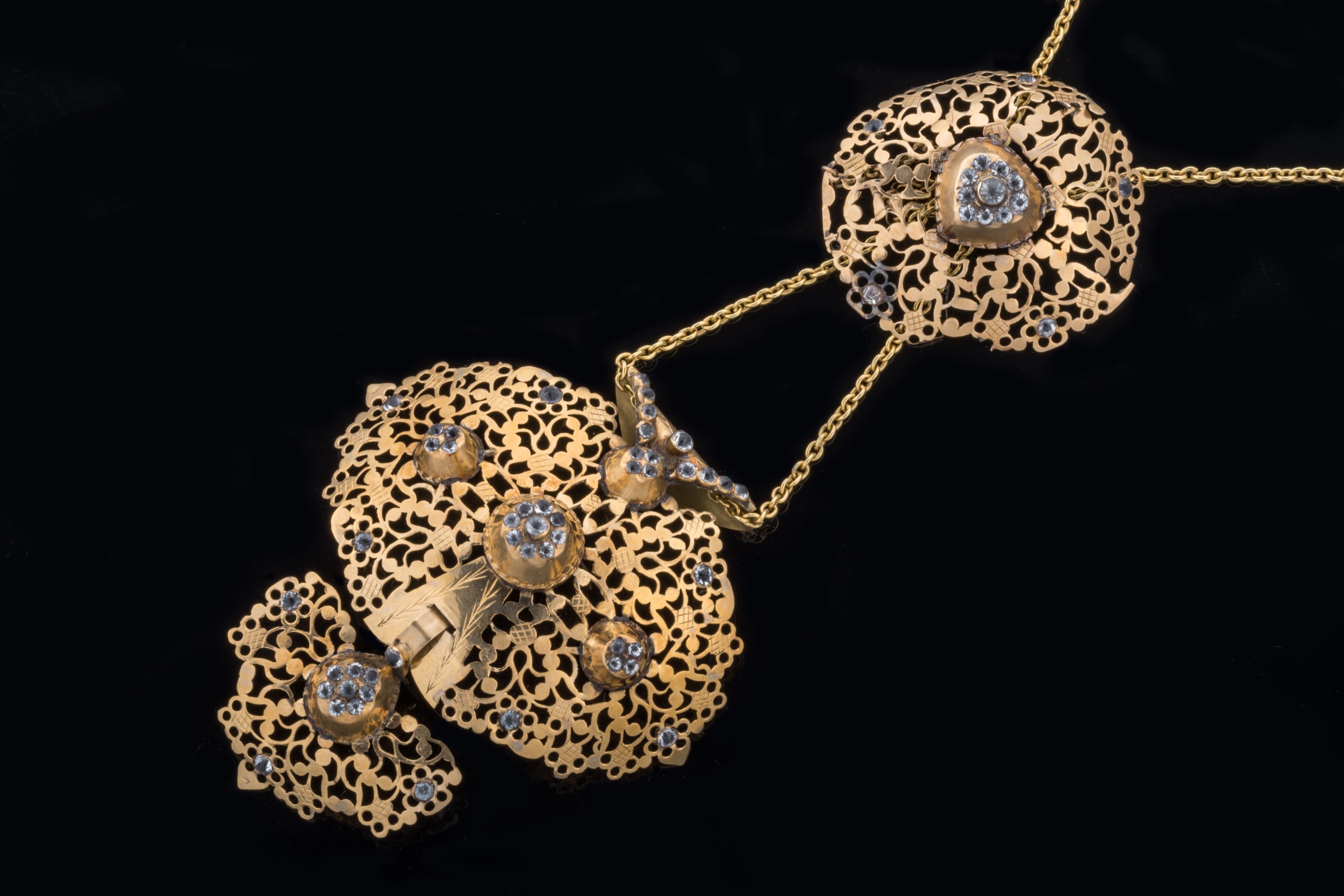 A yellow gold NORMAN CROSS NECKLACE set with rhinestones. Early 19th century.