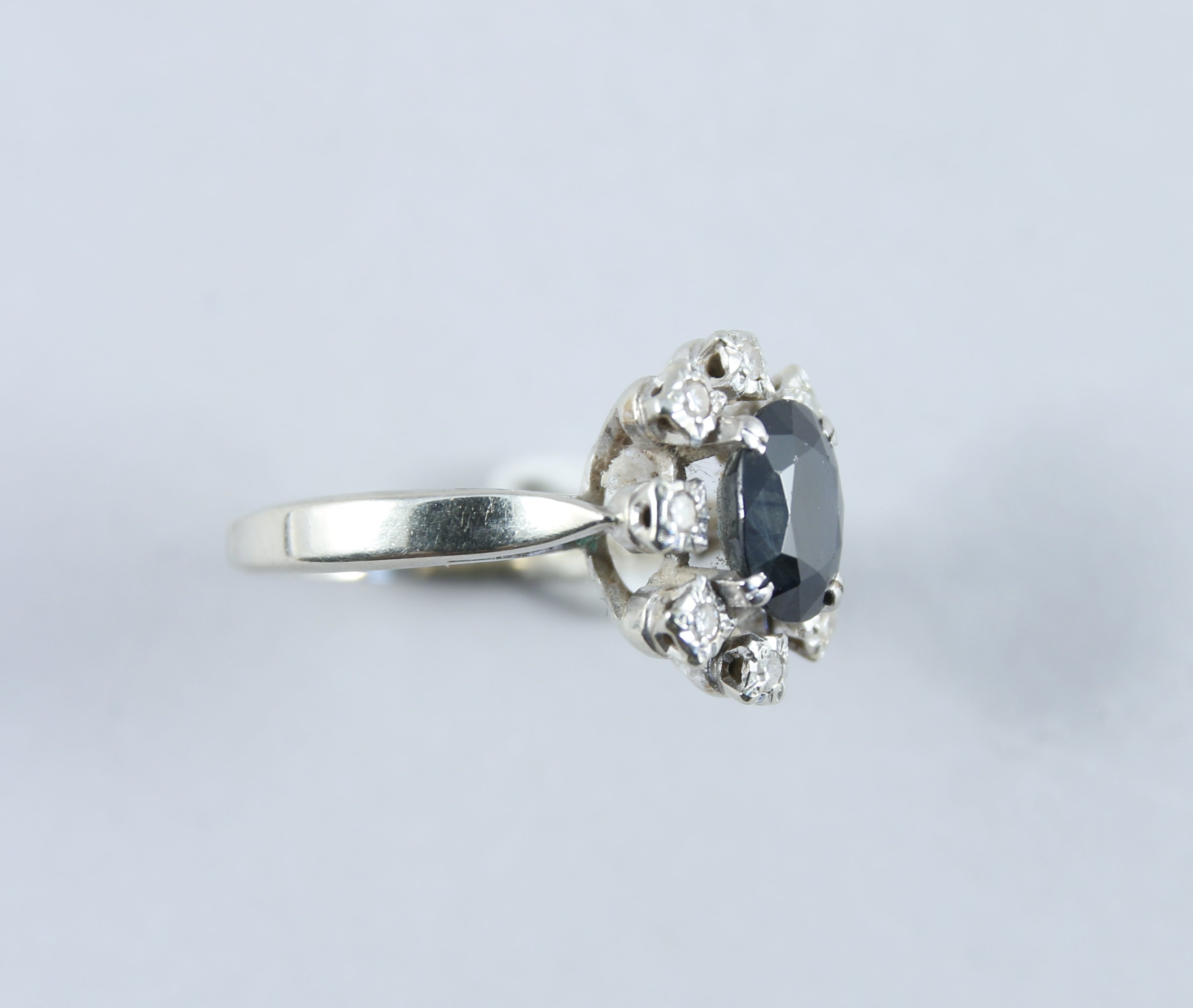 BAGUE en or gris 750 millièmes, ornée d'un SAPHIR ovale dans un entourage de huit DIAMANTS ronds taillés en huit-huit.