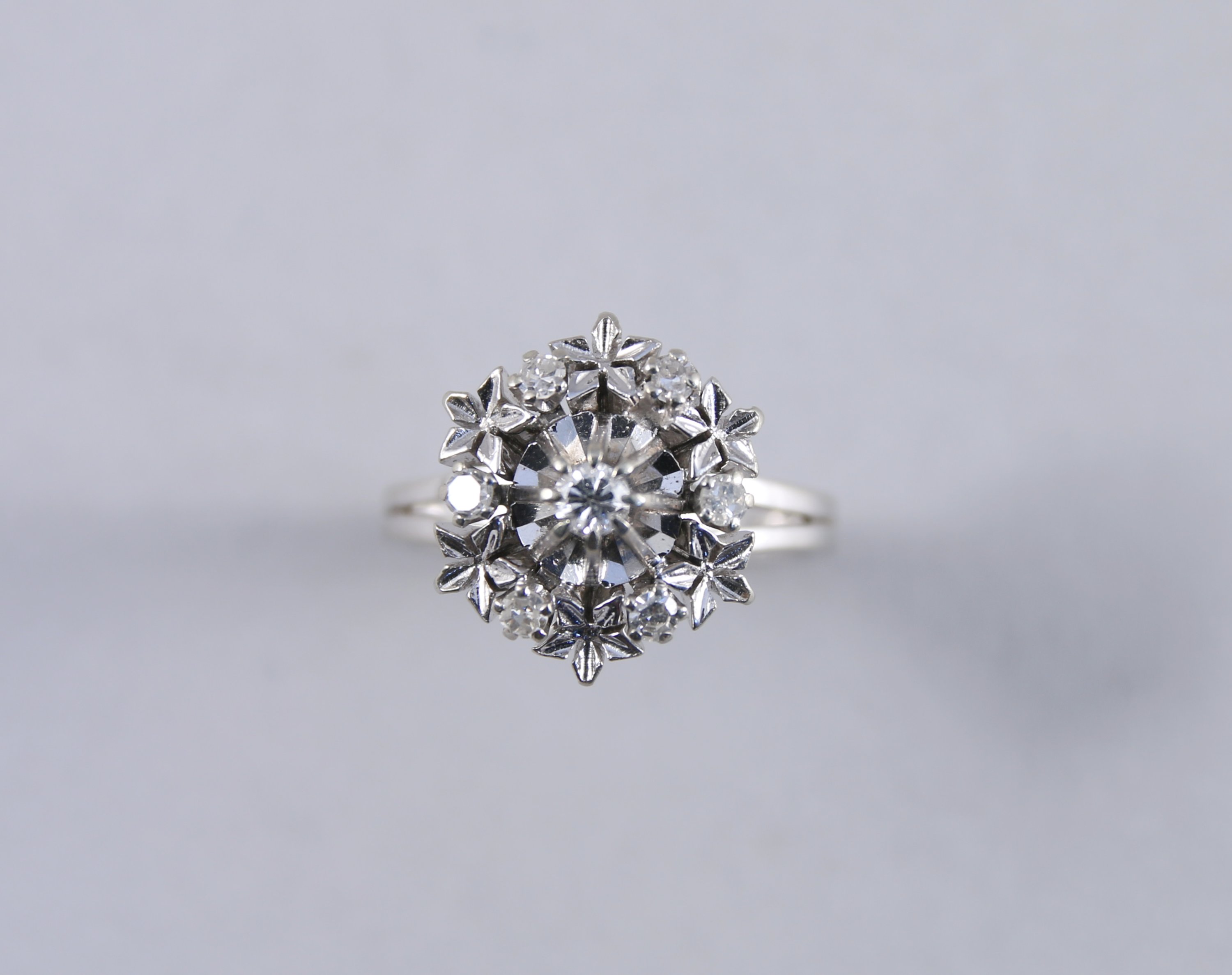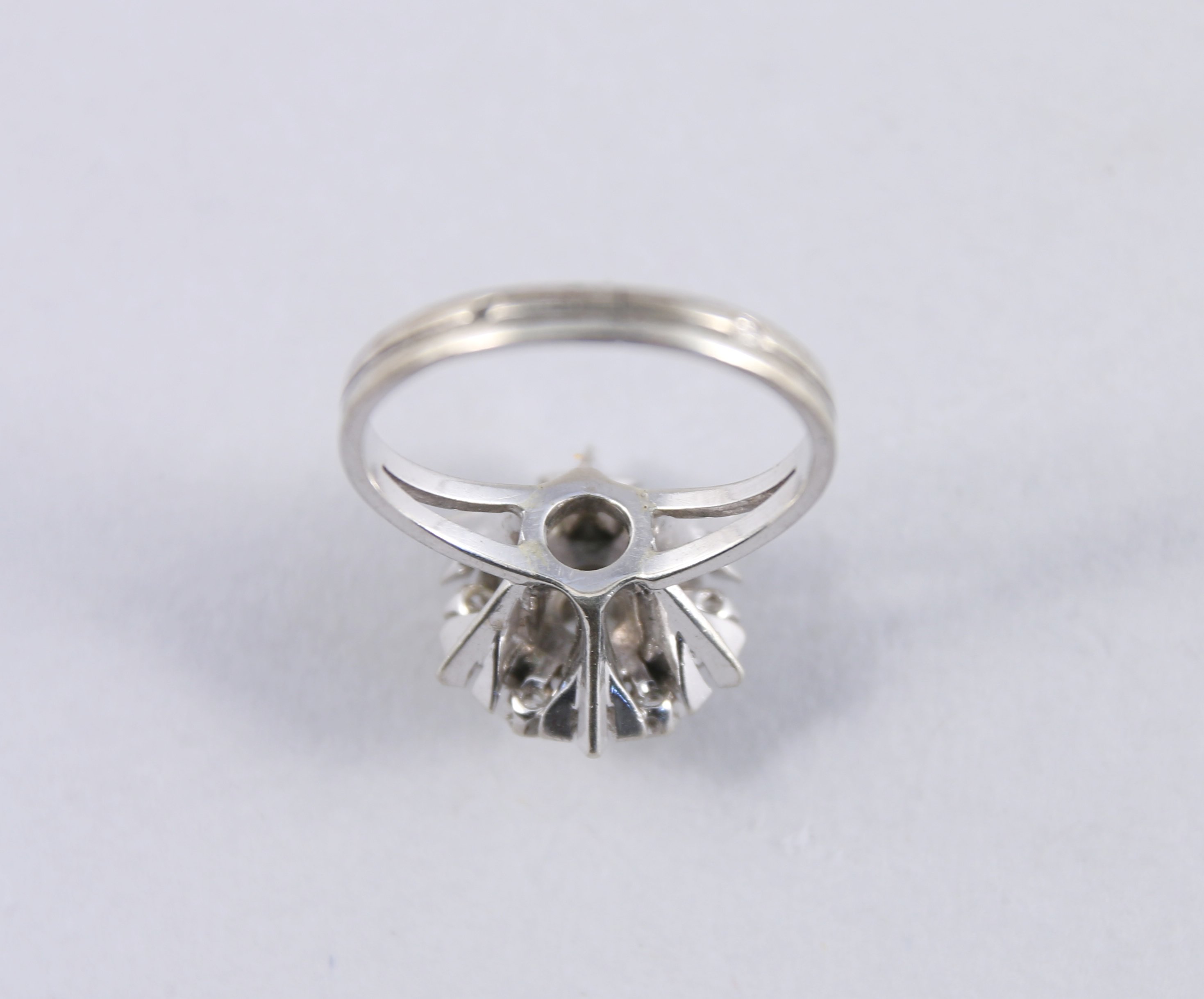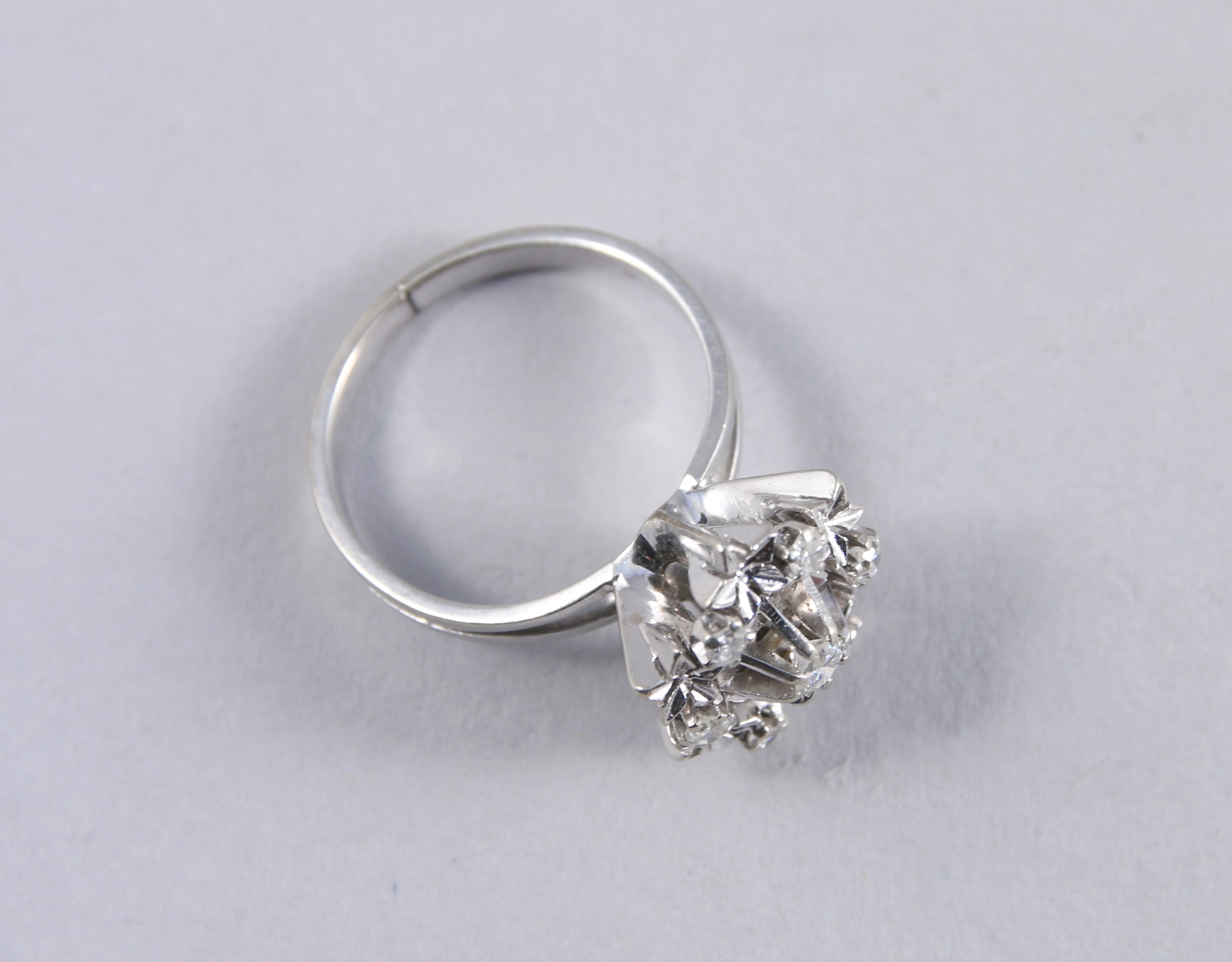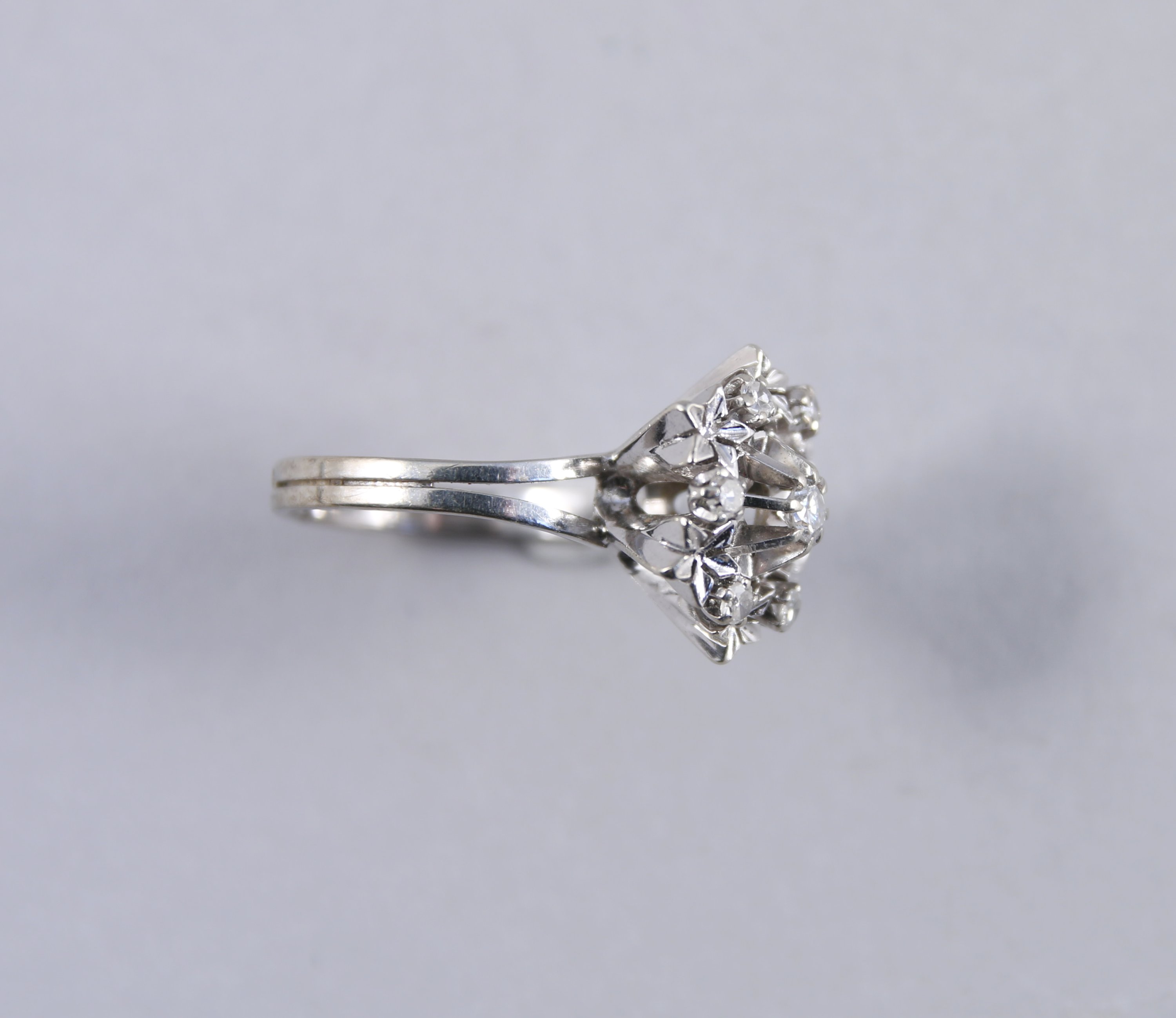 BAGUE en or gris 750 millièmes à décor de fleurettes, ornée de DIAMANTS ronds taillés en huit-huit, celui du centre plus important de taille brillant.
