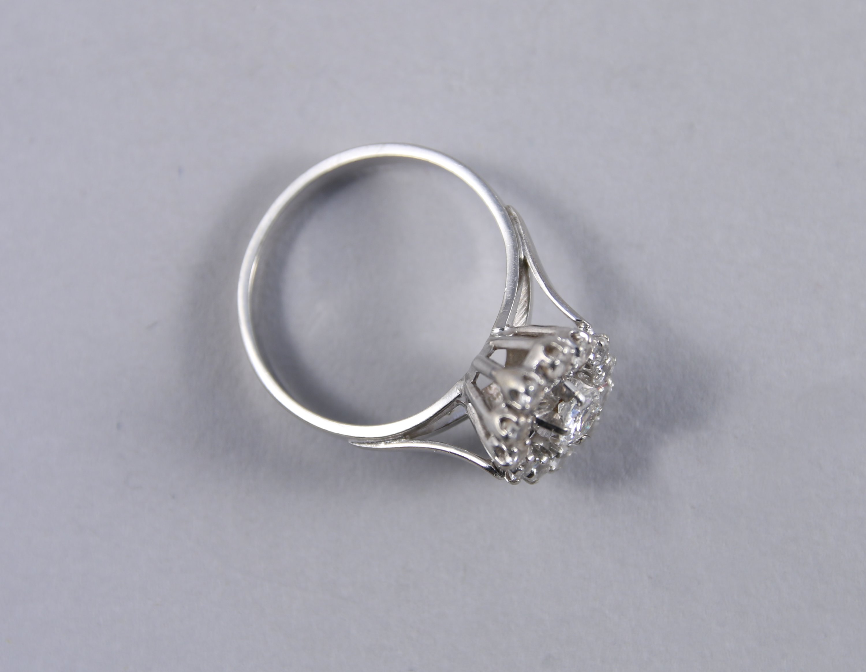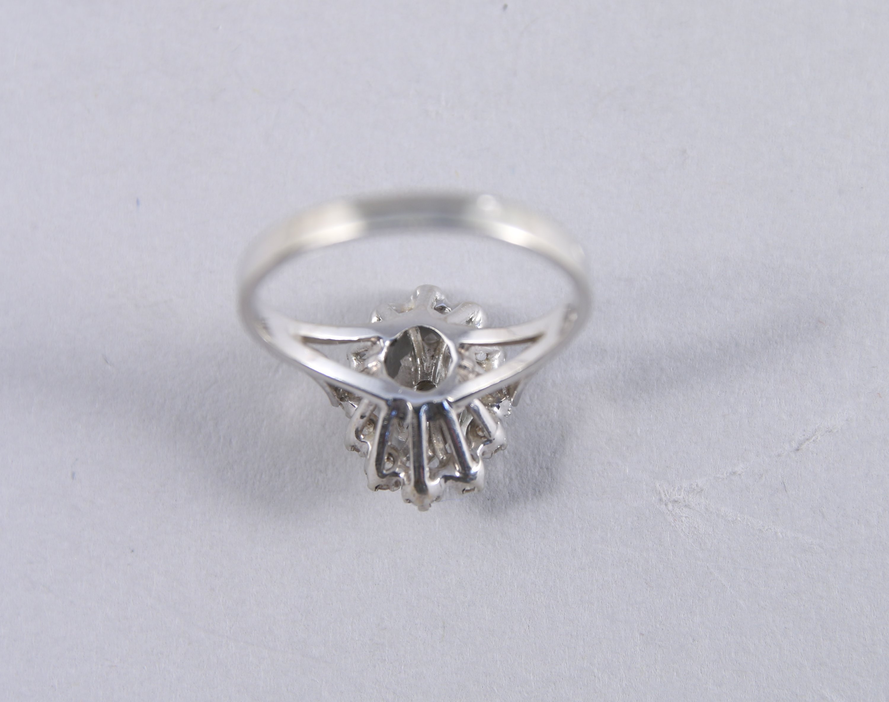 BAGUE en or gris 750 millièmes, ornée d'un DIAMANT rond de taille ancienne dans un entourage de douze pierres d'imitation de couleur blanche.
