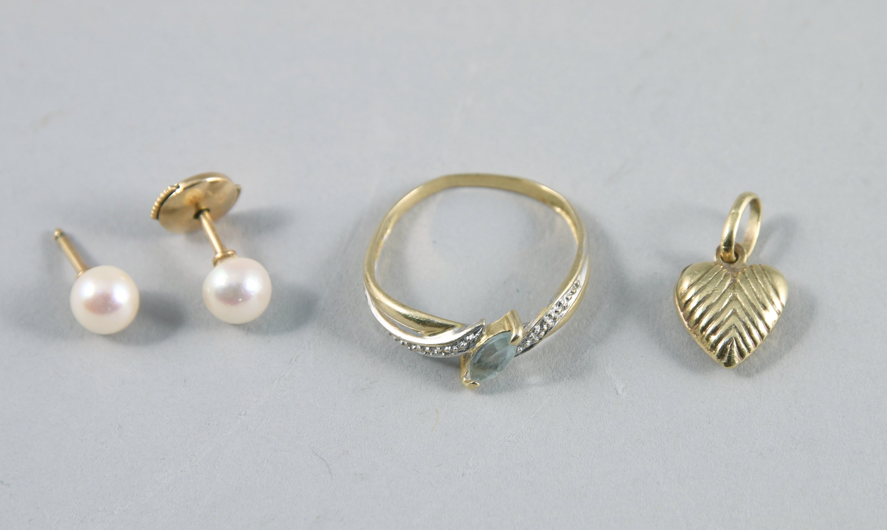BAGUE ornée d'une pierre bleue et de brillant (TDD52), Paire de BOUCLES d'OREILLES (manque un fermoir) et un PENDENTIF COEUR en or jaune 18K.