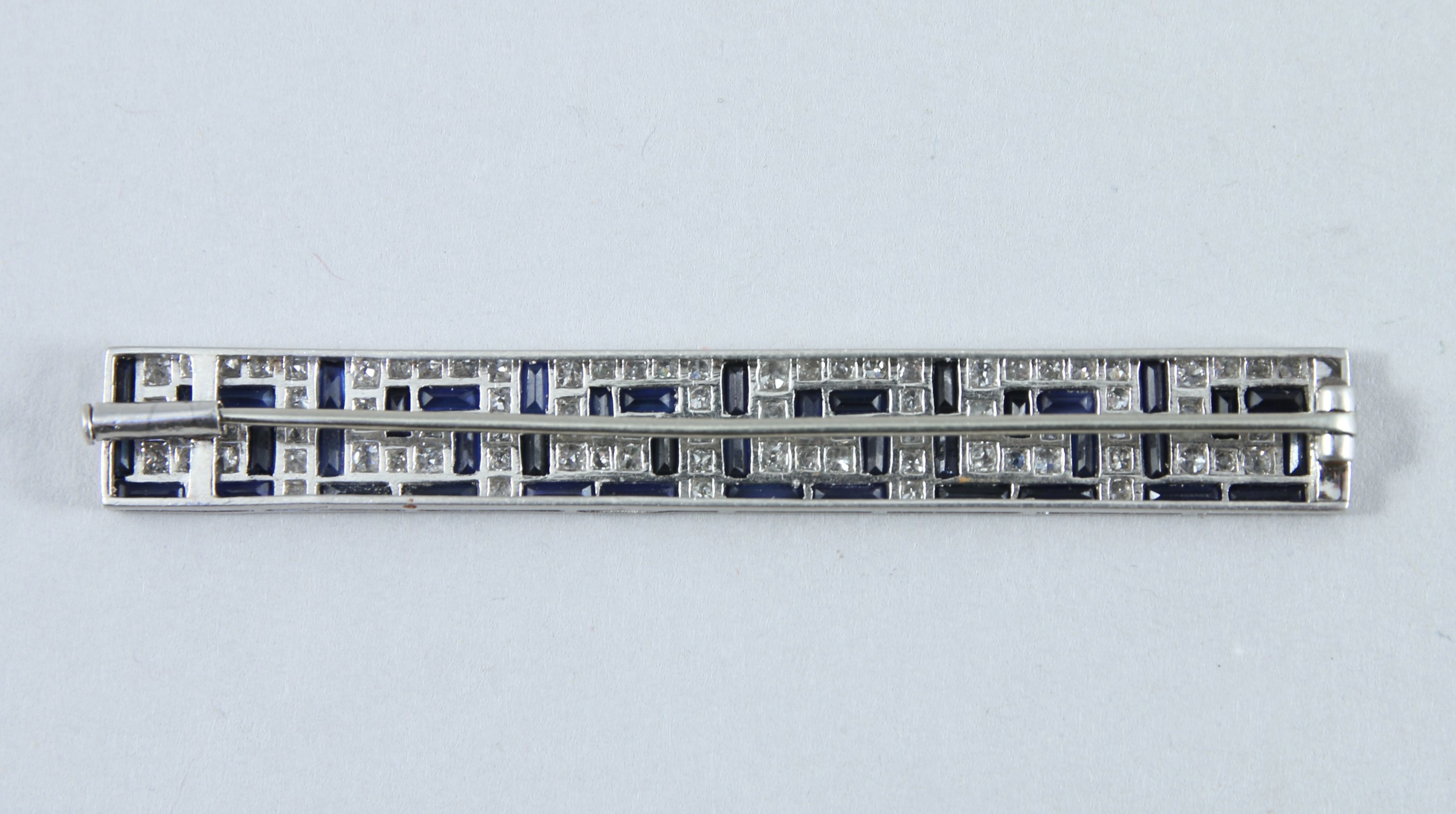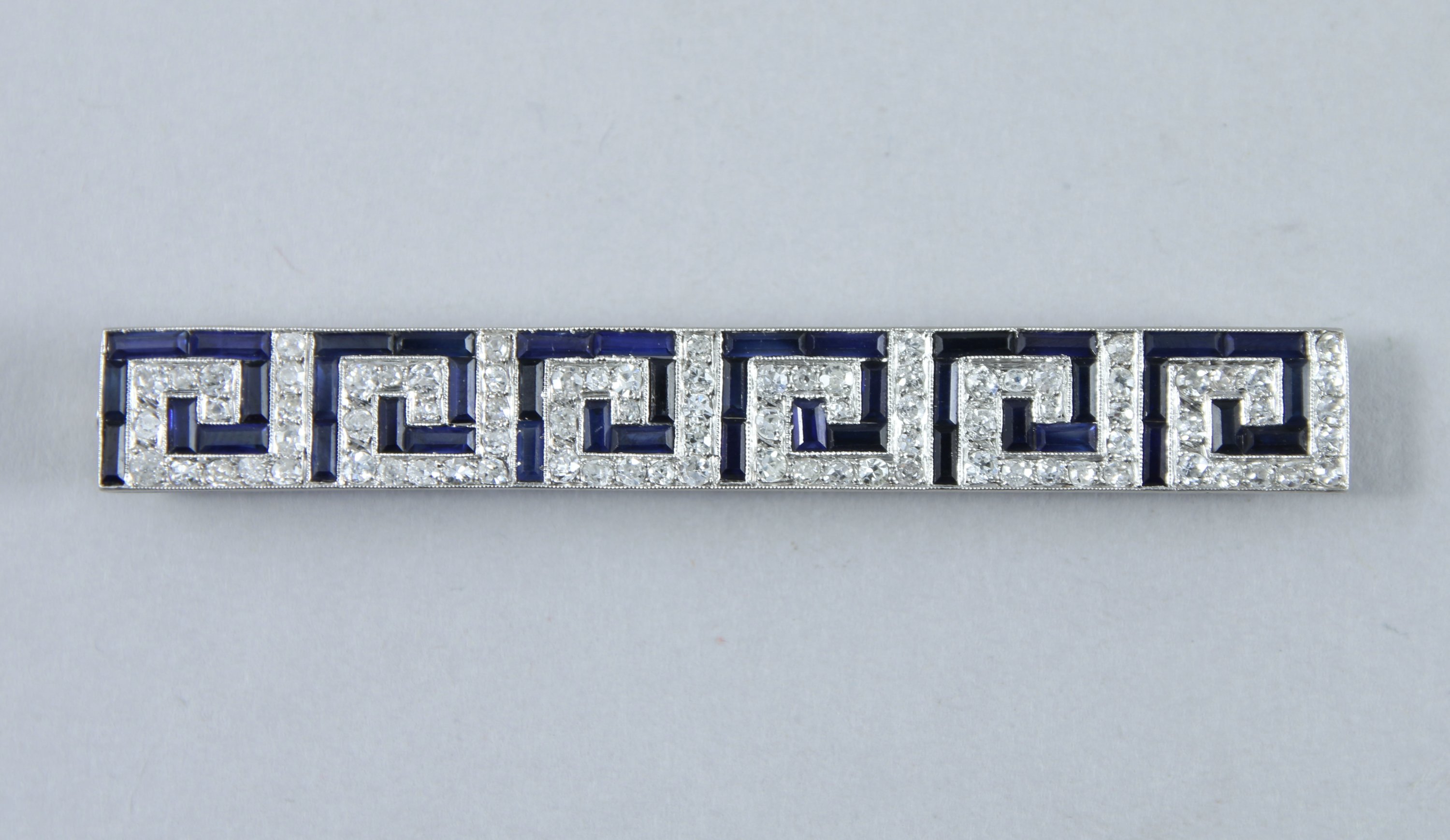 BROCHE de forme rectangulaire en platine pavée de DIAMANTS et de SAPHIRS calibrés à motif de grecques.