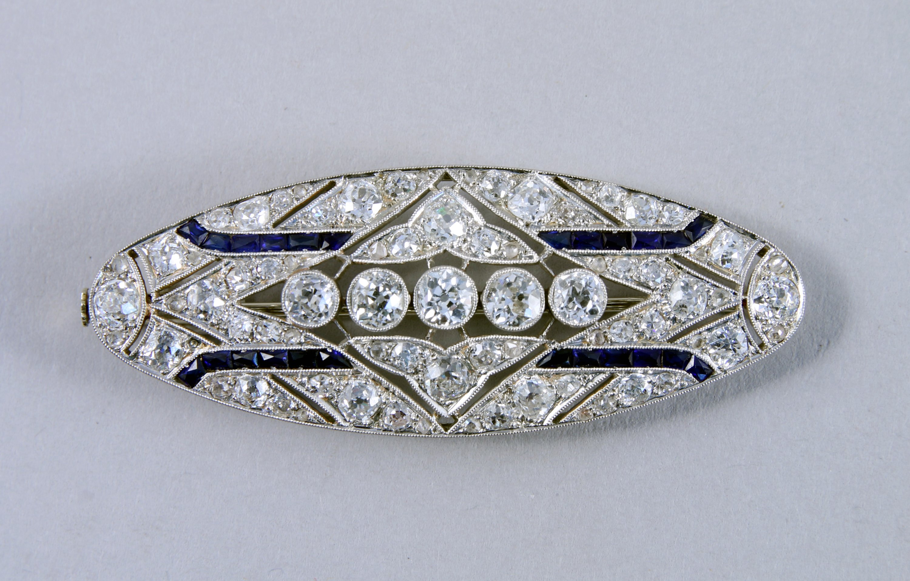BROCHE de forme navette en or gris 750 millièmes et platine. Elle est ajourée de motifs géométriques dont un losange au centre et pavée de 76 DIAMANTS dont cinq plus importants (0,15 carat environ) et de SAPHIRS calibrés.