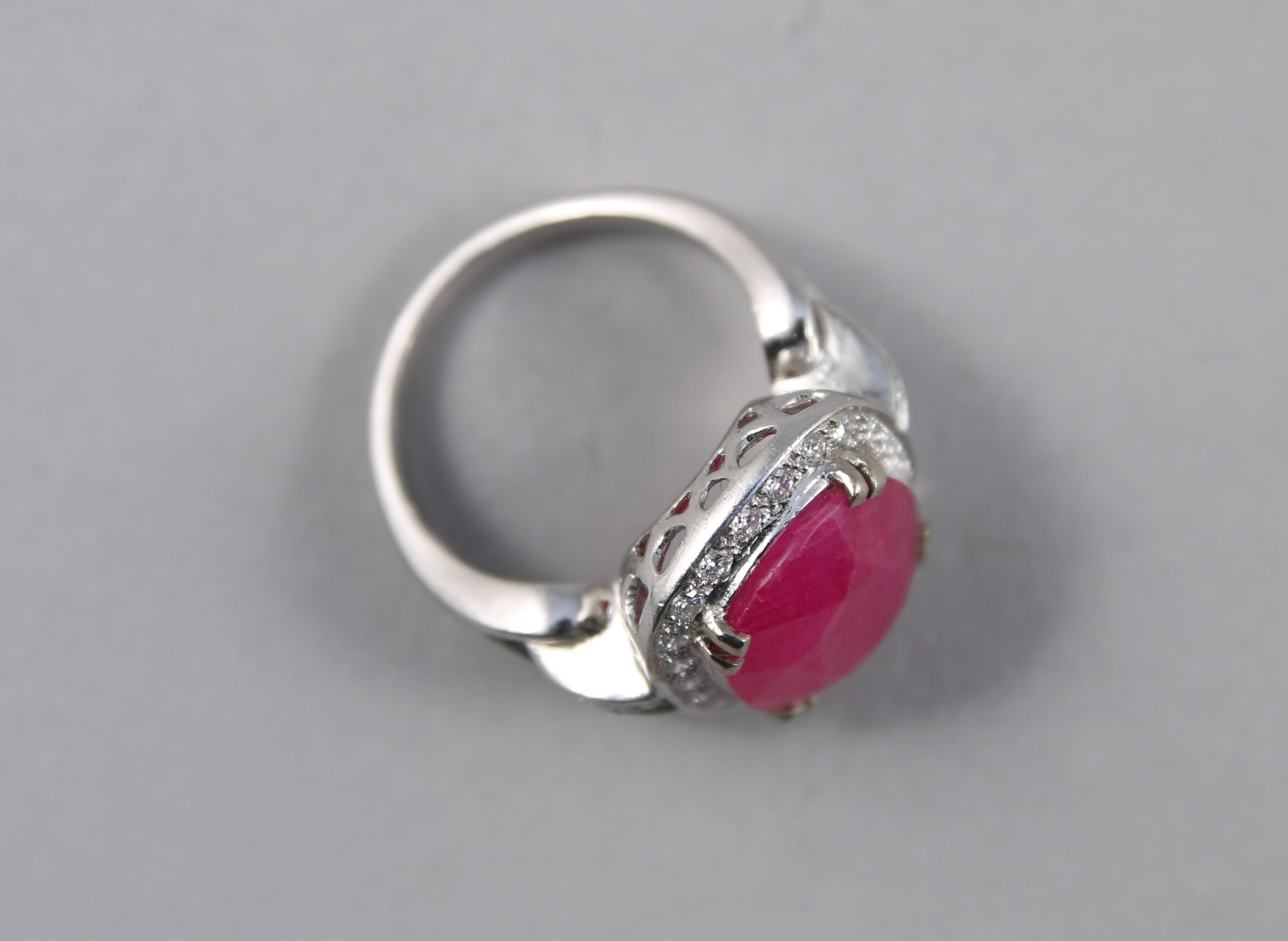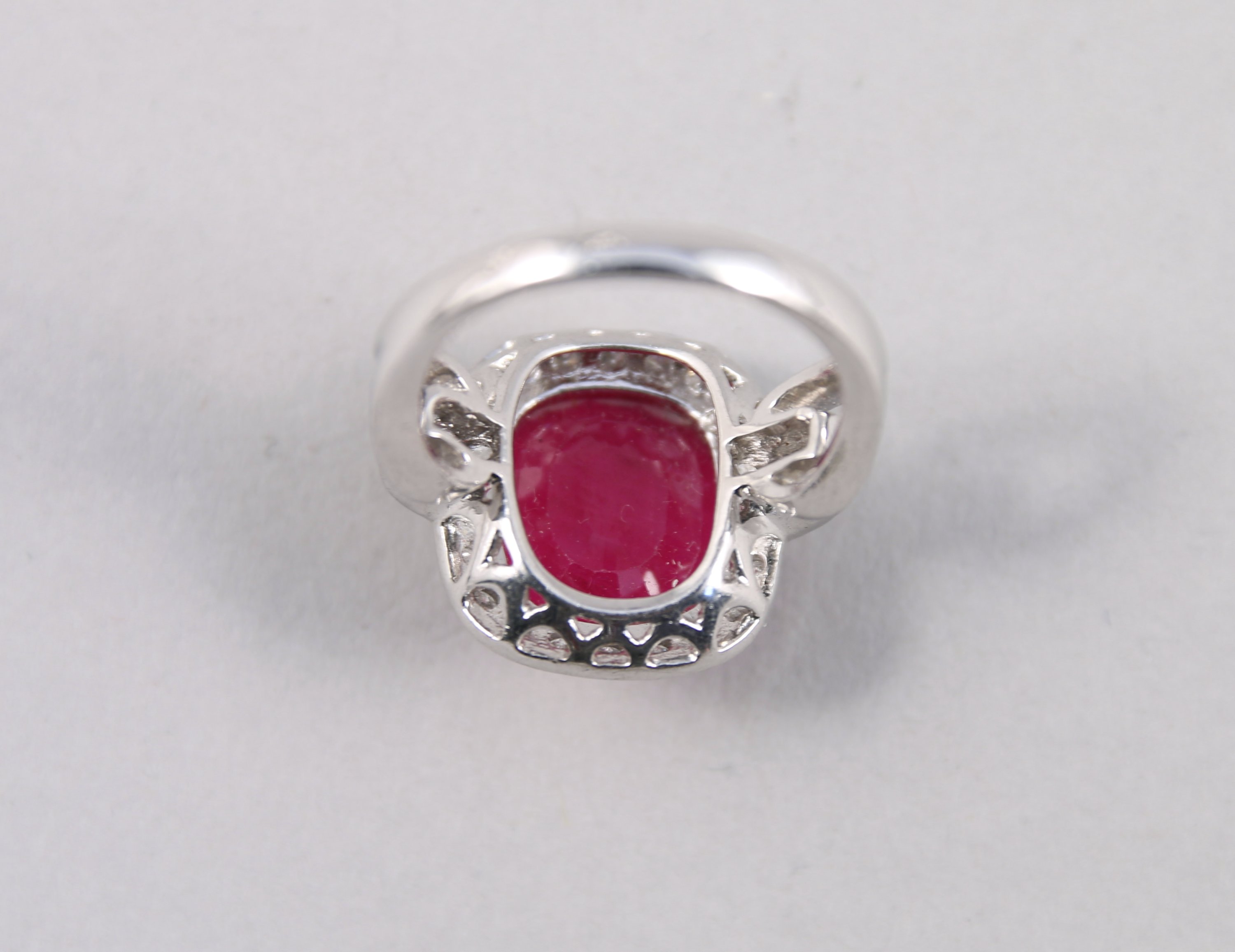 BAGUE coussin en or blanc 750 millièmes ornée d'un RUBIS taille ovale de 8,01 carats dans un entourage de 30 DIAMANTS taille moderne. Monture ajourée.