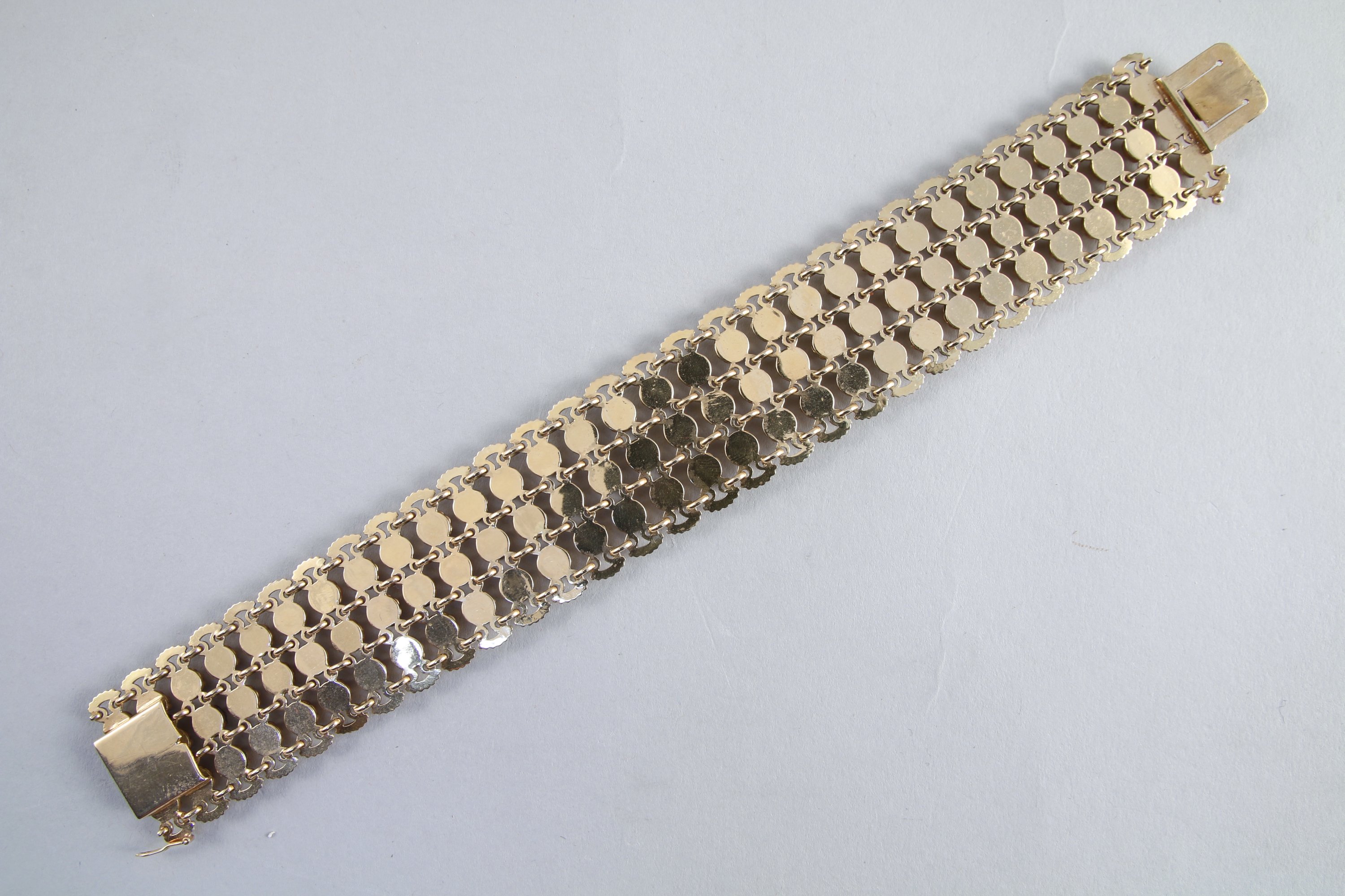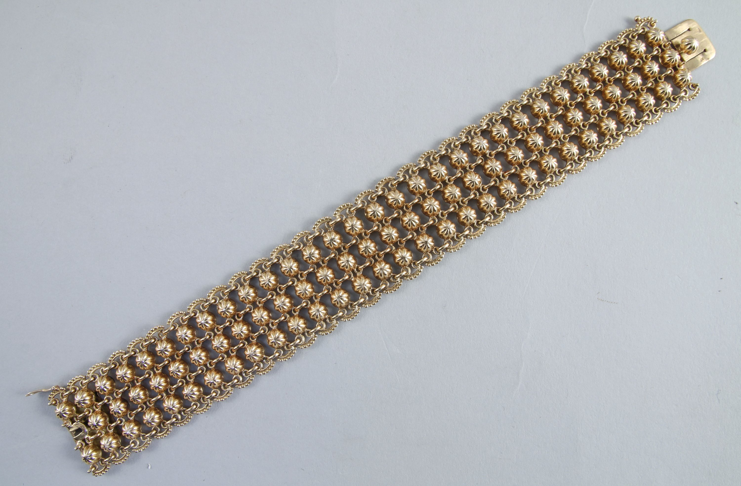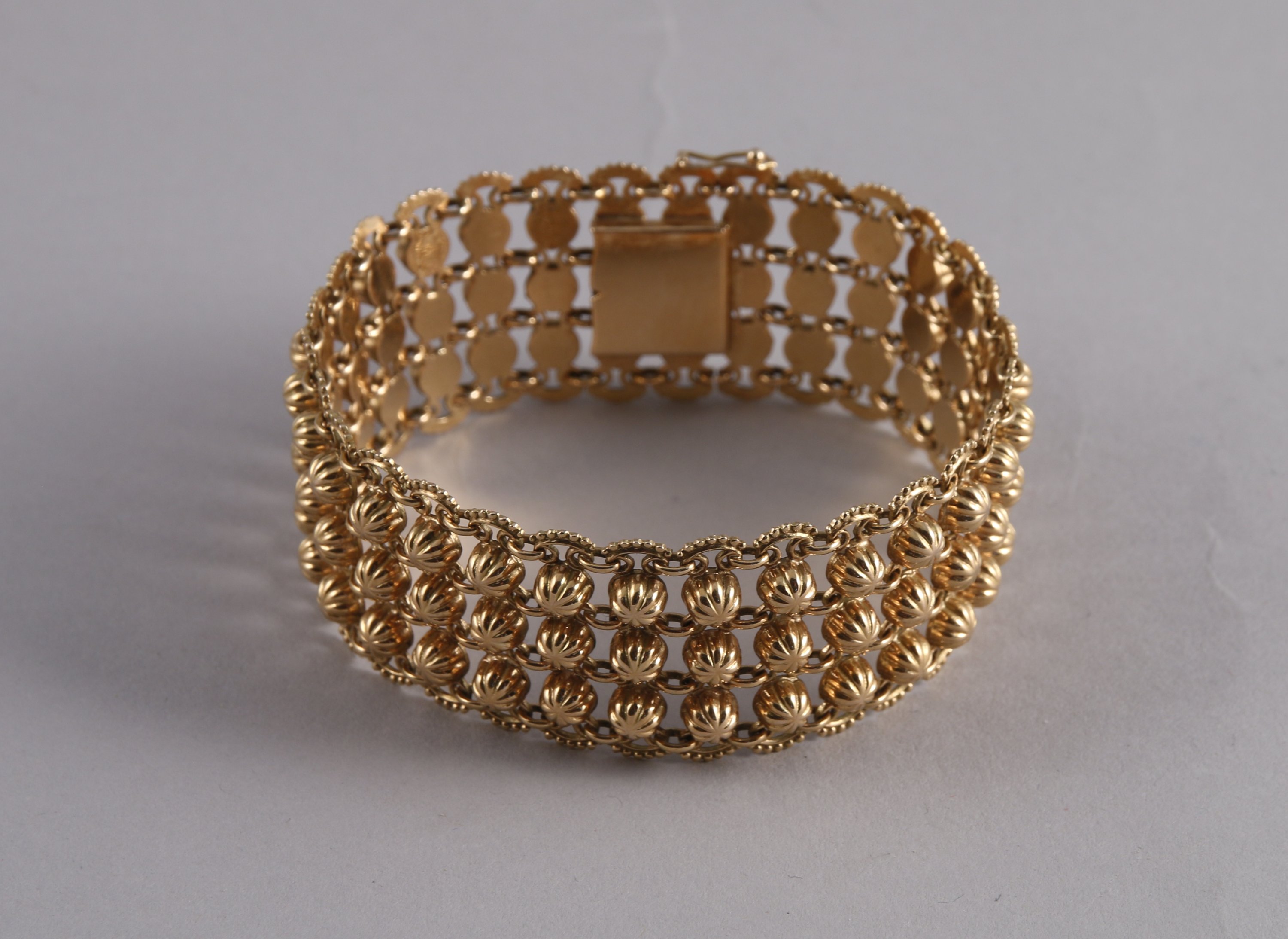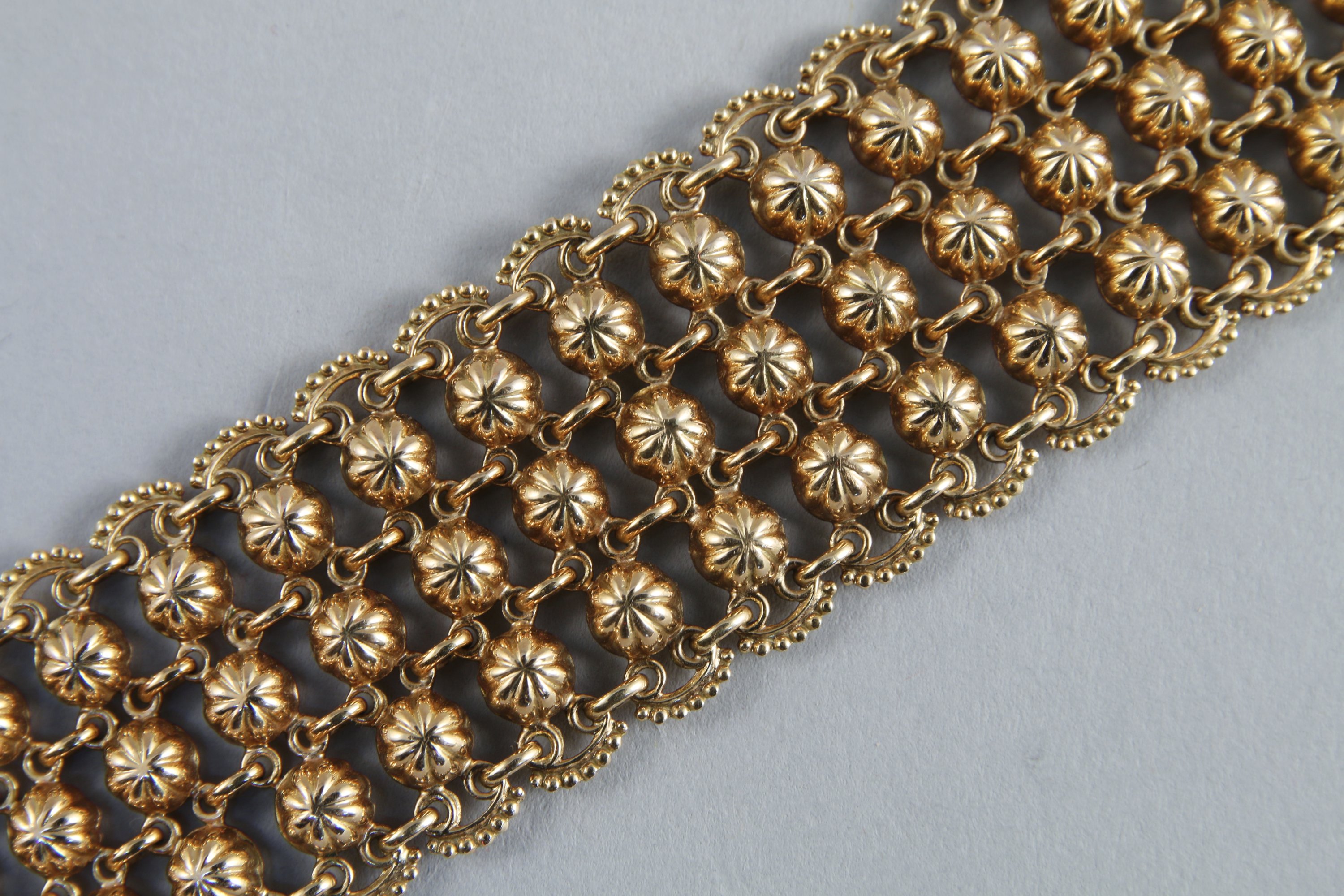 Large BRACELET articulé en or jaune 750 millièmes composé de 90 cabochons godronées par rangs de trois, réunis par des chainettes.