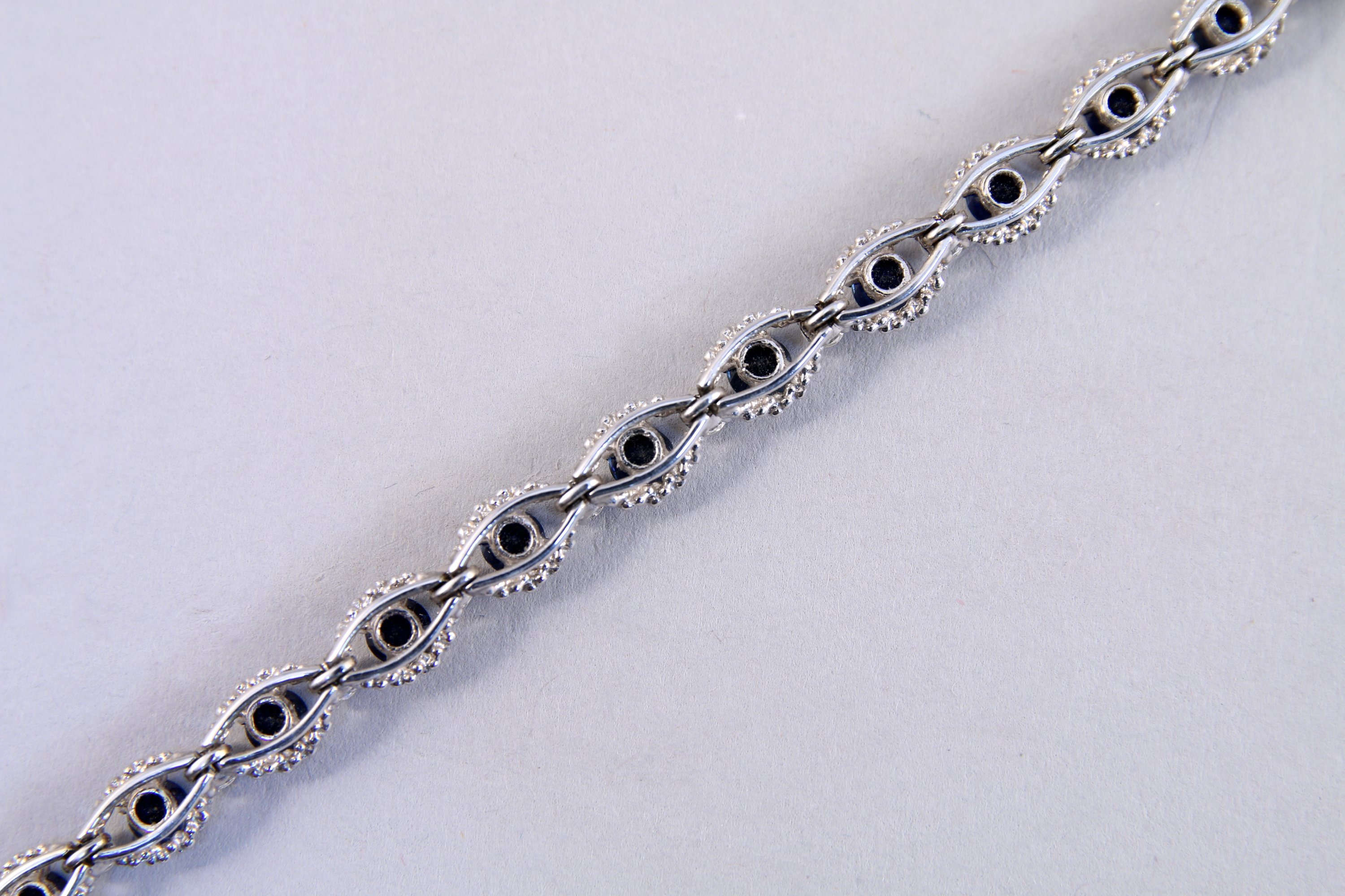 BRACELET articulé en or blanc 750 millièmes composé de 19 motifs de forme ovale, chacun centré d'un SAPHIR rond pour un poids total d'environ 6,70 carats. Entre chaque motif est intercalé un DIAMANT pour un poids total d'environ 1,14 carat.