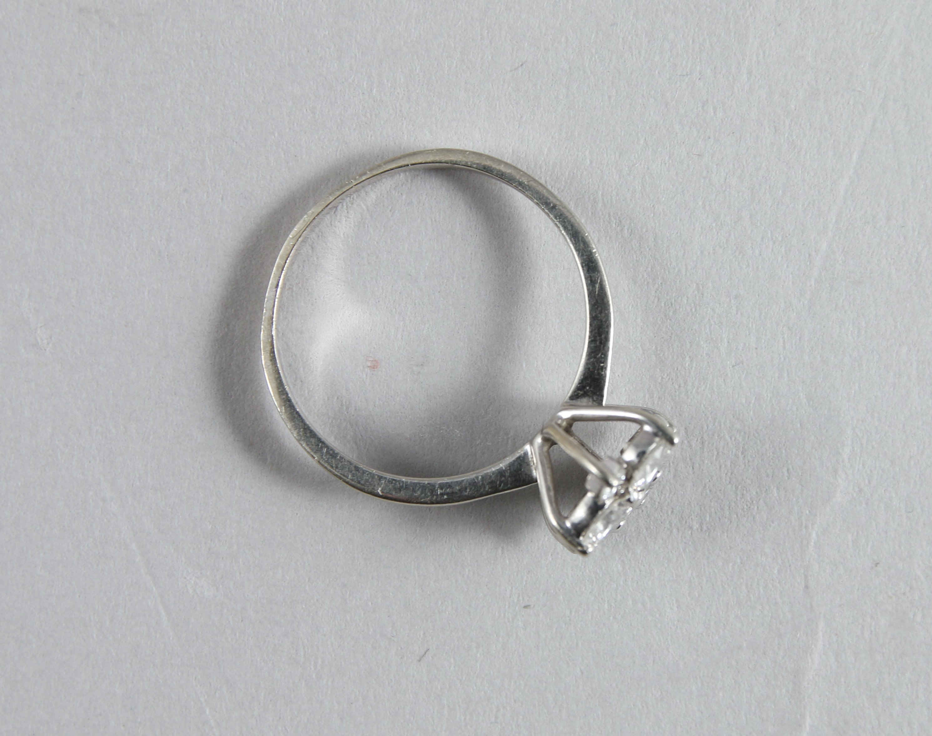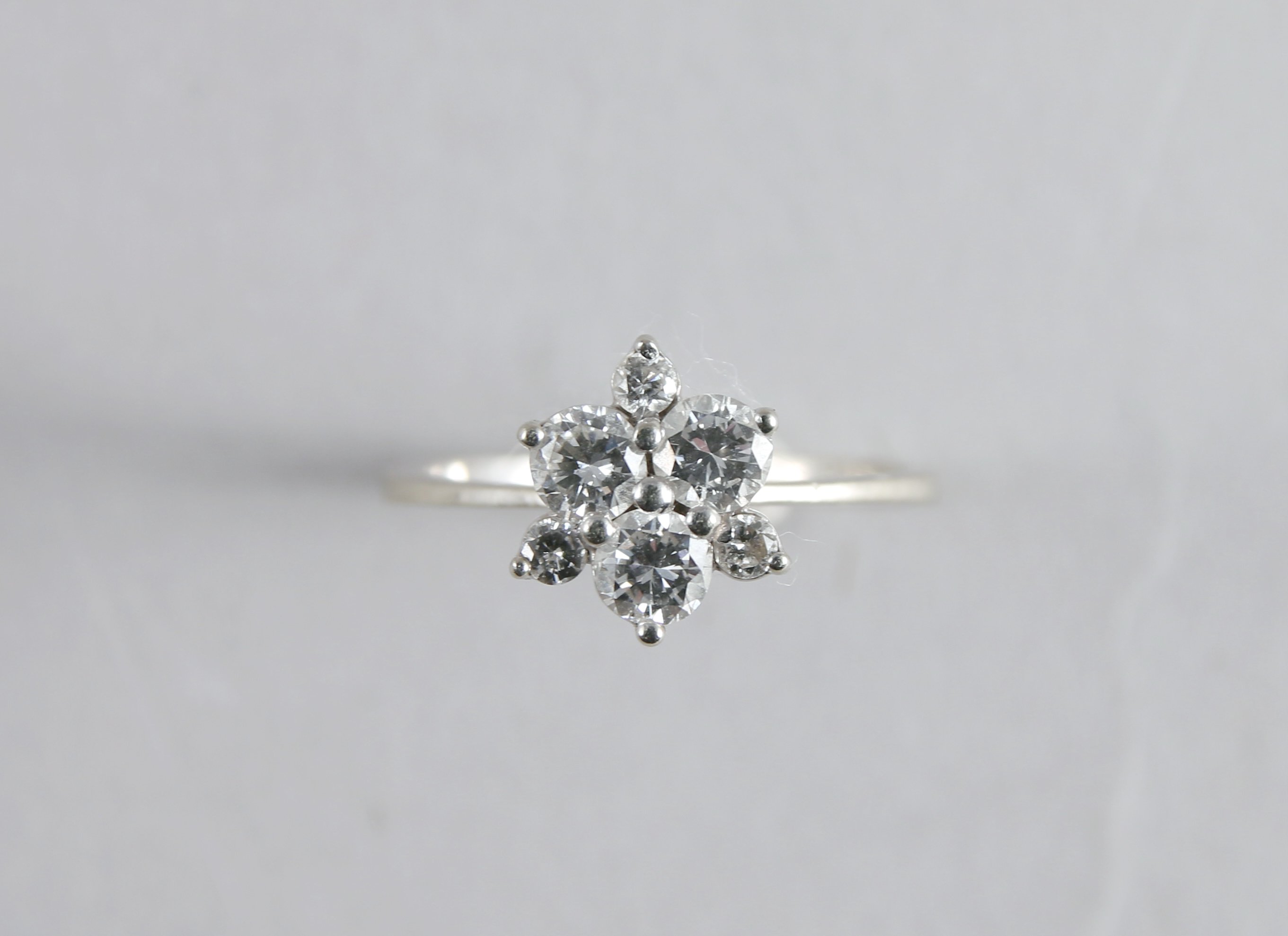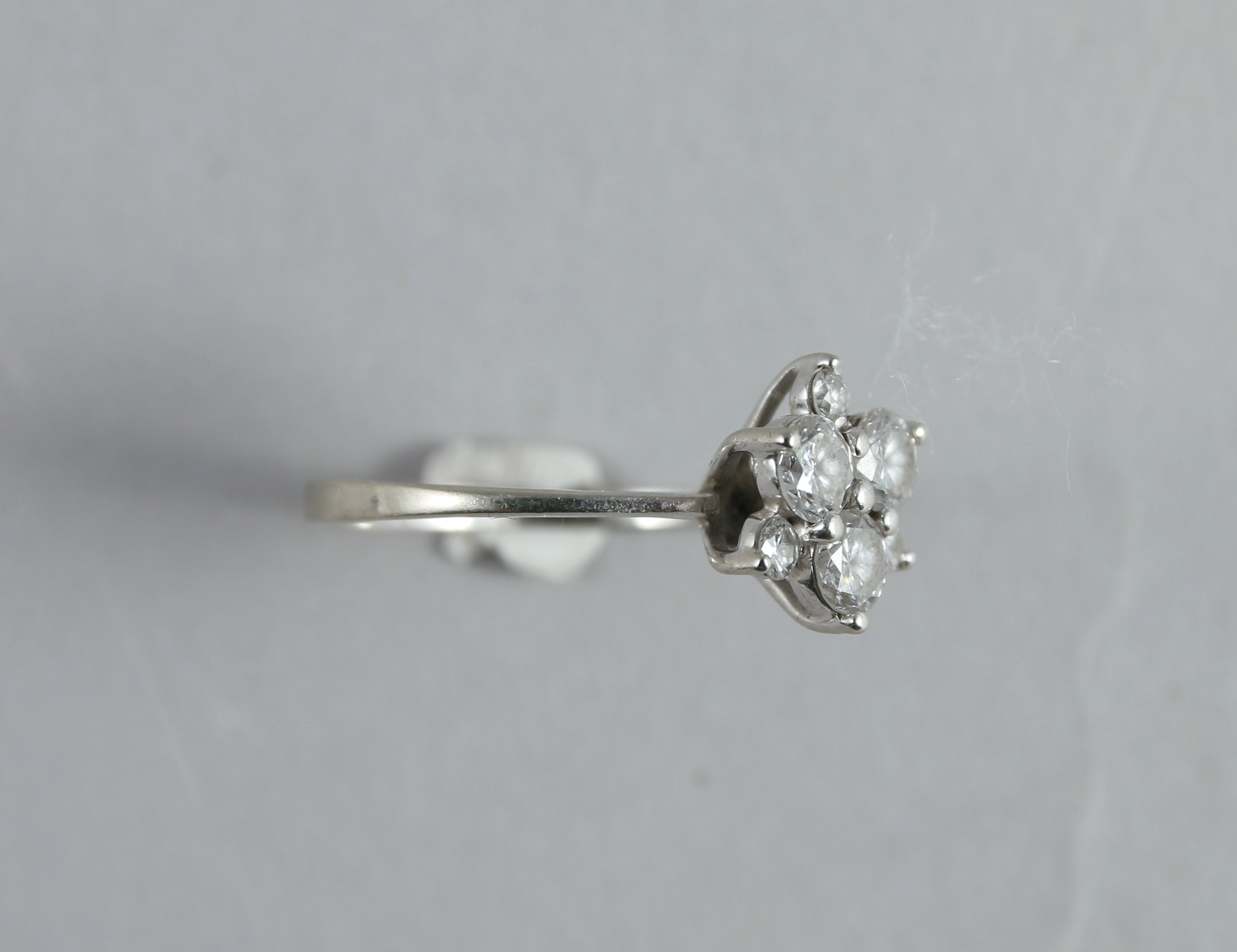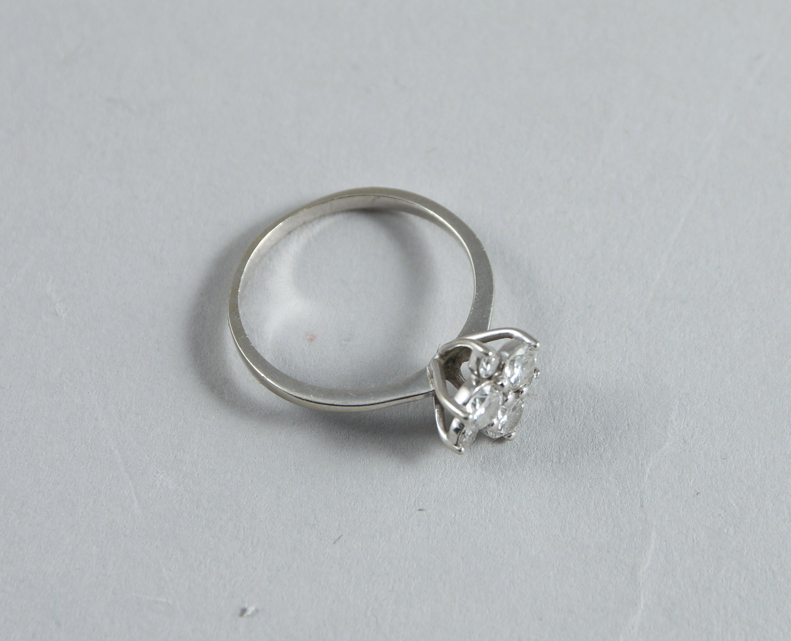 BAGUE en or blanc 750 millièmes adoptant la forme d'une fleurette. Elle sertie de SIX DIAMANTS taille brillant, dont trois plus importants, pour un poids total d'environ 1,29 carat.