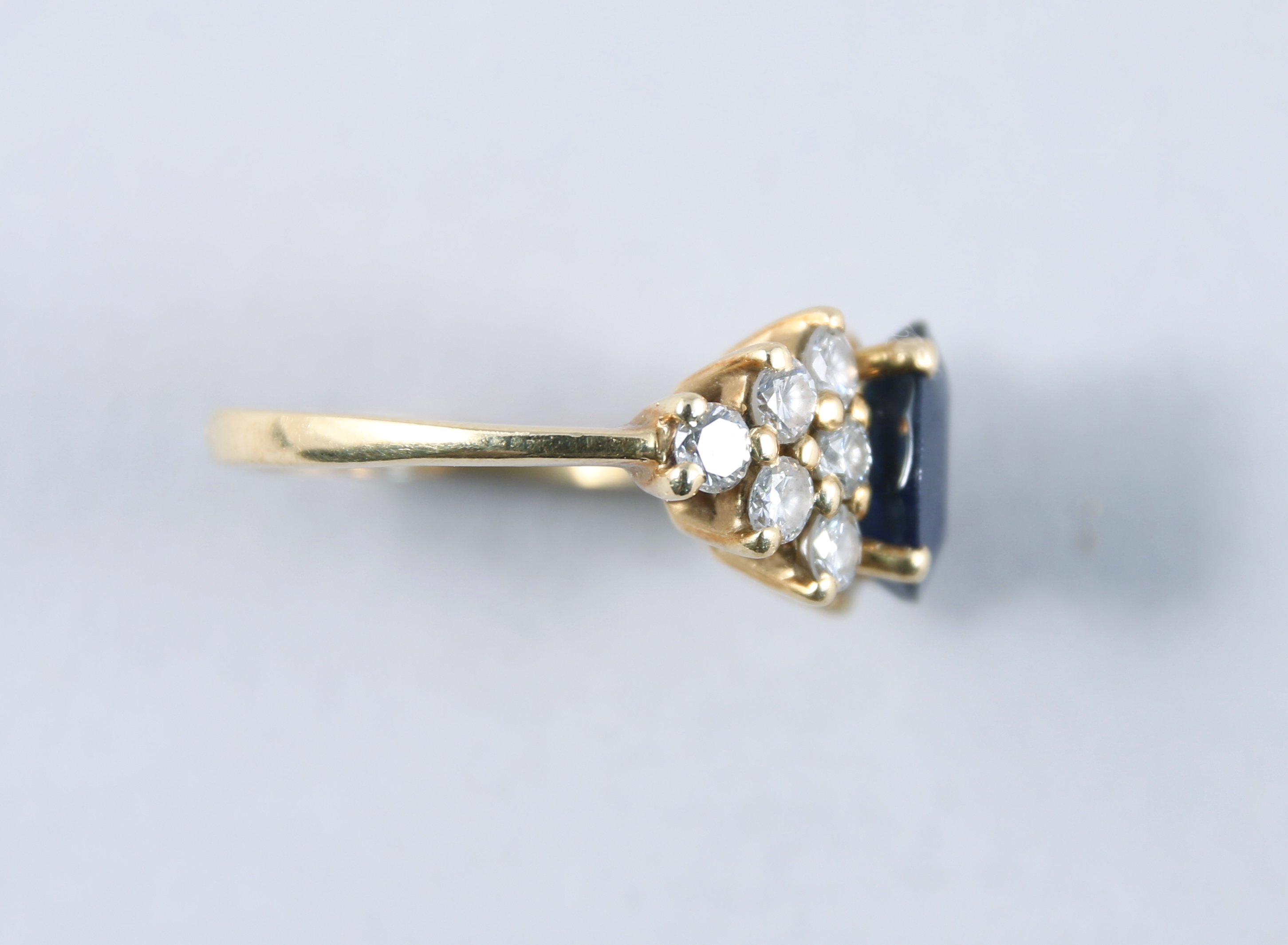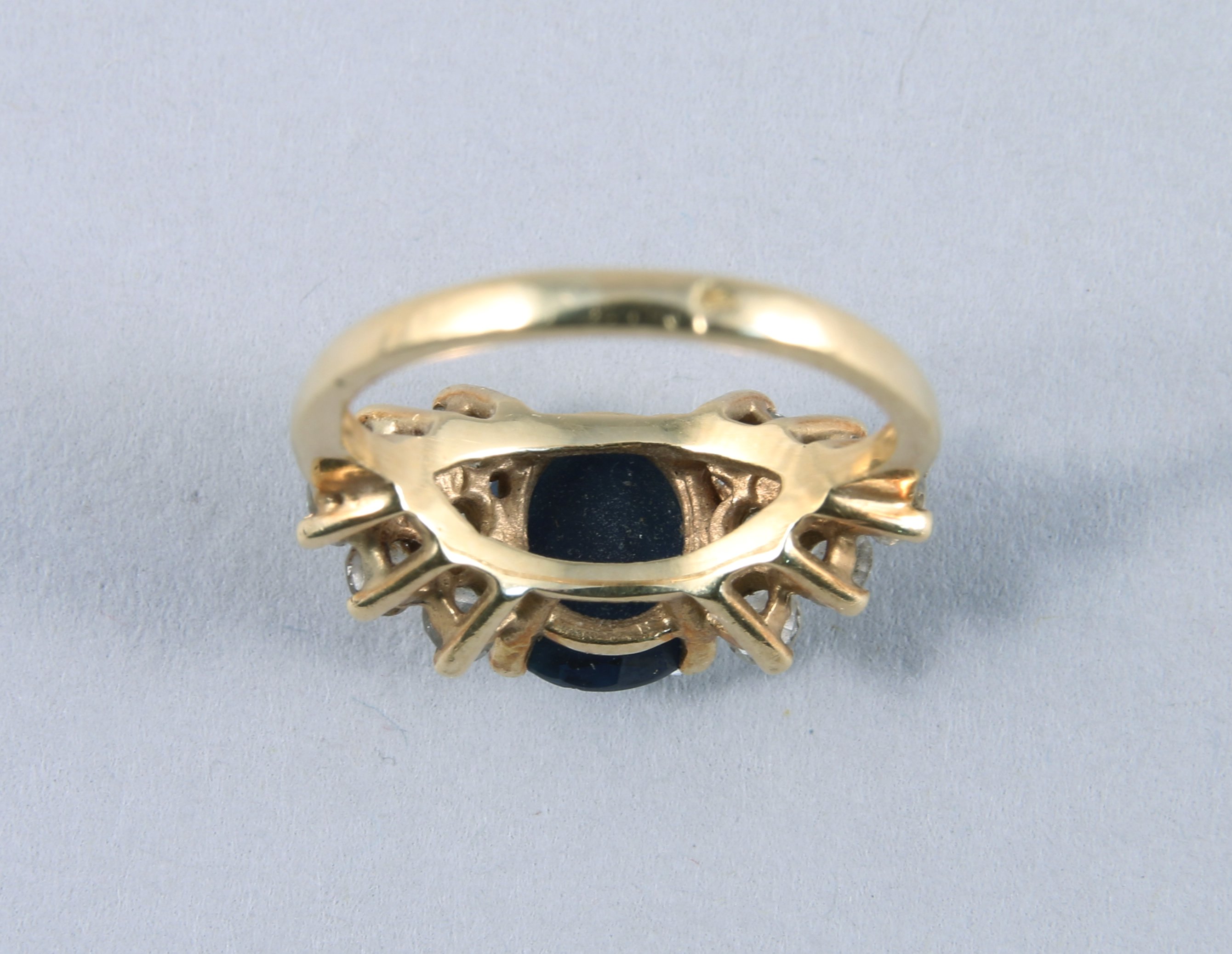 BAGUE en or jaune 750 millièmes centrée d'un SAPHIRE taille ovale épaulé de 12 DIAMANTS disposés en triangle.
