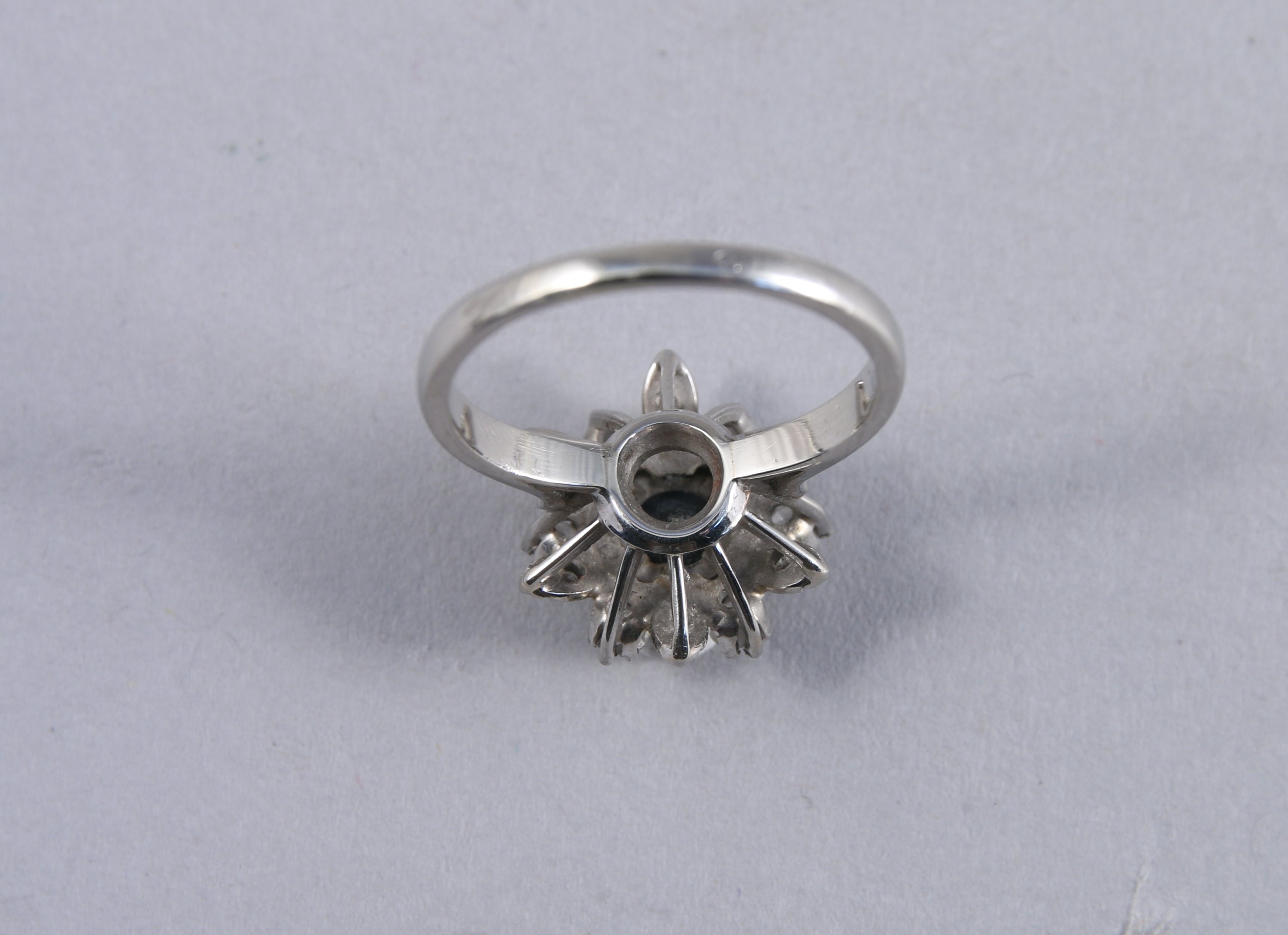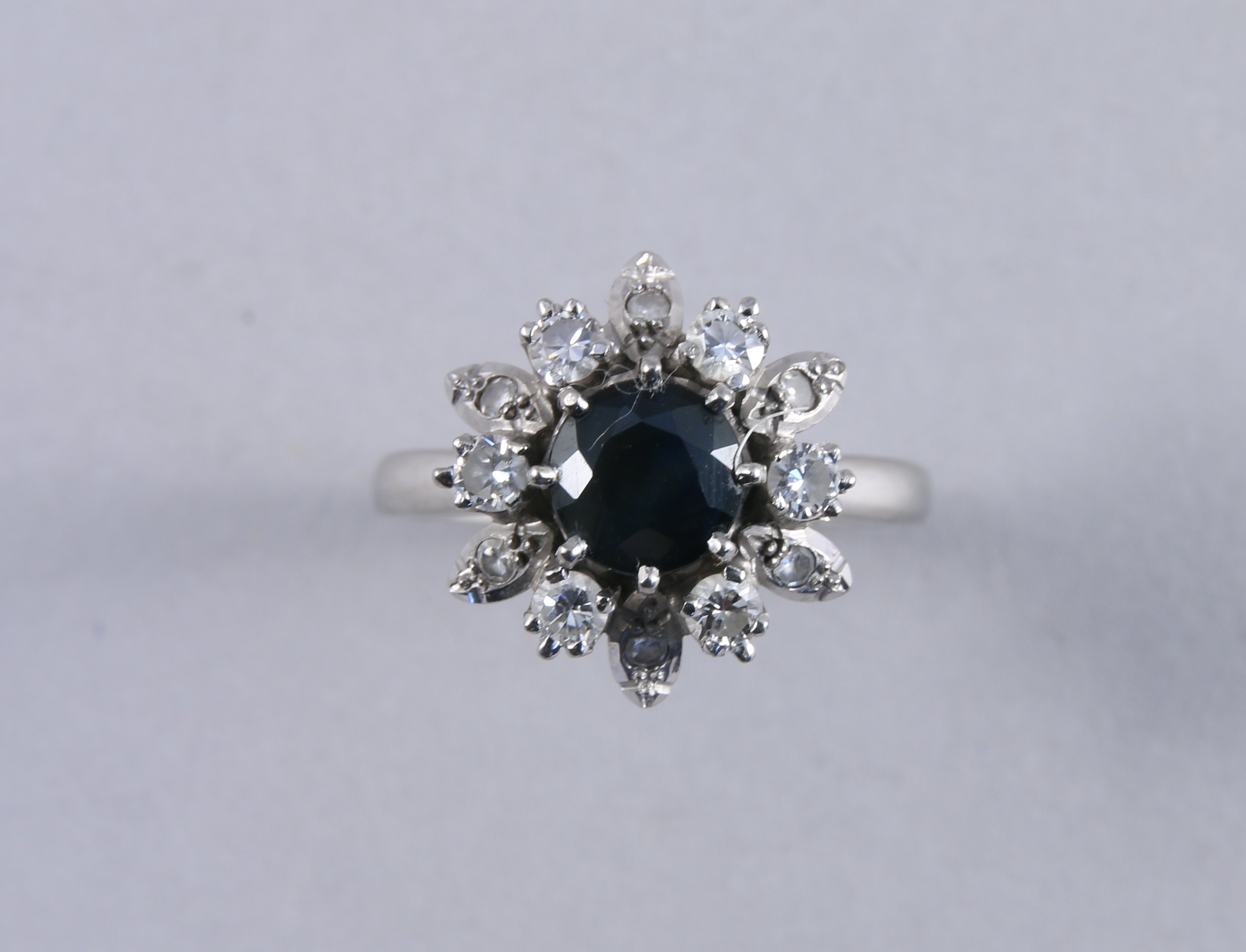 BAGUE en or gris 750 millièmes, ornée d'un SAPHIR dans un entourage de diamants ronds de taille brillant et taillés en huit-huit.