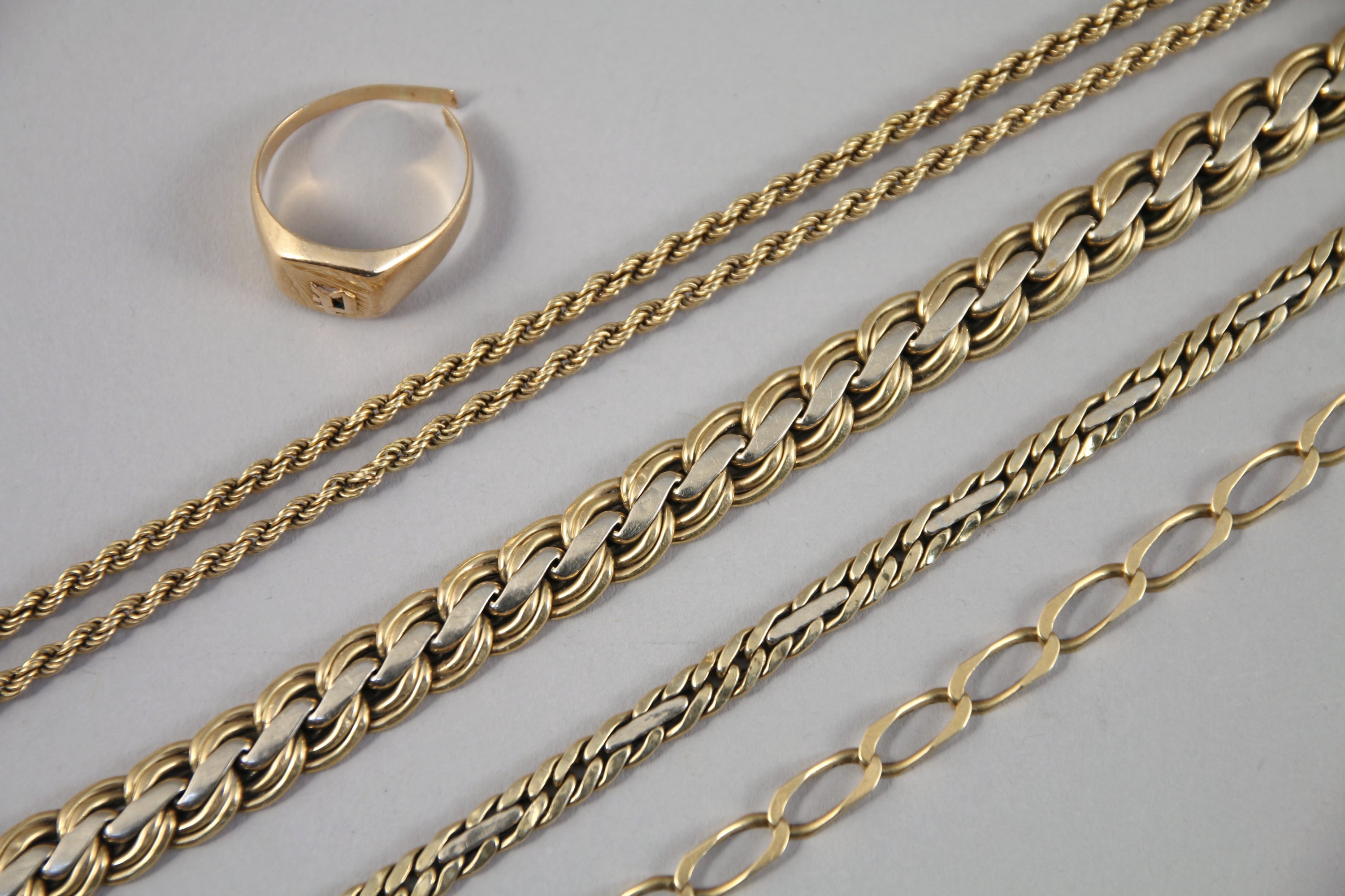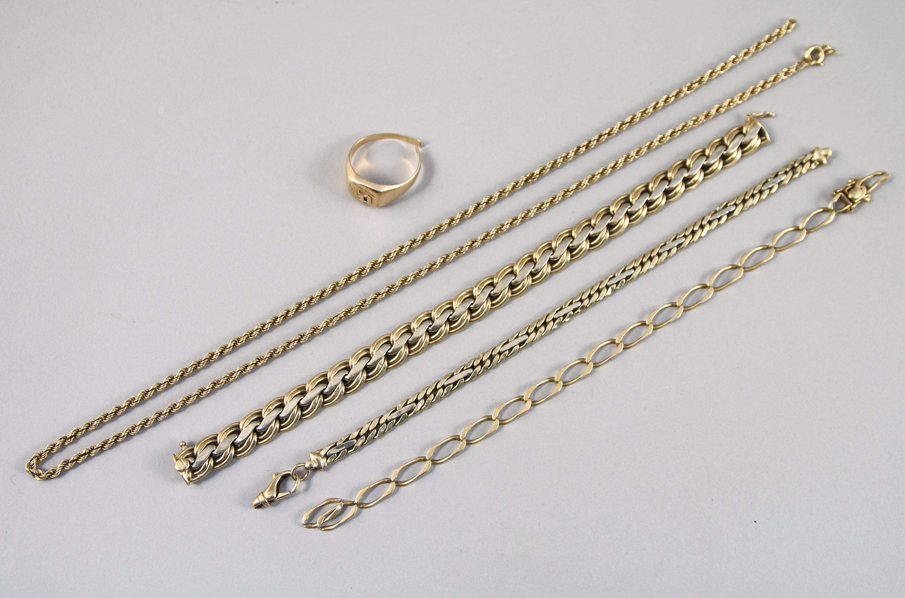 OR 750 millièmes À LA CASSE : TROIS BRACELETS, une CHAÎNE et une CHEVALIÈRE.