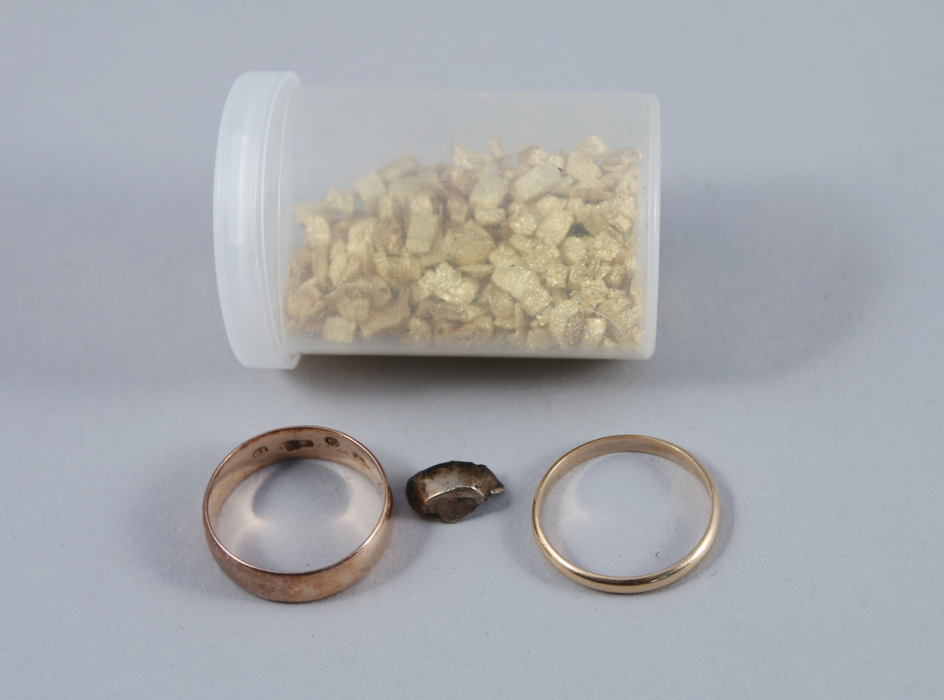 OR À LA CASSE : DEUX alliances, débris dentaire et feuilles d'or.