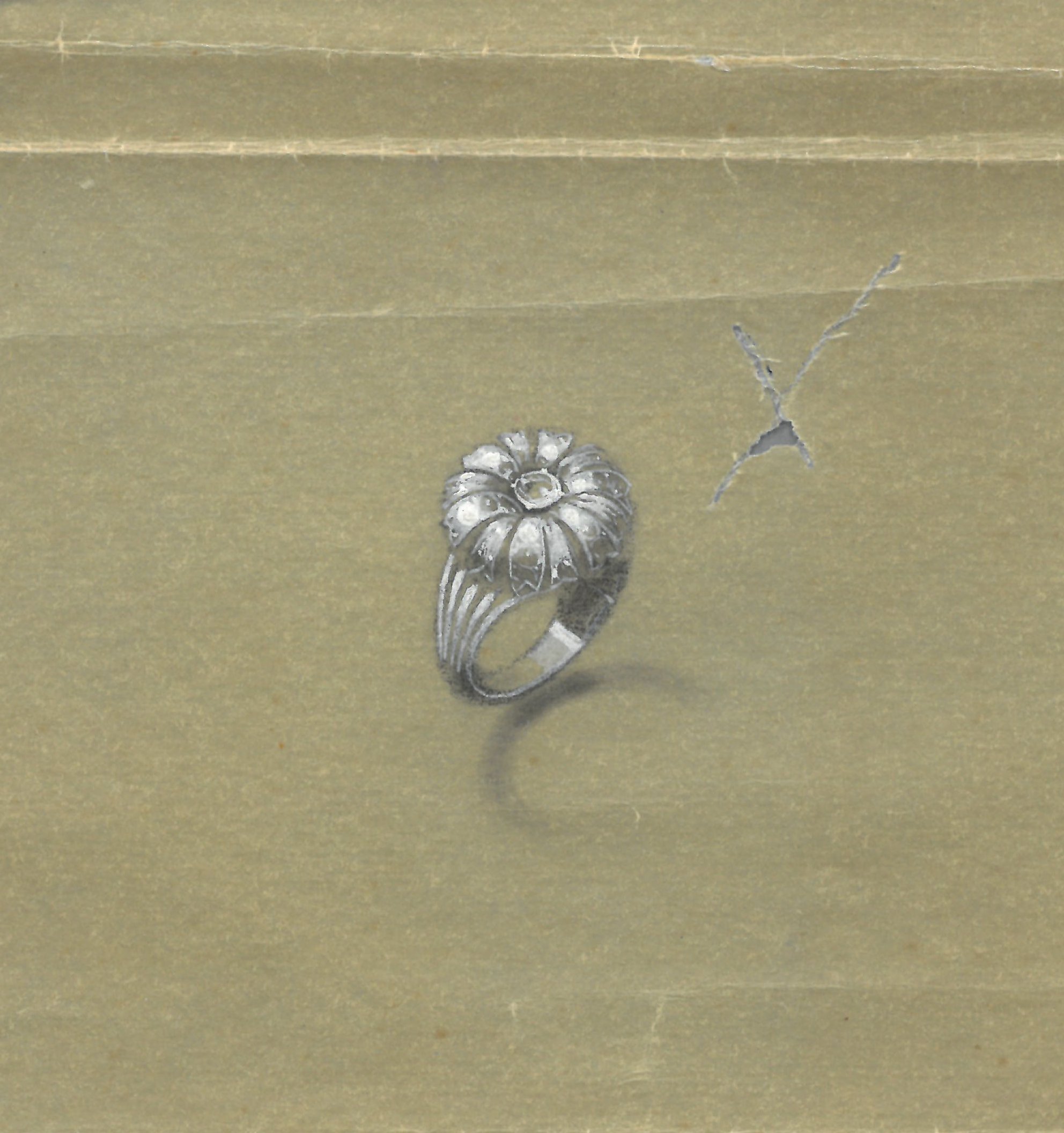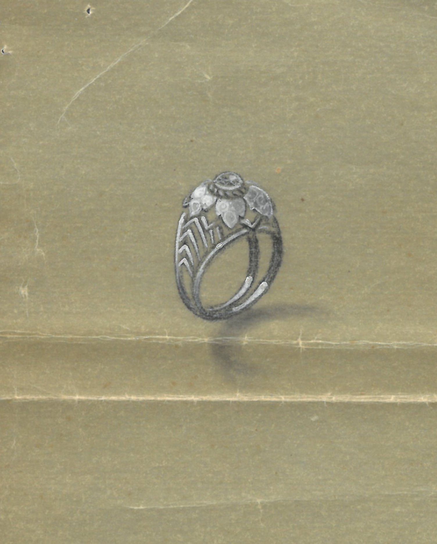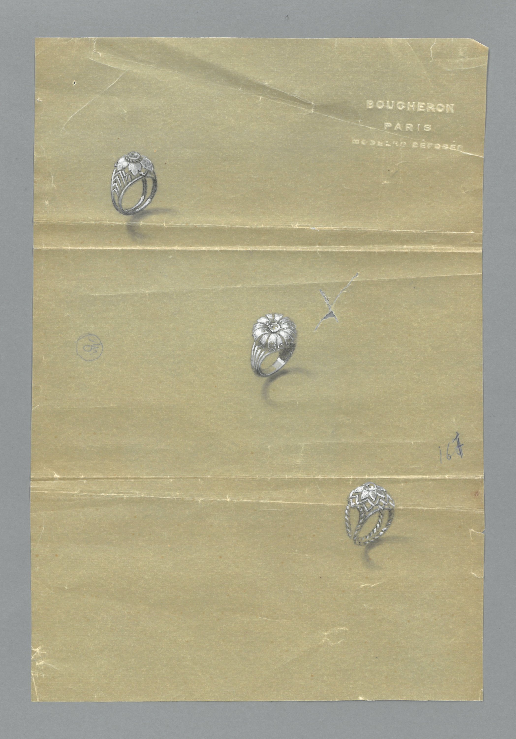 - TROIS BAGUES, or blanc et diamants. Feuille numérotée 167. Cachet à sec "Boucheron Paris / Modèles déposés". Haut. 22,5, Larg. 15,5 cm. (pliures)