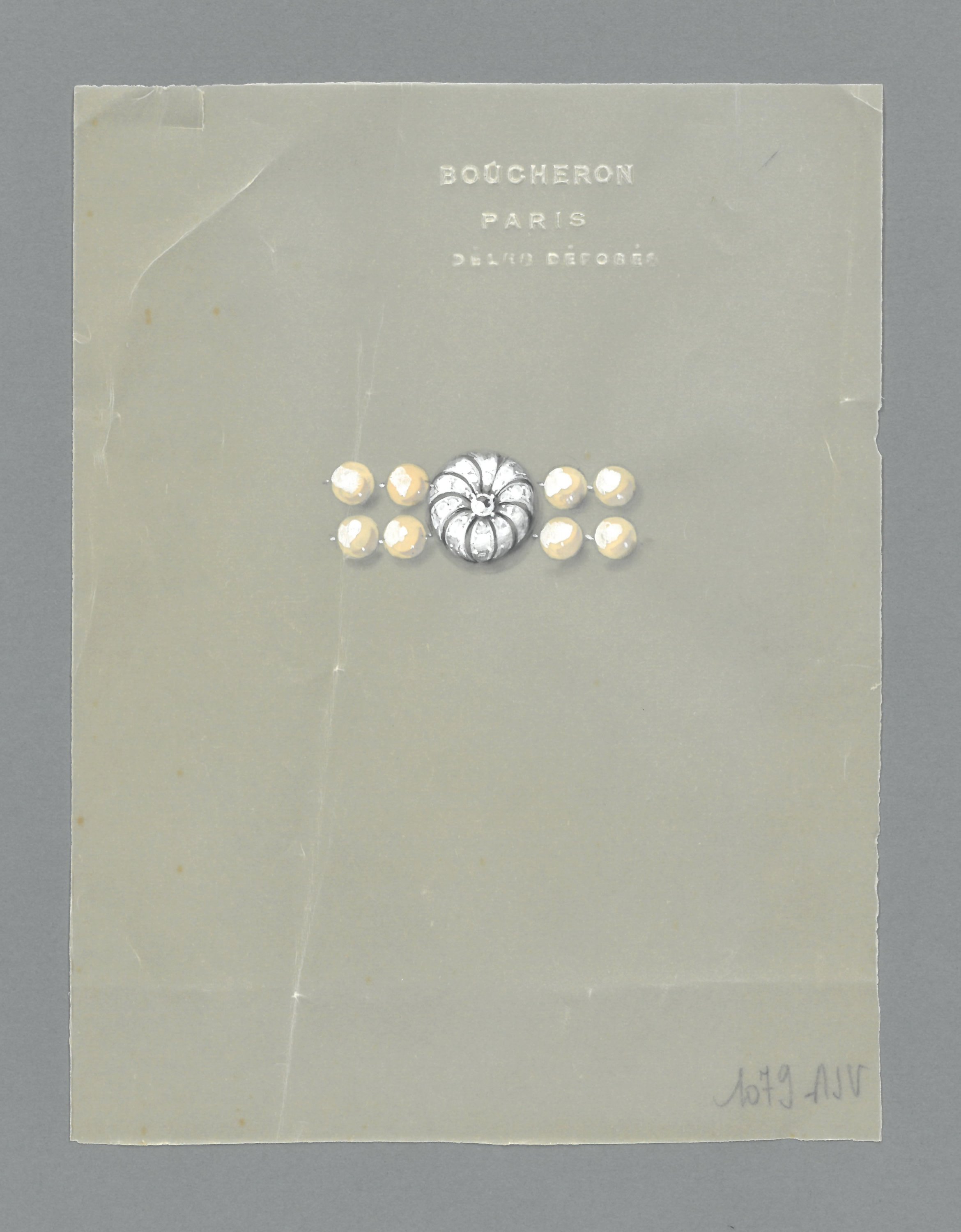 - FERMOIR, or blanc et diamants, d'un collier ou d'un bracelet à deux rangs de perles. Numéroté 1079. Monogramme manuscrit "AJV". Cachet à sec "Boucheron Paris / Modèles déposés". Haut. 16,5, Larg. 12,5 cm.