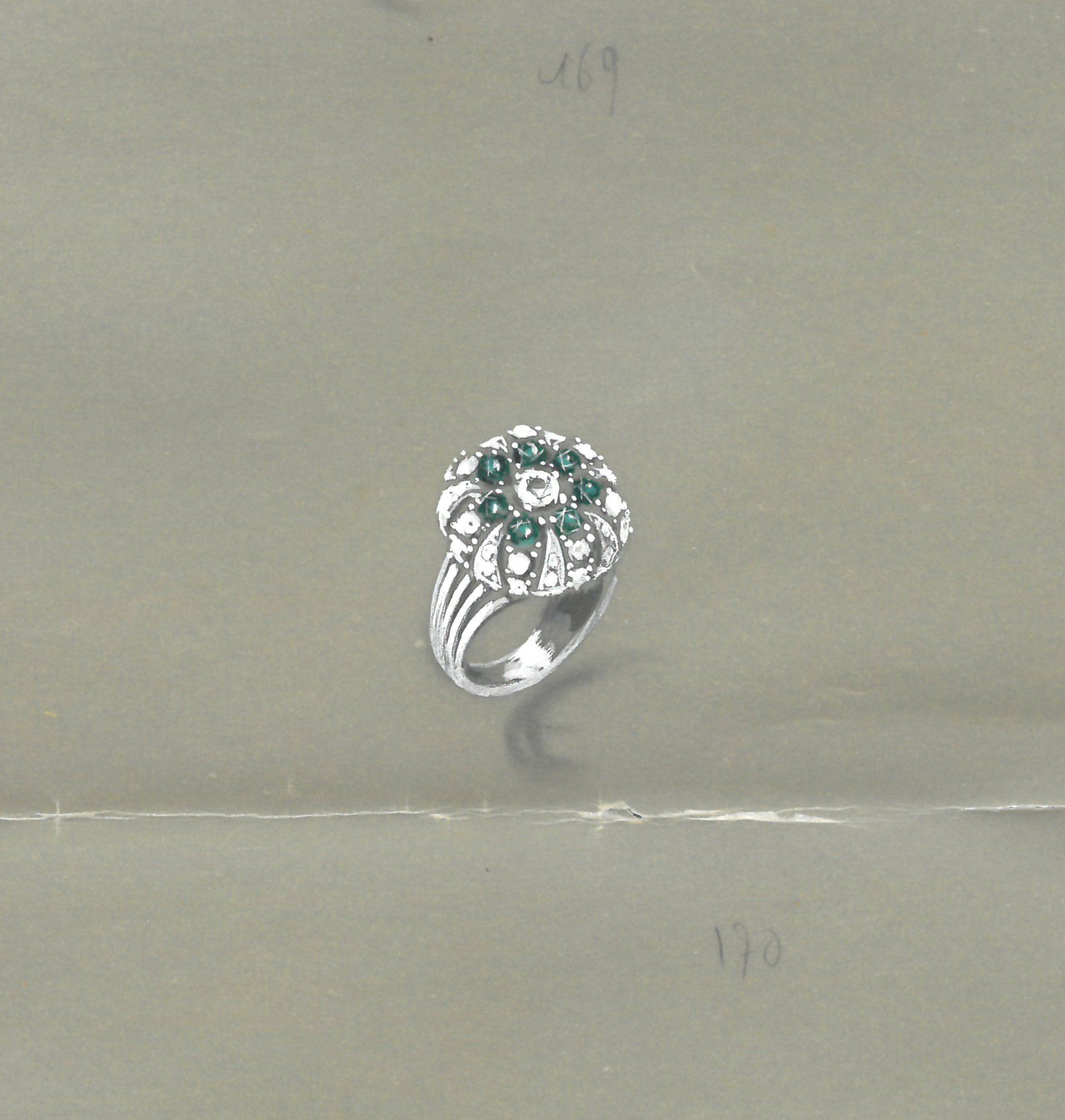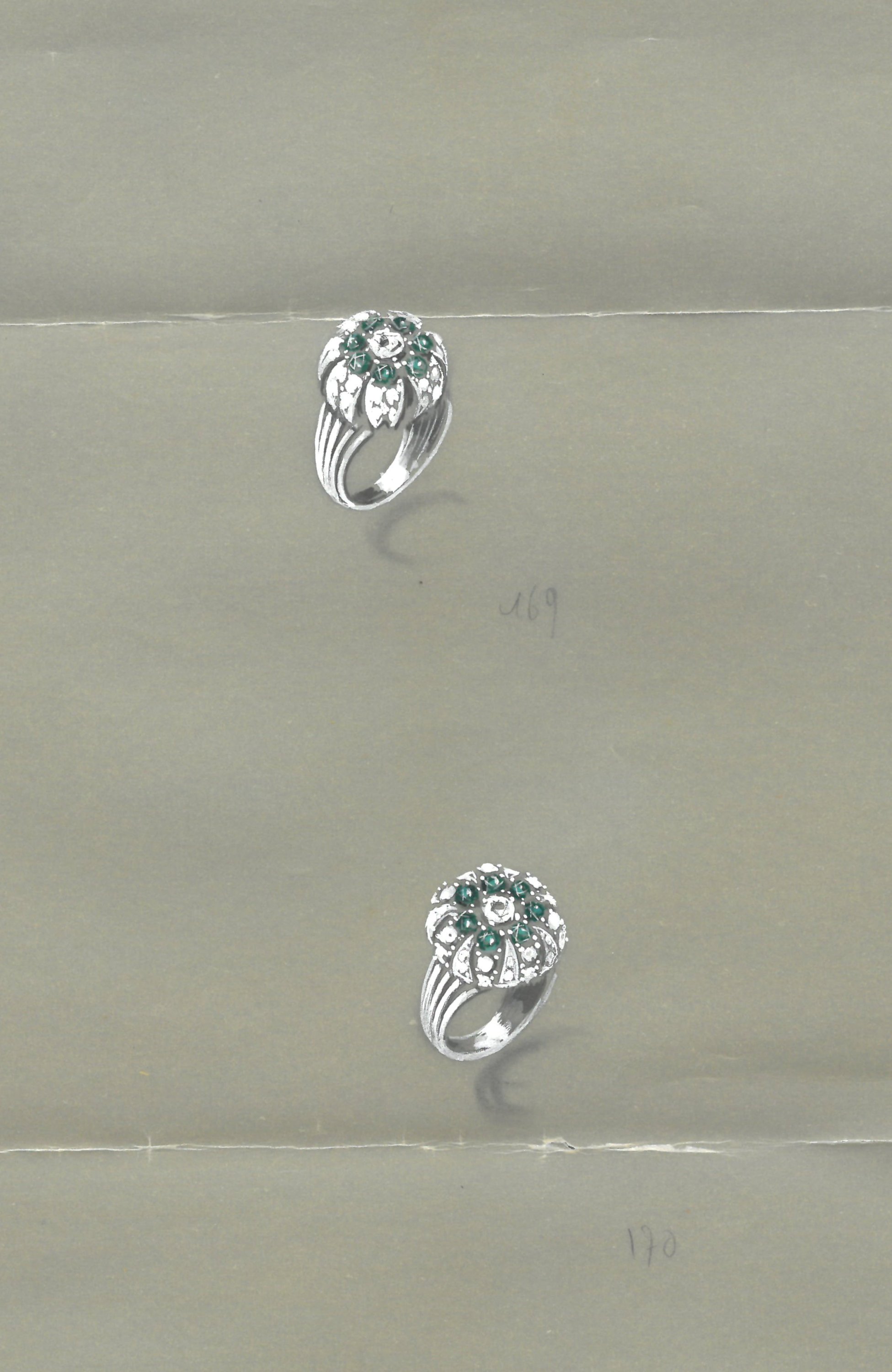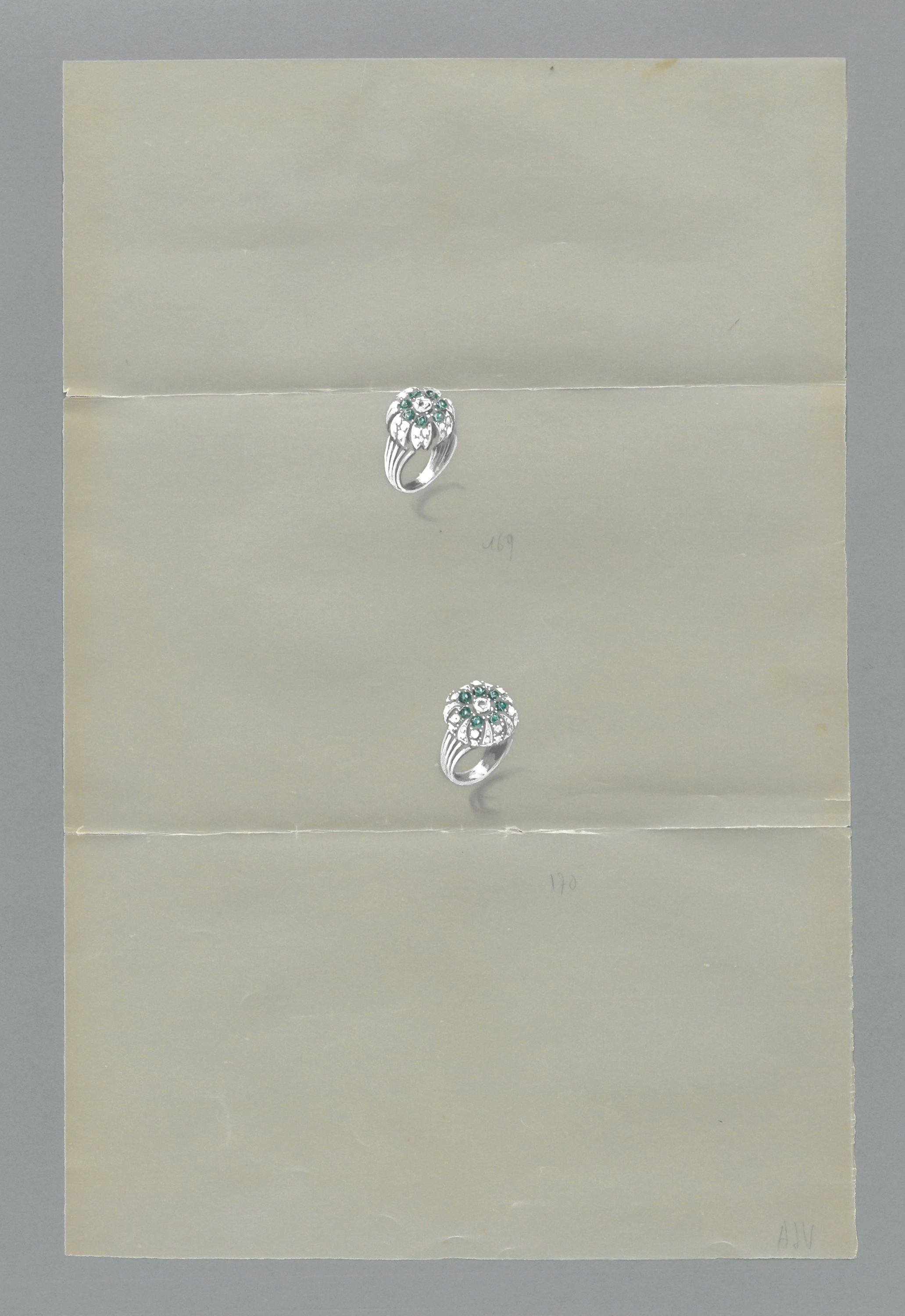 - DEUX BAGUES, or blanc, diamants et émeraudes. Numérotées 169 et 170. Monogramme manuscrit "AJV". Haut. 25, Larg. 16 cm. (pliures)
