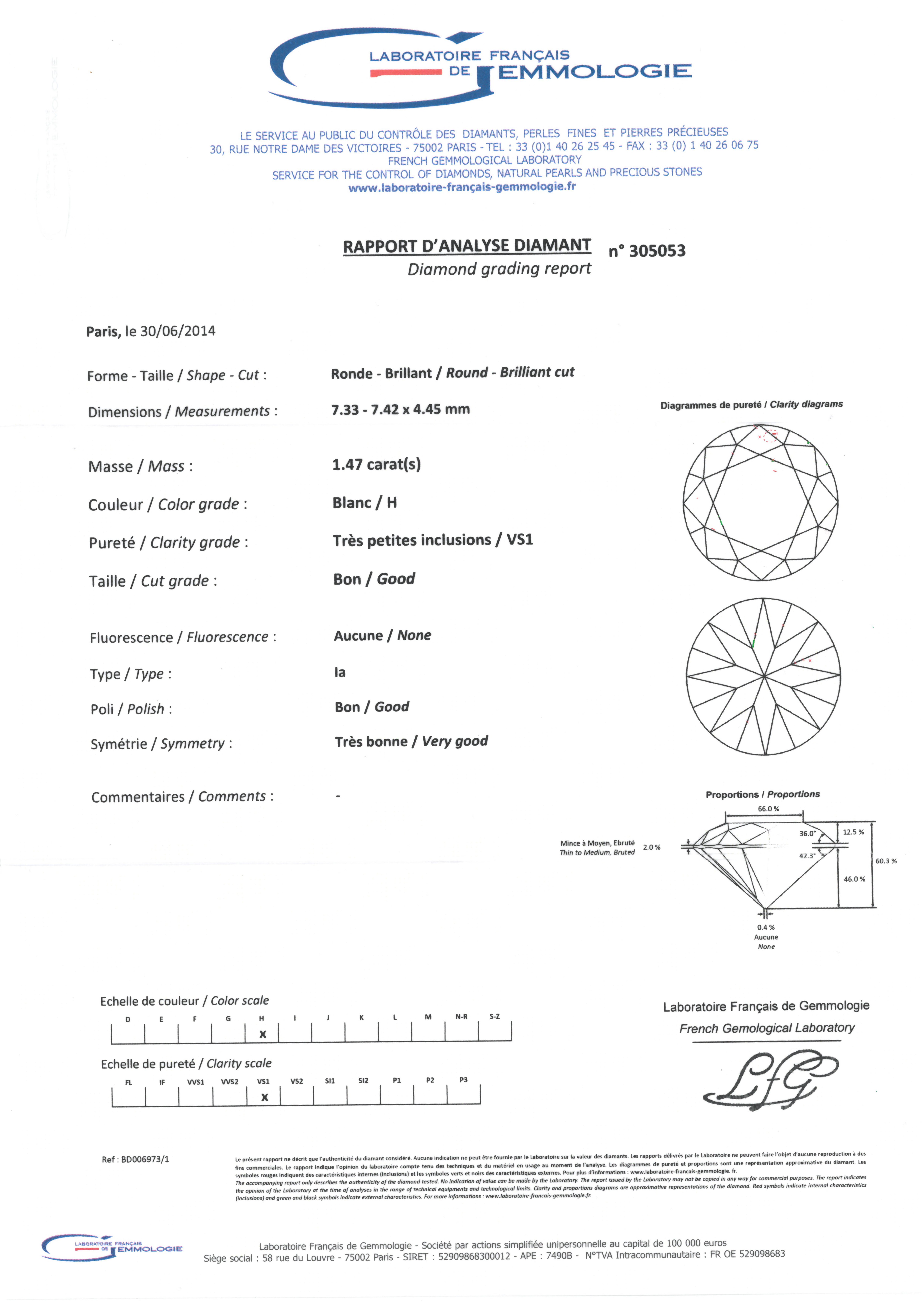 Accompagné d'un rapport d'analyse diamant du L.F.G. n°305053 du 30/06/2014 précisant :