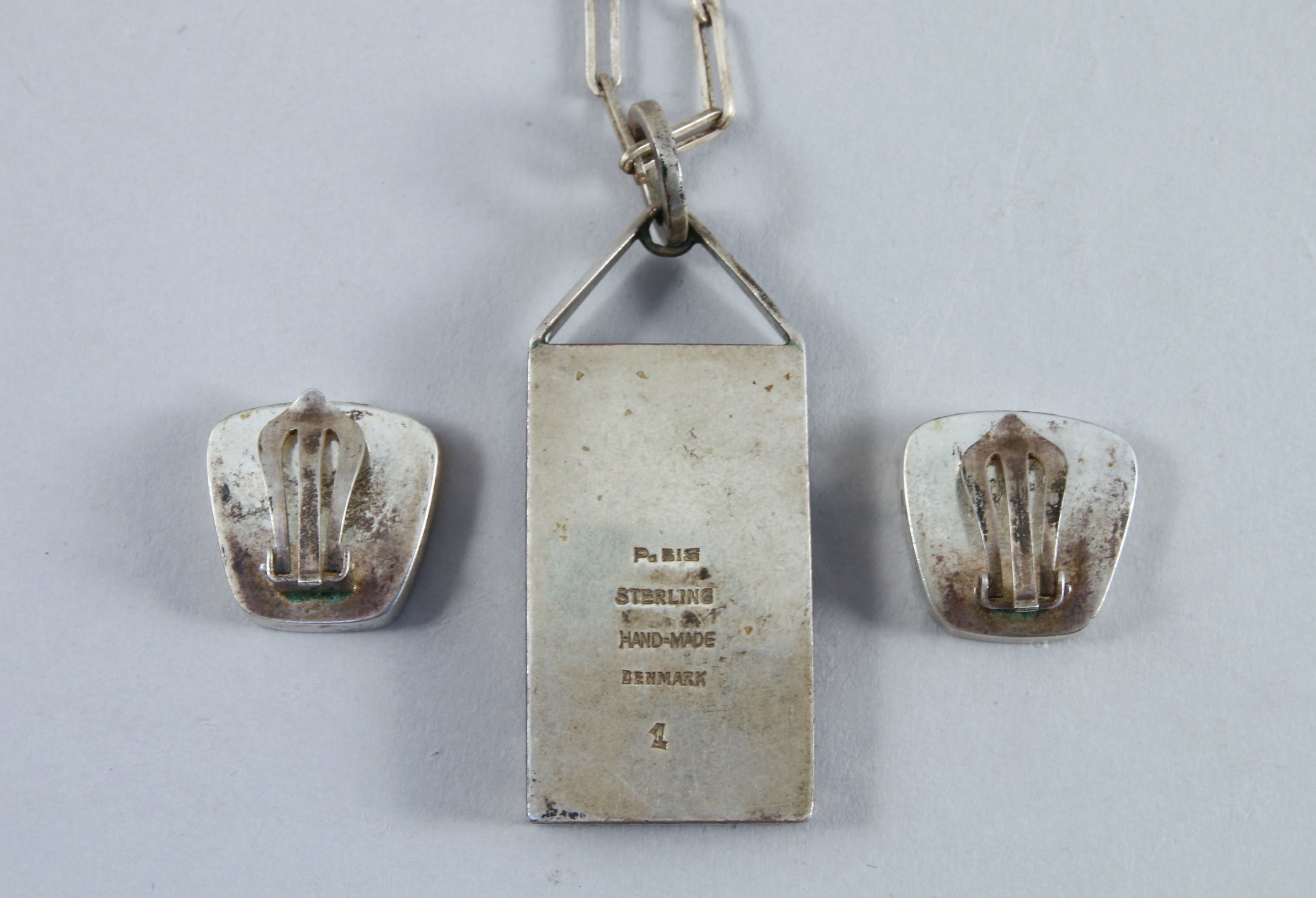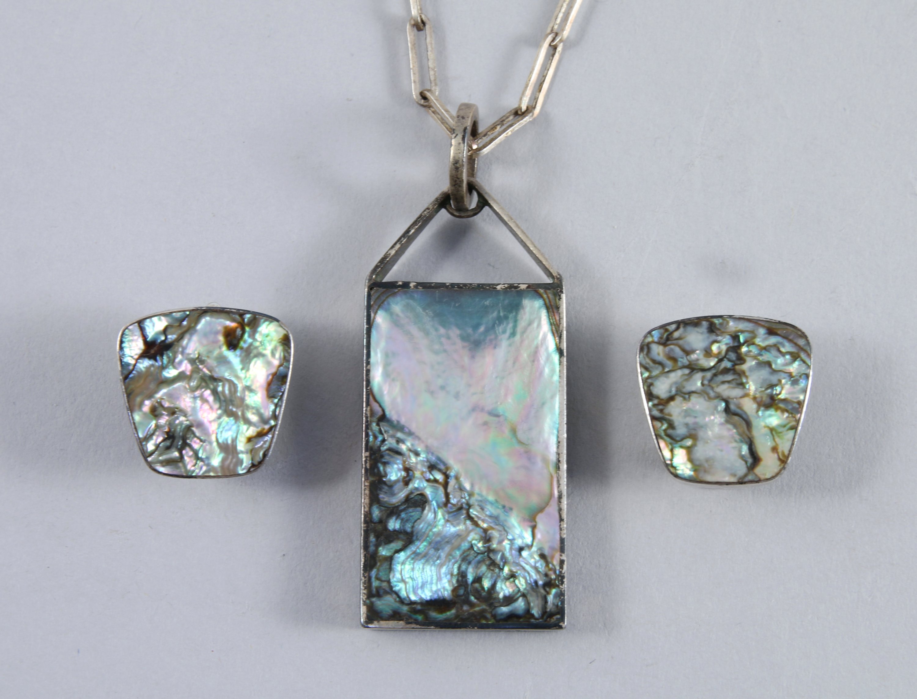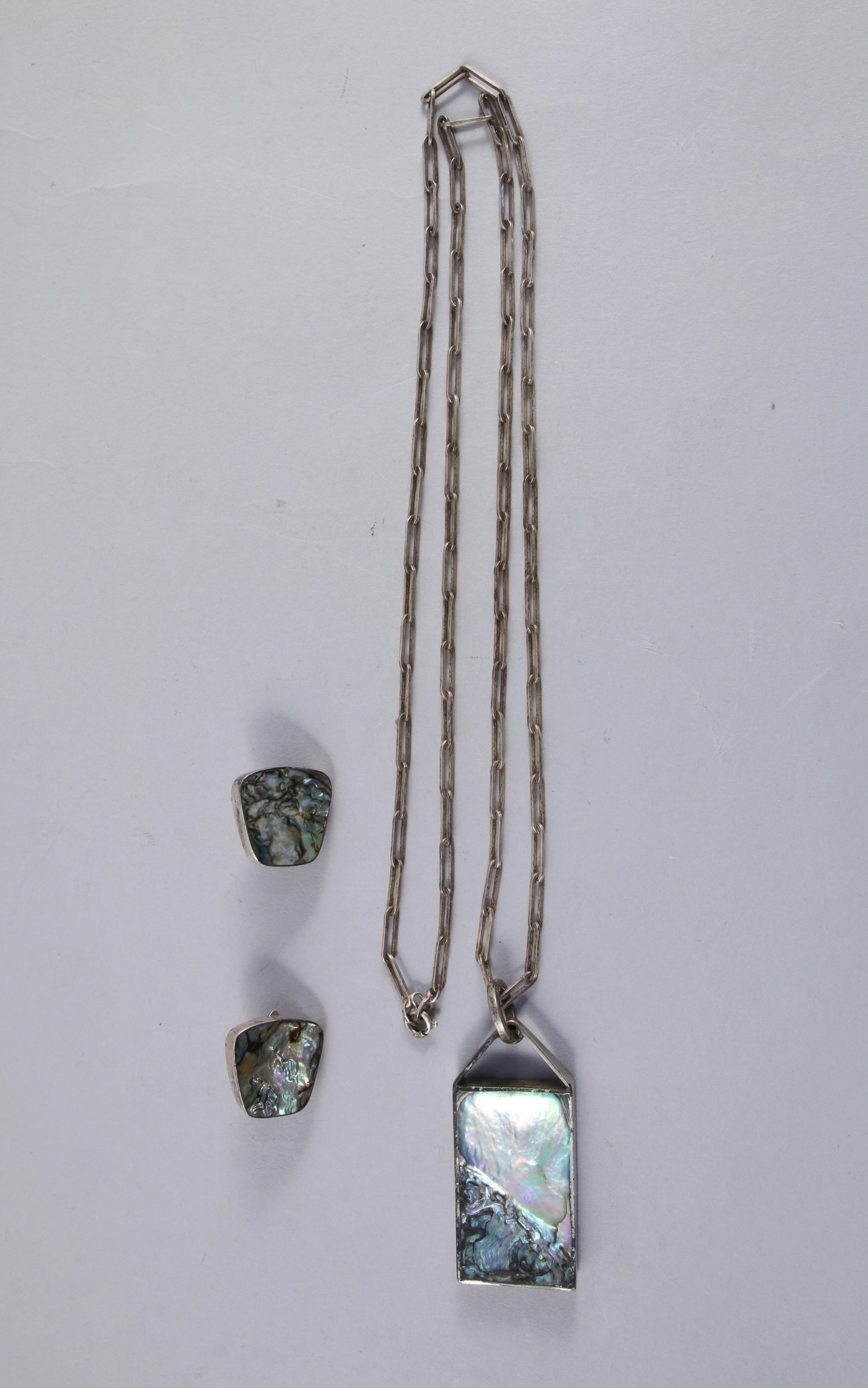 Georg JENSEN (1866-1935). PENDENTIF rectangulaire, sa CHAÎNE et une PAIRE de BOUCLES d'OREILLES en argent et nacre marqué "P.BIS Sterling Hand-mlade Denmark 1", dans une boite "Georg Jensen orfèvre à la Boutique Danoise".