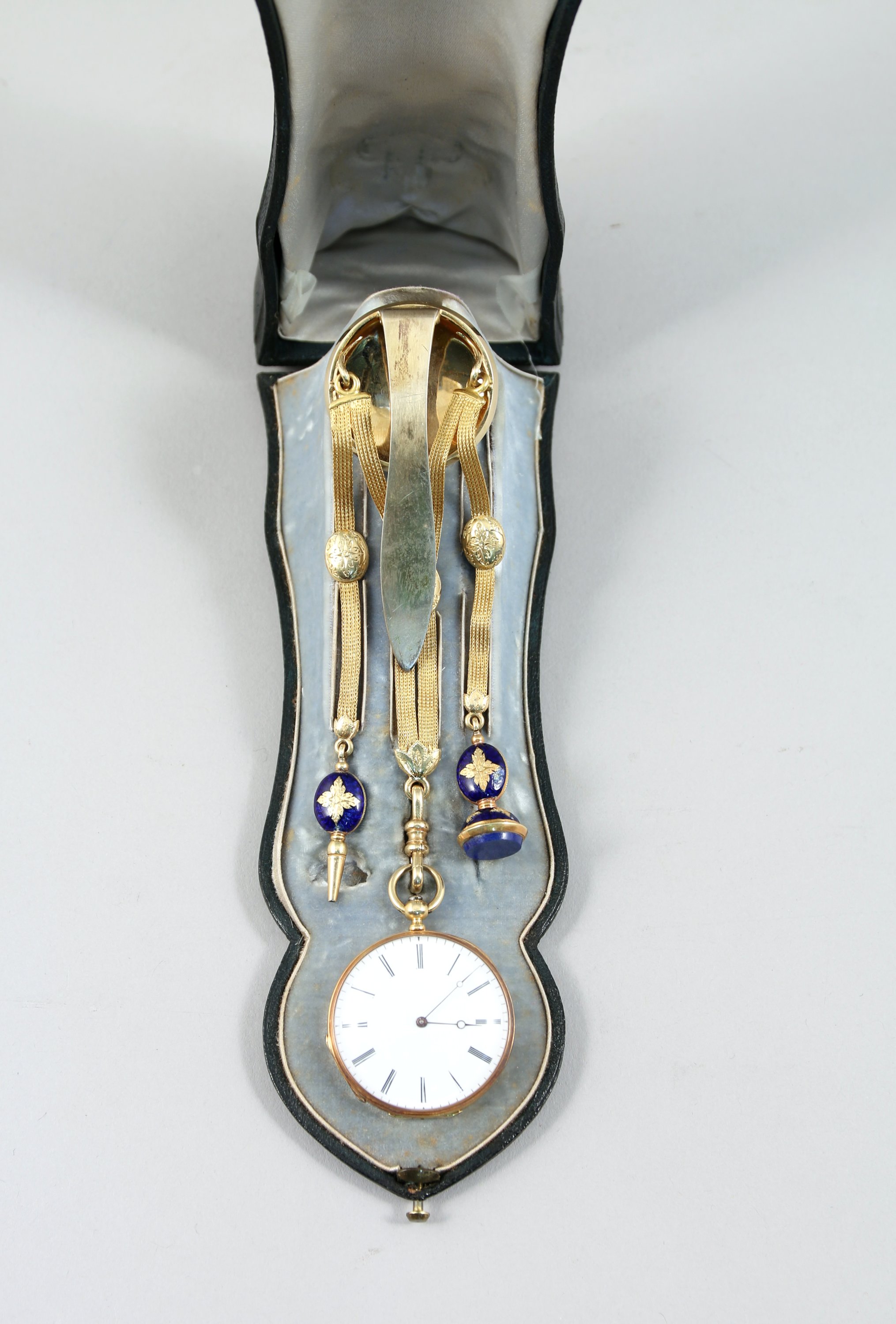 MONTRE et sa CHATELAINE en or jaune émaillé bleu nuit. Sceau en lapis lazuli. Boîtier en or, cadran émaillé blanc, les heures indexées en chiffres romains, les secondes par des bâtonnets.