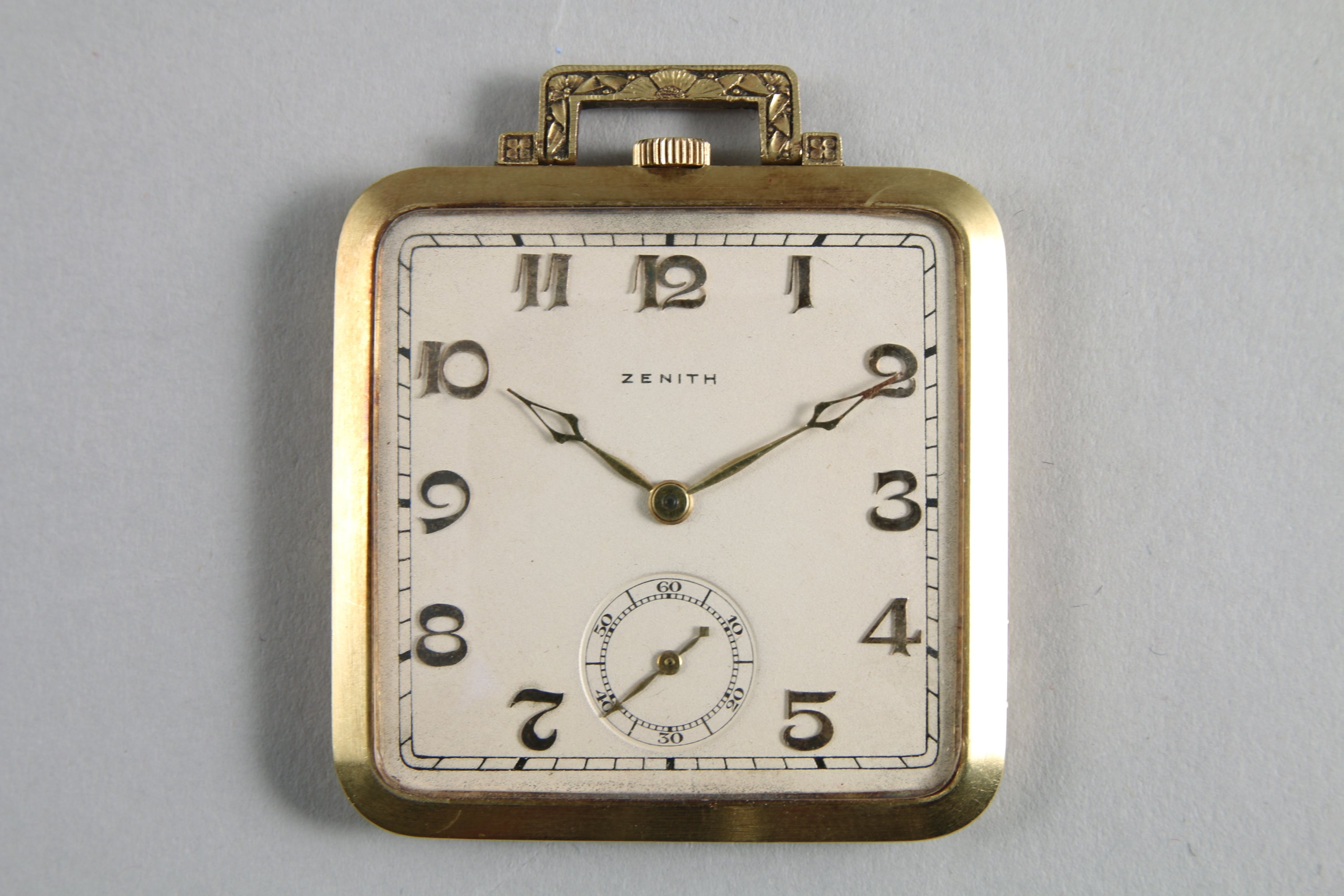 ZENITH. MONTRE DE GOUSSET en or jaune 750 millièmes à remontoir au pendant. Boîtier de forme carrée, le dos en partie ciselé de feuillages stylisés en rappel sur la bélière. Cadran à fond crème indiquant les heures en chiffres arabes. Cadran secondaire pour les secondes. Mouvement numéroté 12908, boîtier numéroté 10181.