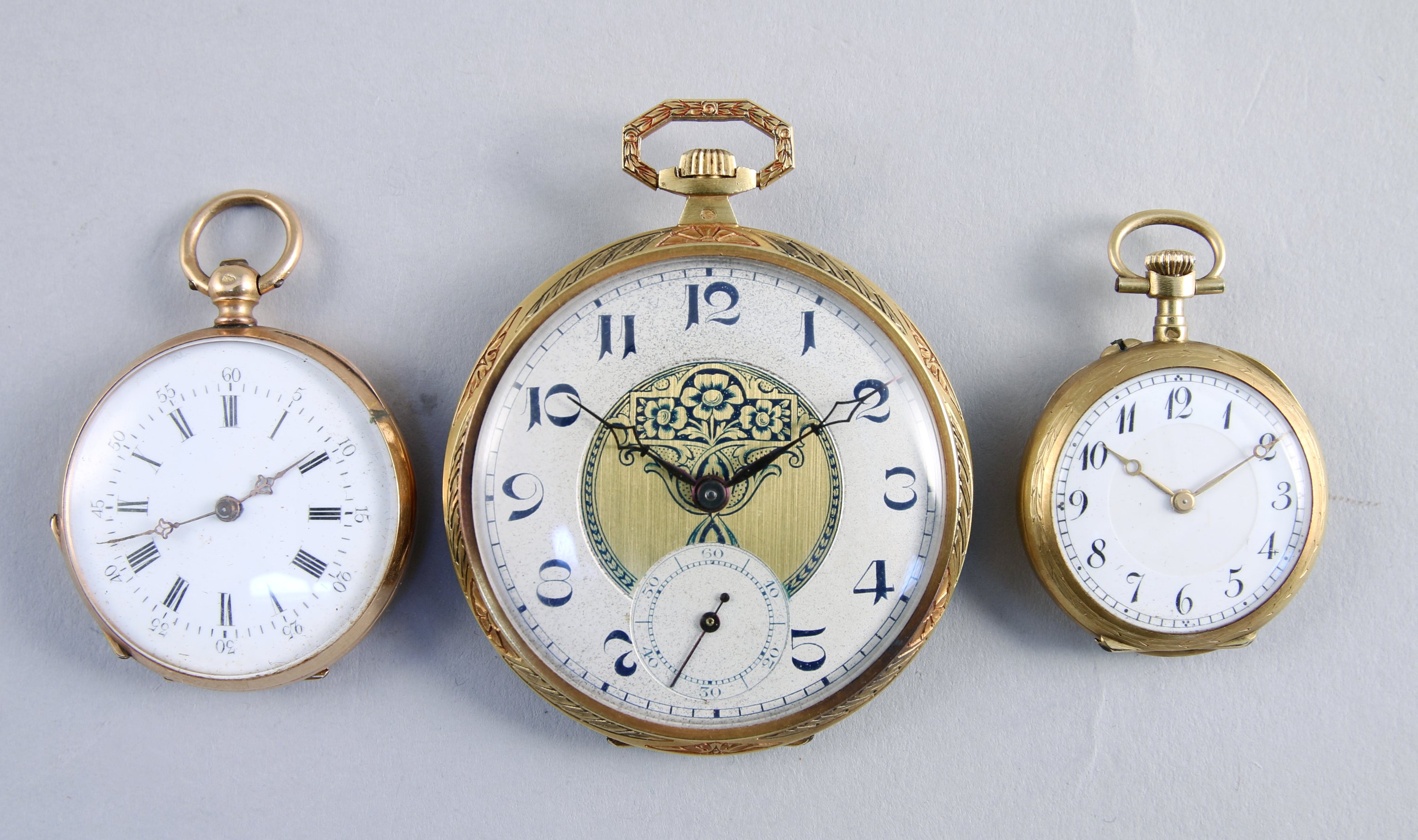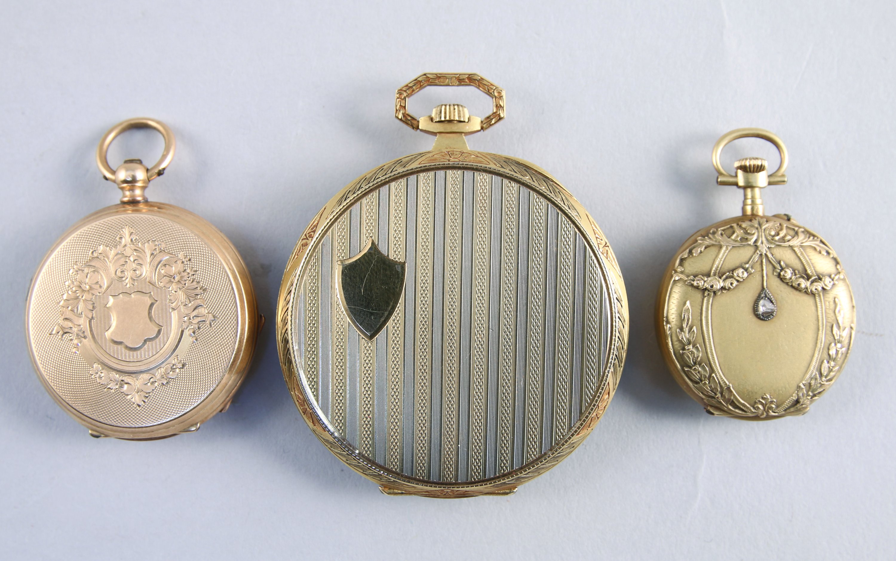 - MONTRE DE GOUSSET à remontoir au pendant. Le dos en or de deux tons à décor ciselé. Diam. 4,5 cm. Poids brut : 51 g (sans le cache-poussière en cuivre).