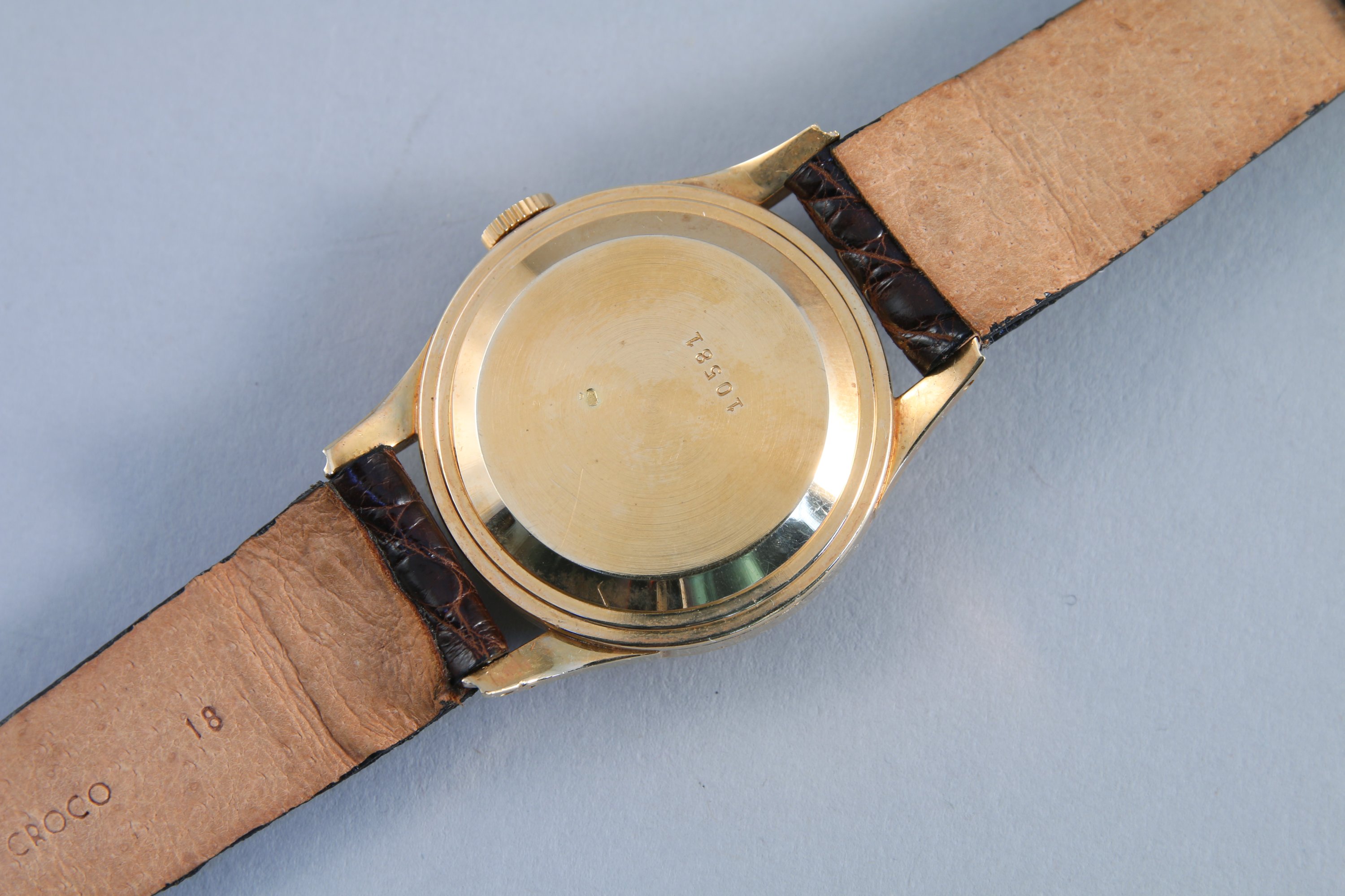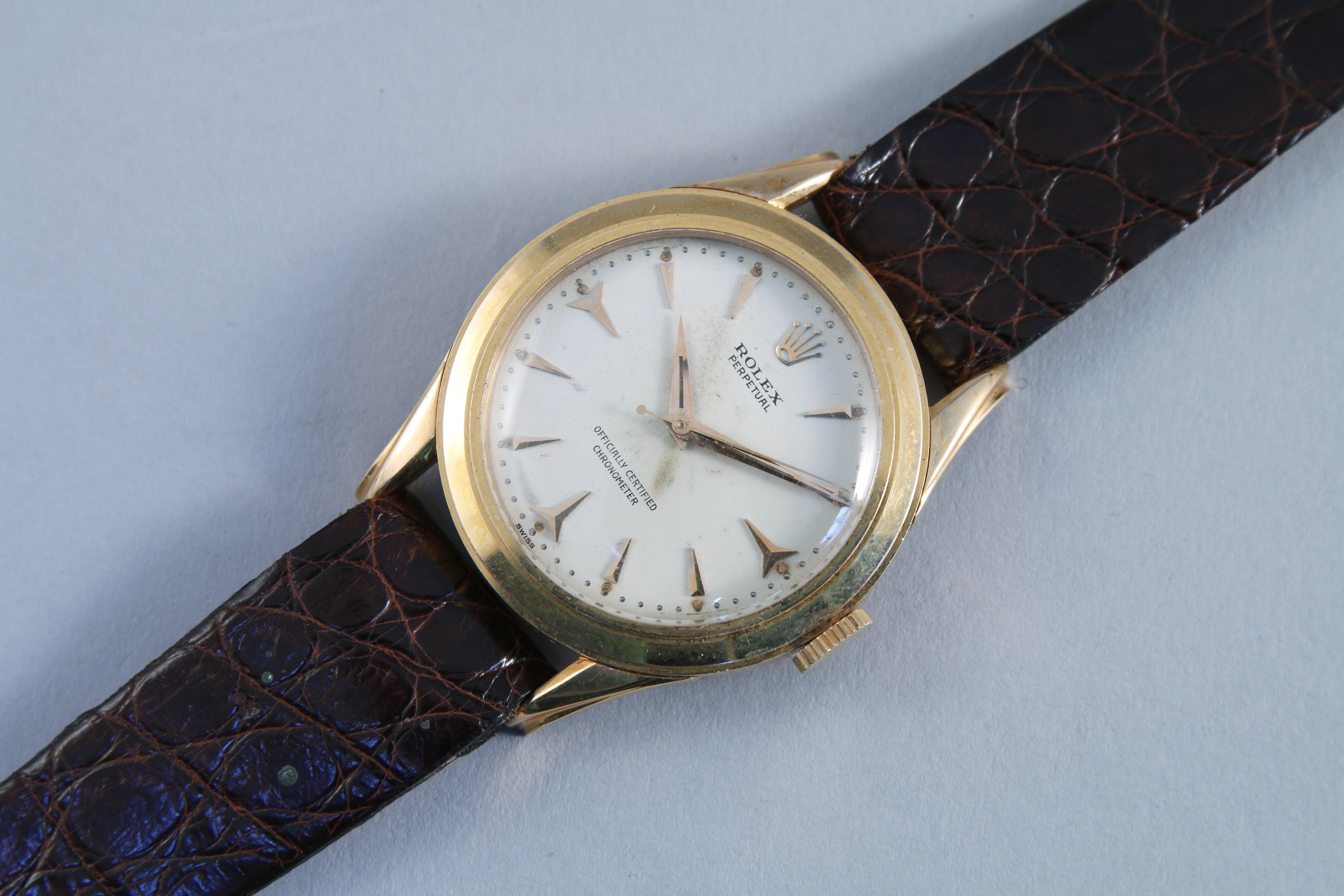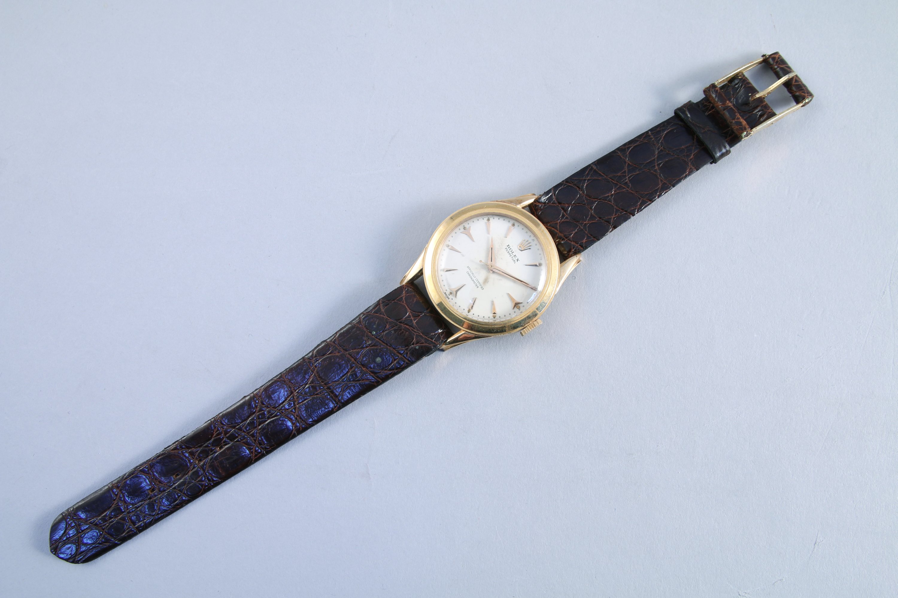 ROLEX. MONTRE-BRACELET d'homme en or jaune 750 millièmes. Cadran à fond crème (tache) indiquant les heures par des index bâtonnets. Boîtier numéroté 10581.