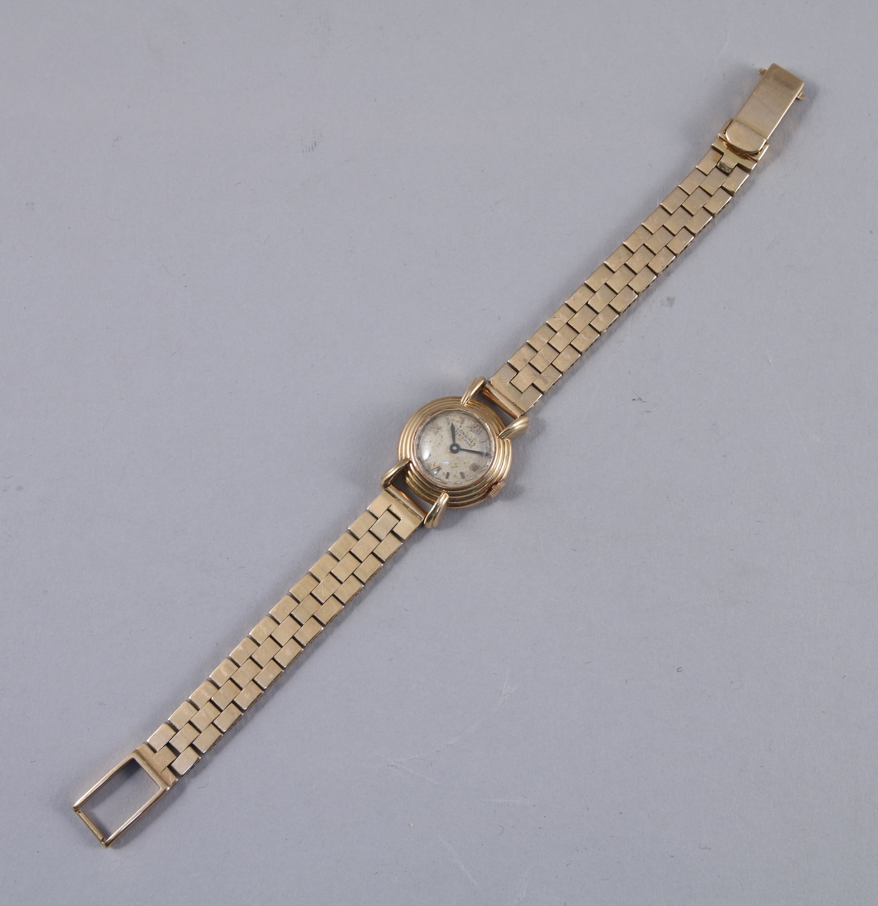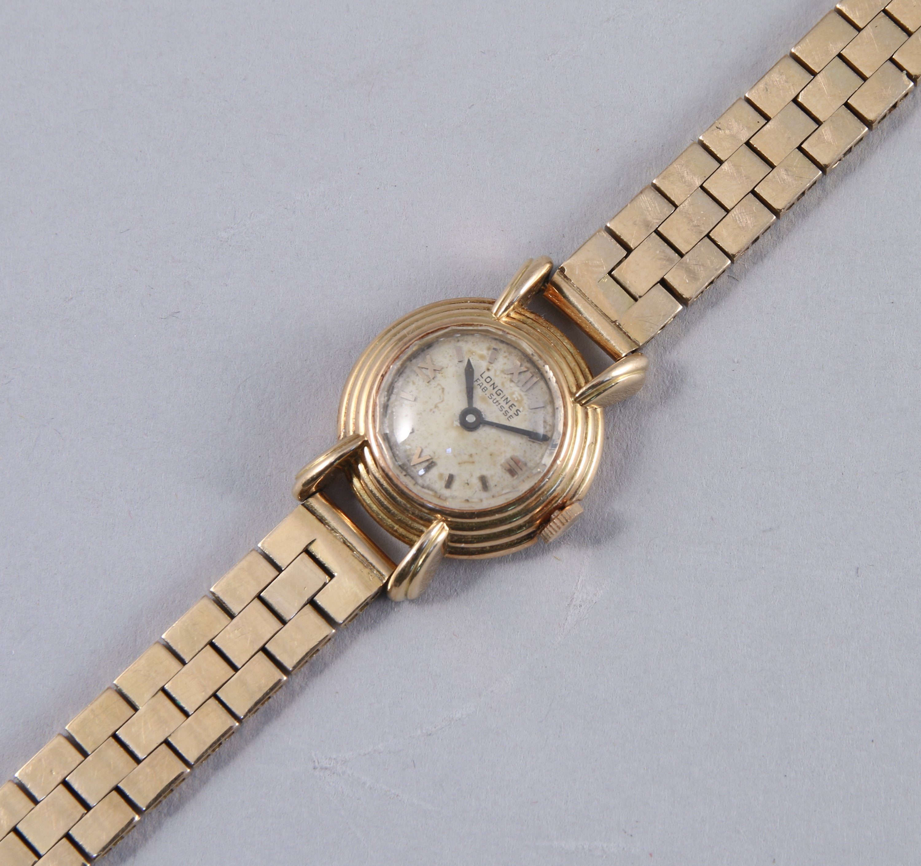 LONGINES. MONTRE de DAME en or jaune, le boitier rond avec les heures en chiffres romains. Diam. 20 mm. Bracelet à maille articulé en or jaune 18K. Lonf 17 cm. Poids brut 38,3 g.