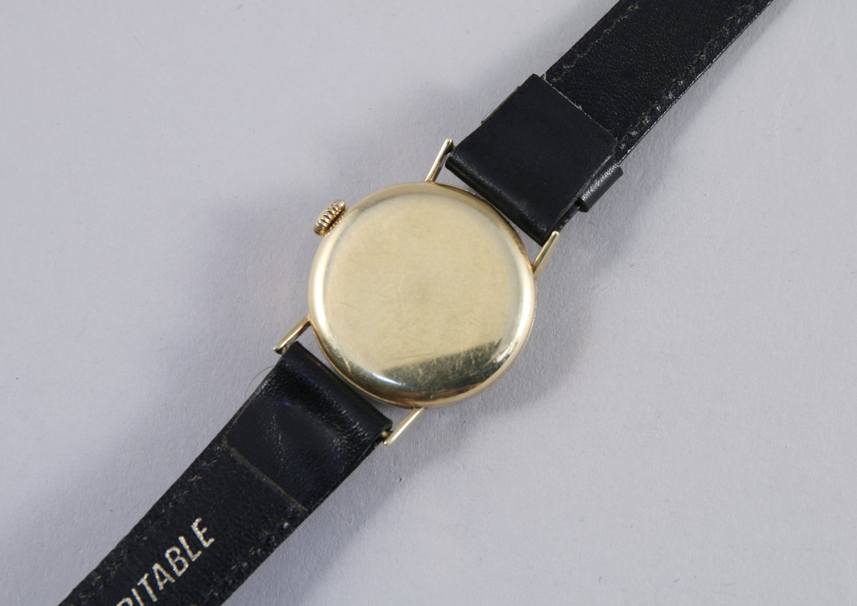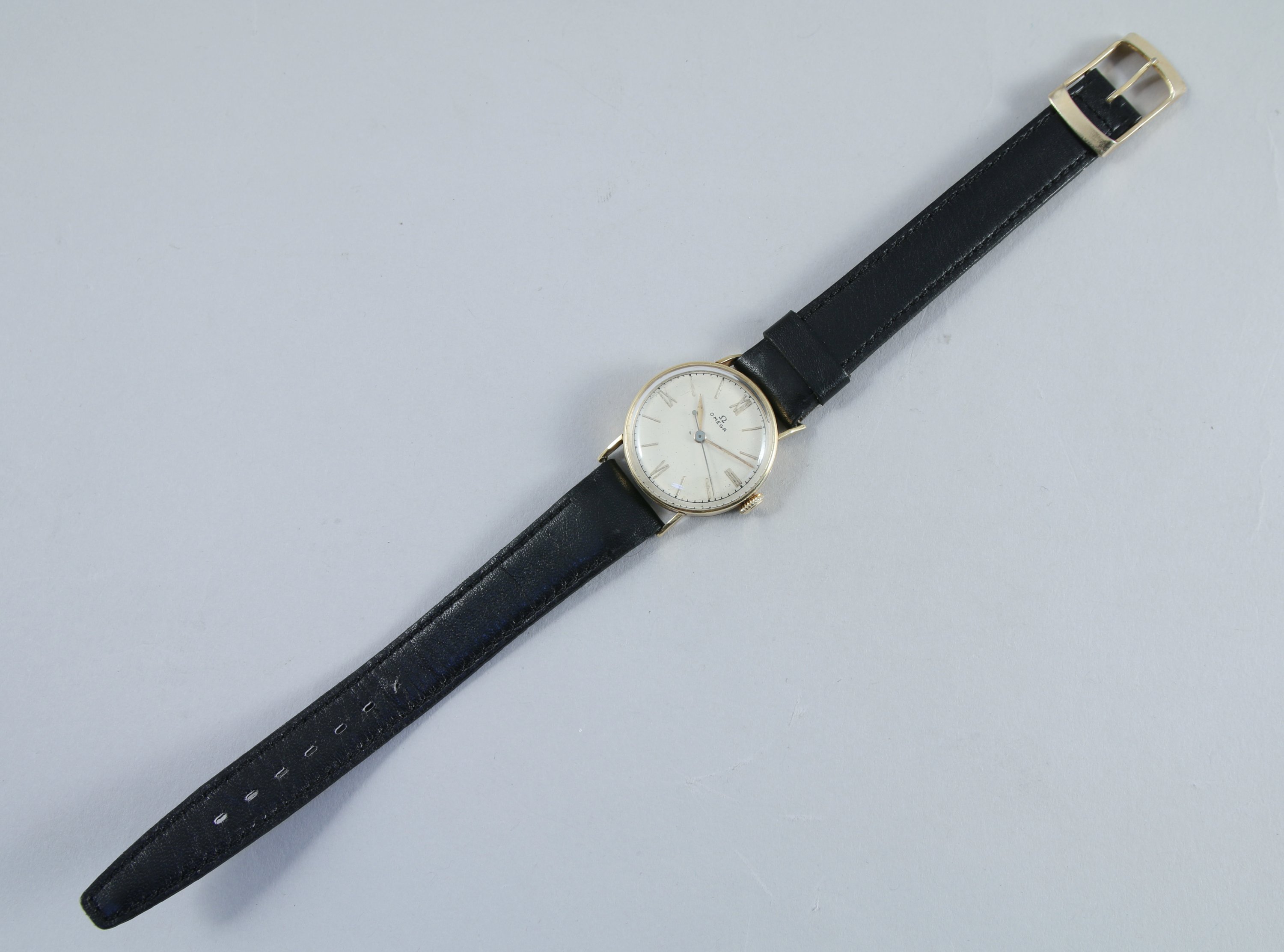 OMEGA. MONTRE BRACELET d'HOMME en or jaune. Le cadran circulaire signé est gradué pour les heures et les minutes avec les chiffres romains "III, VI, IX et XII". Remontoir à trois heures. Trotteuse des seconde. Bracelet cuir noir/