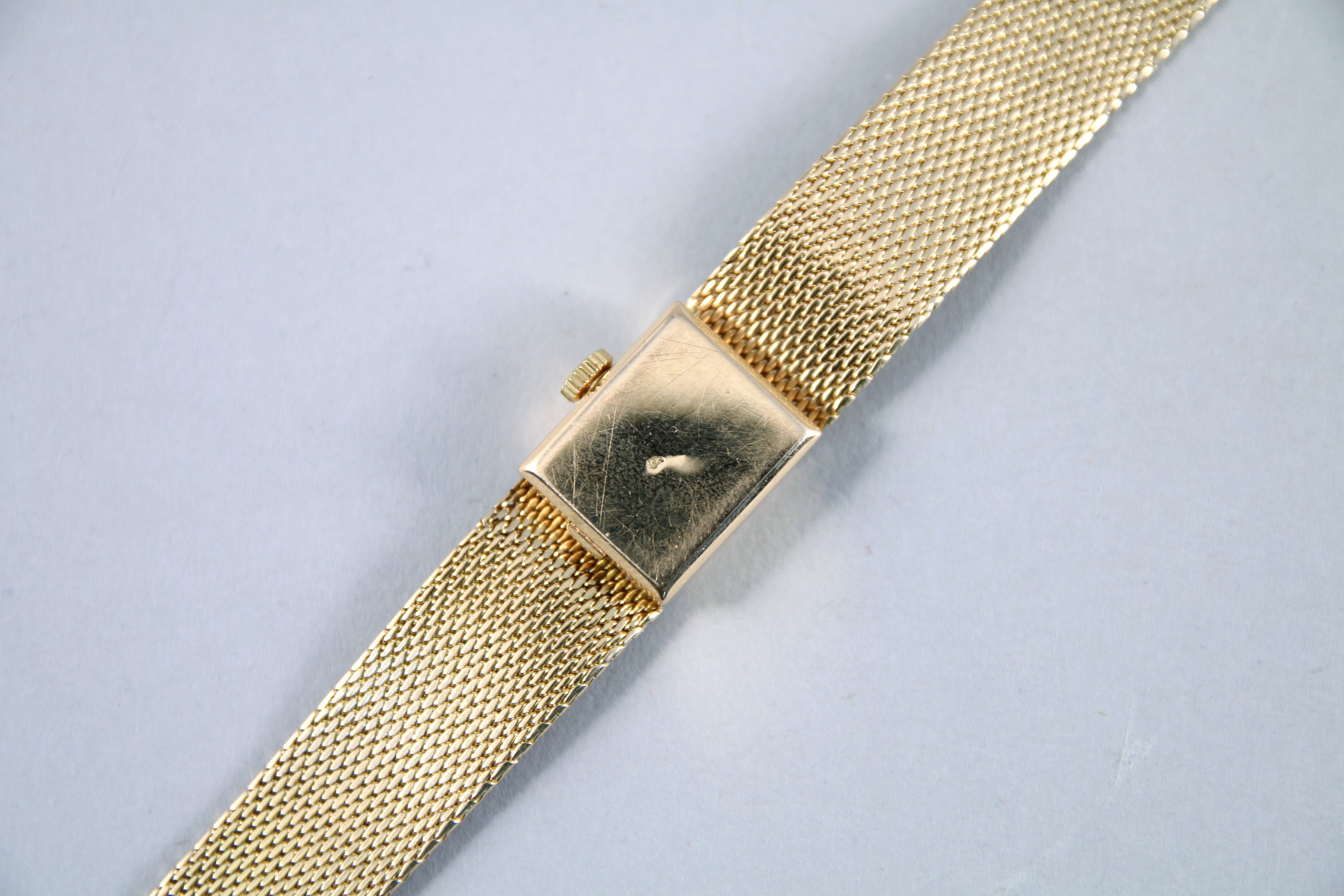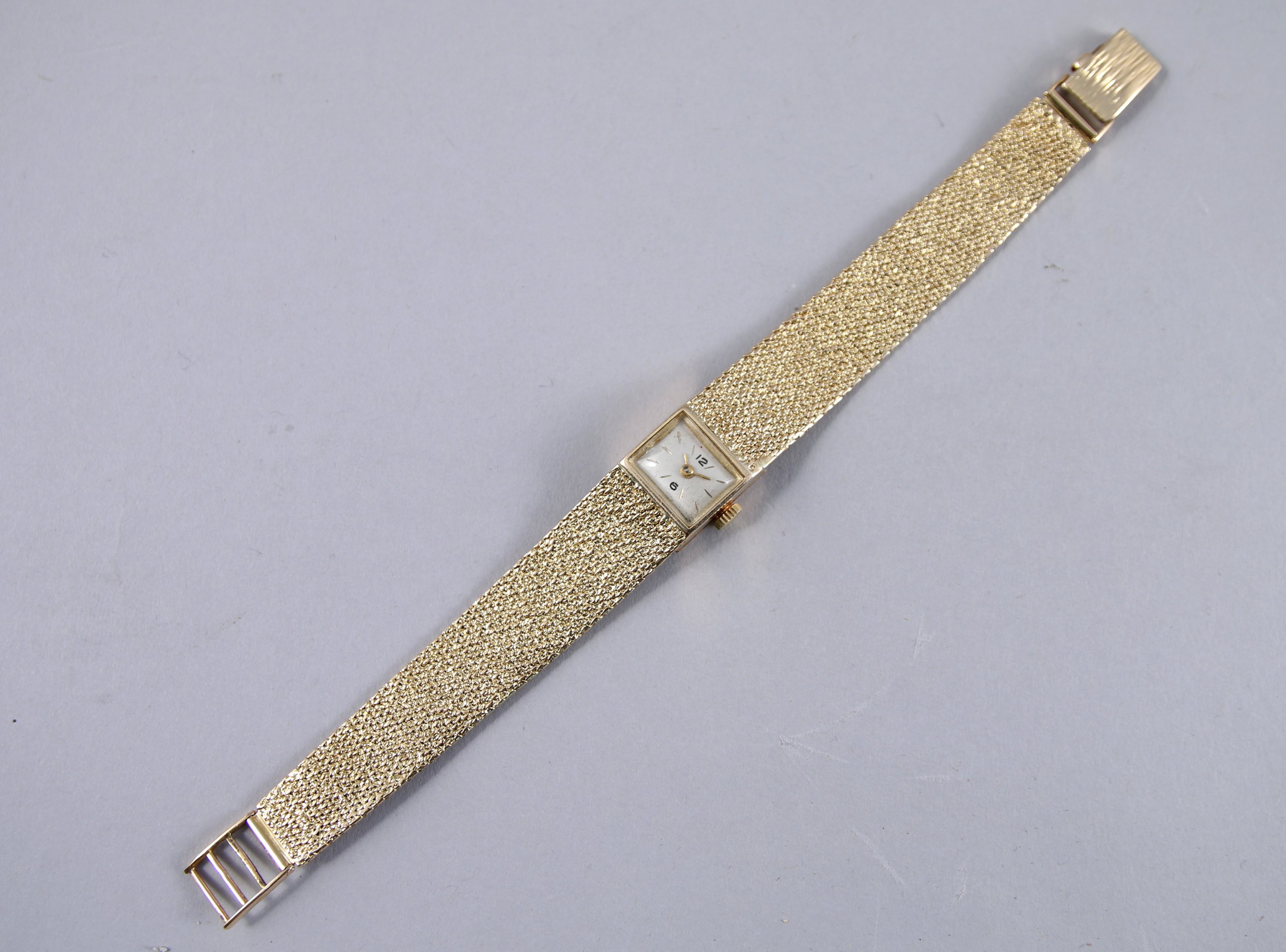 MONTRE-BRACELET de dame en or jaune 750 millièmes. Bracelet maille grains de riz martelé. Cadran de forme rectangulaire indiquant les heures en chiffres arabes et index bâtonnets.