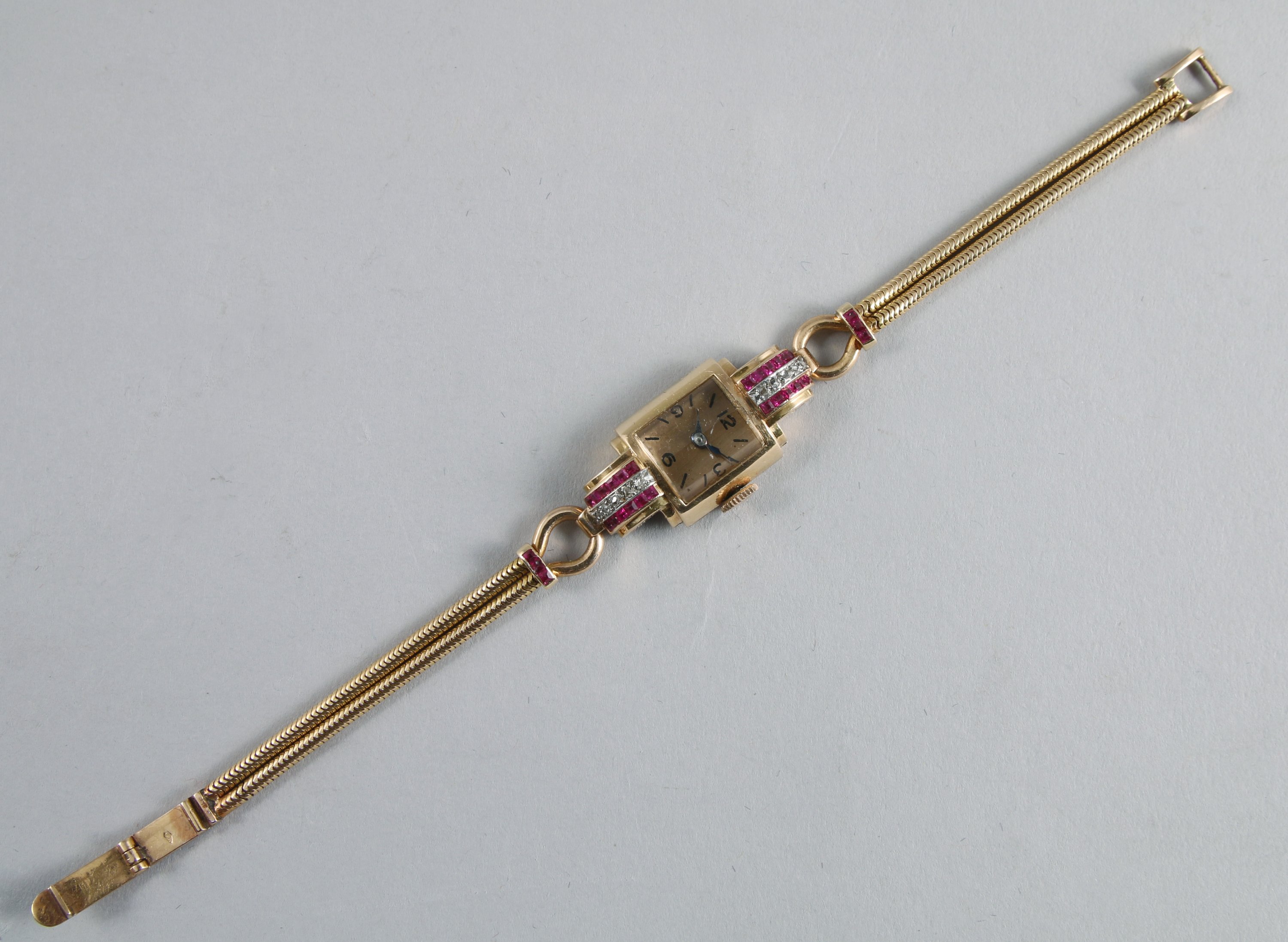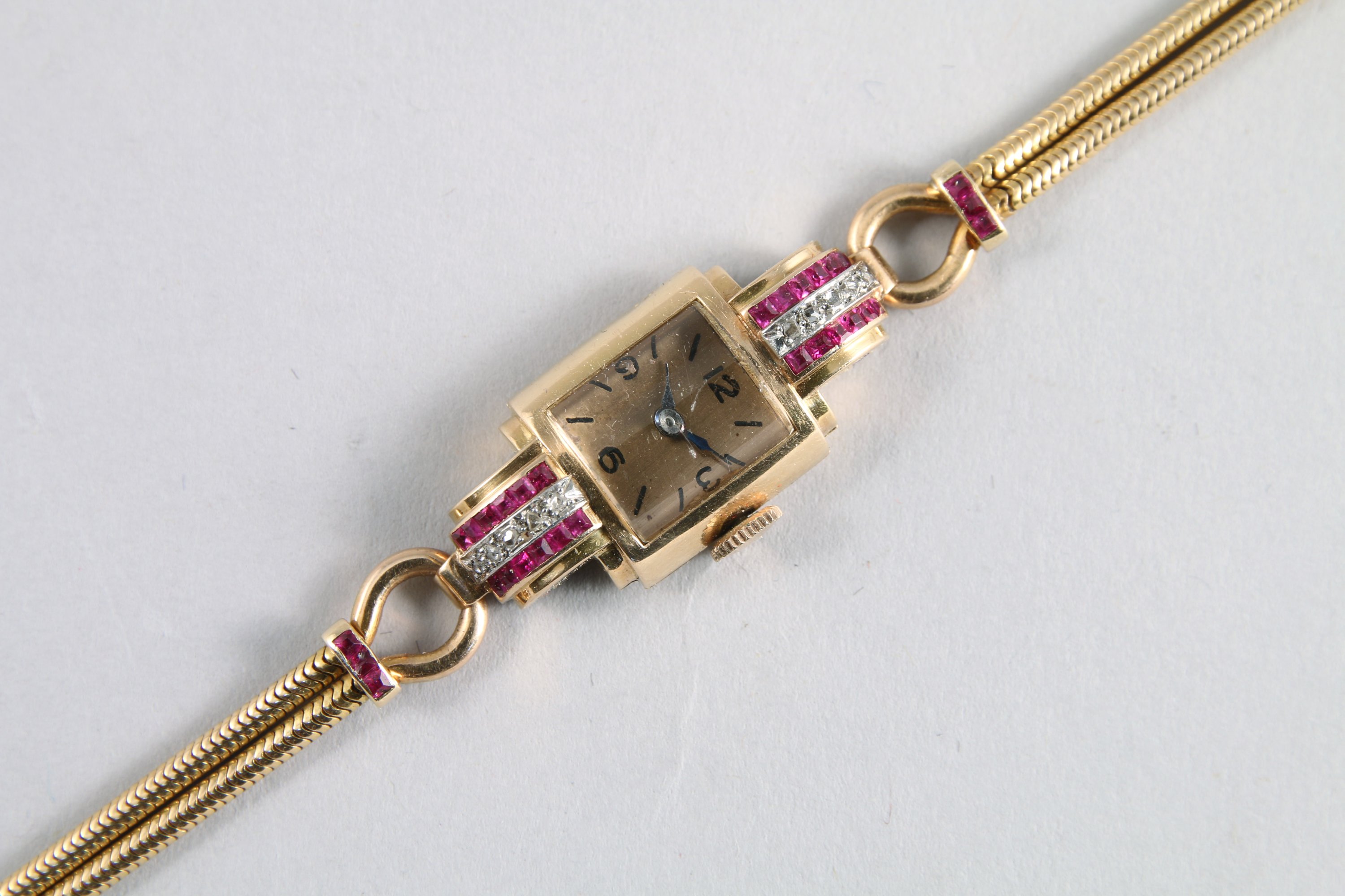 MONTRE-BRACELET de dame en or jaune, le boitier rectangulaire orné de pierres blanches et rouges (RUBIS et DIAMANTS ?), le cadran gradué pour les heures, le bracelet se séparant en deux liens souples en or jaune.