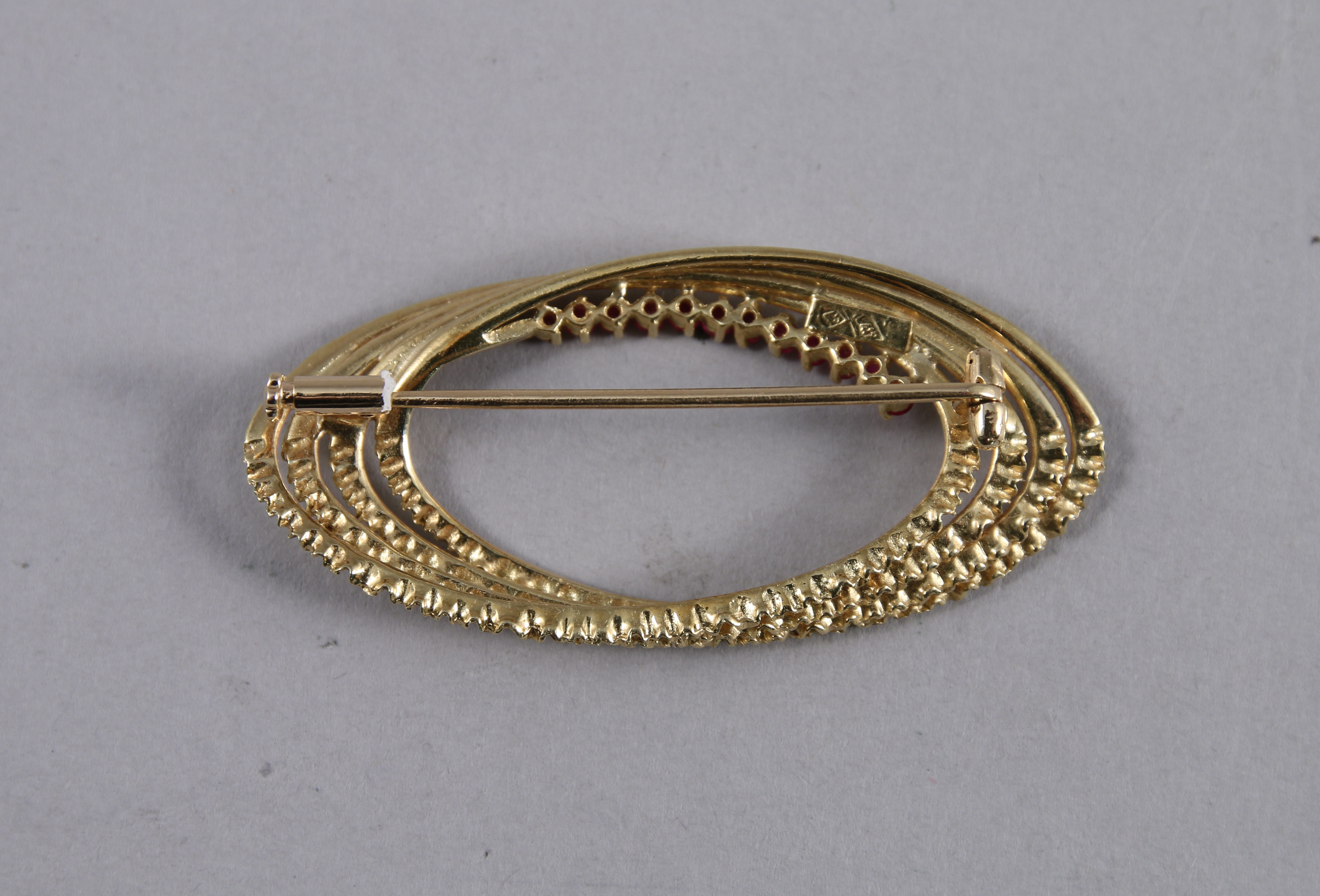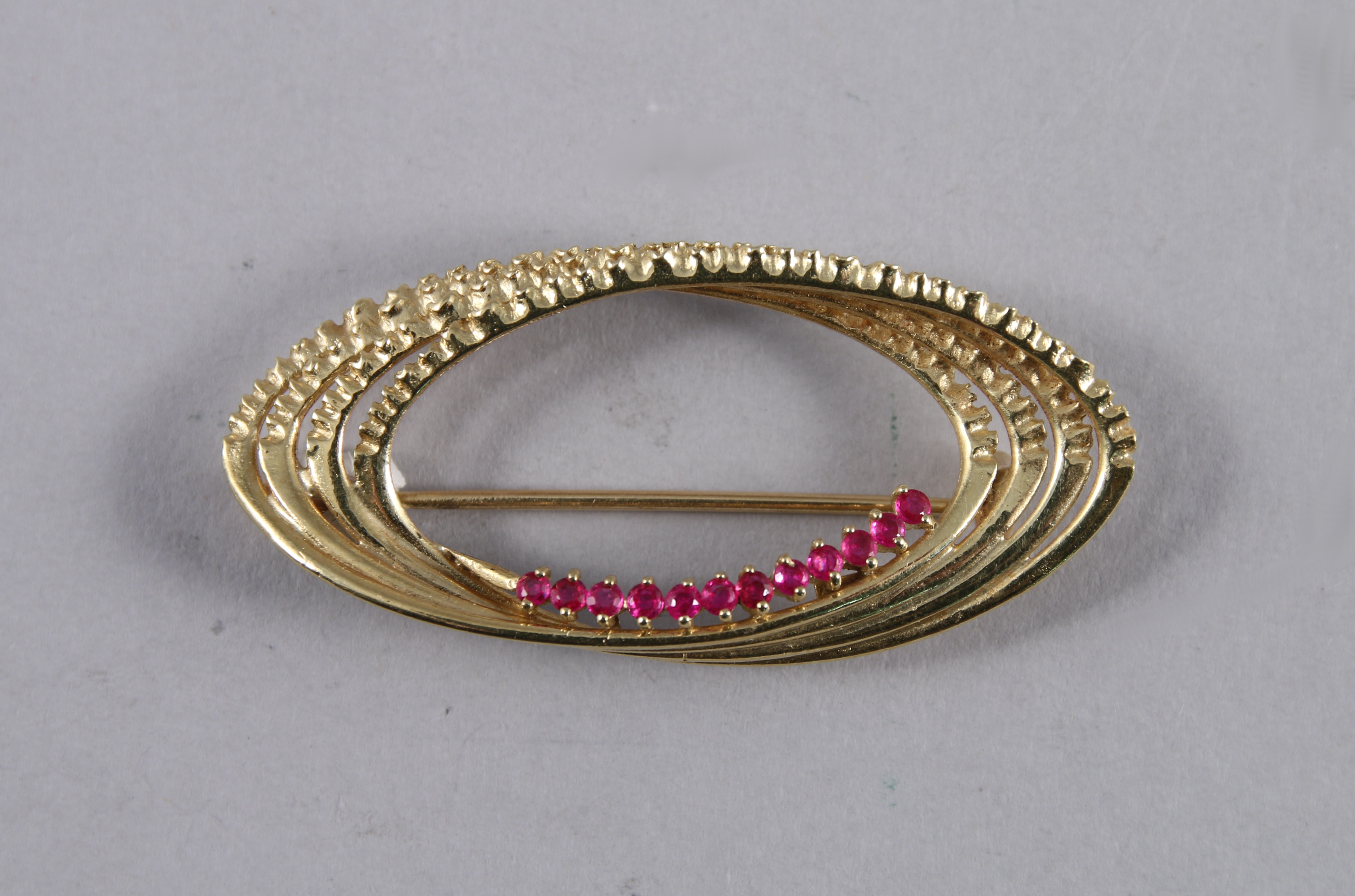 BROCHE de forme ovale en or jaune 750 millièmes constituée de quatre cercles superposés, dont un orné de 12 petits RUBIS.