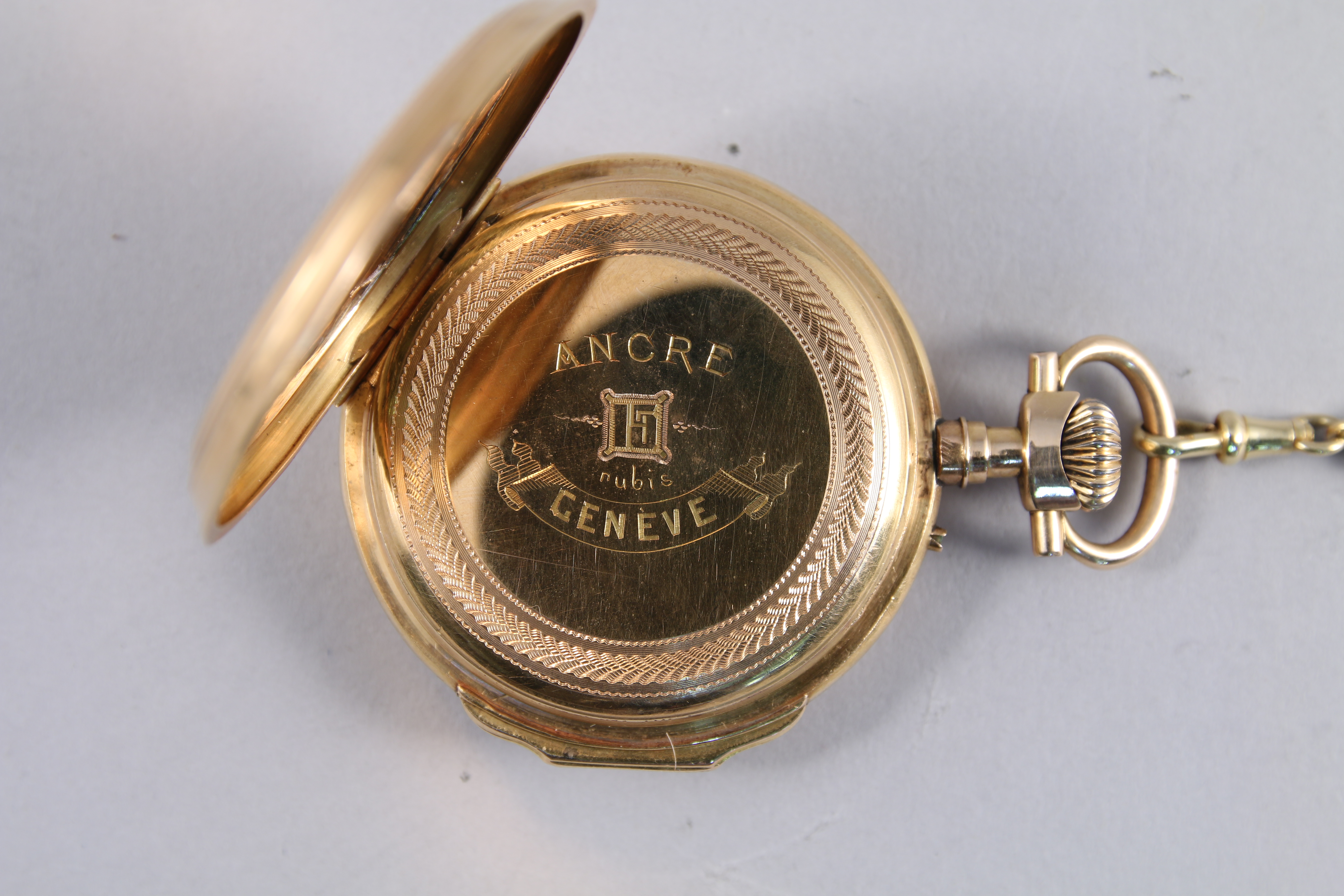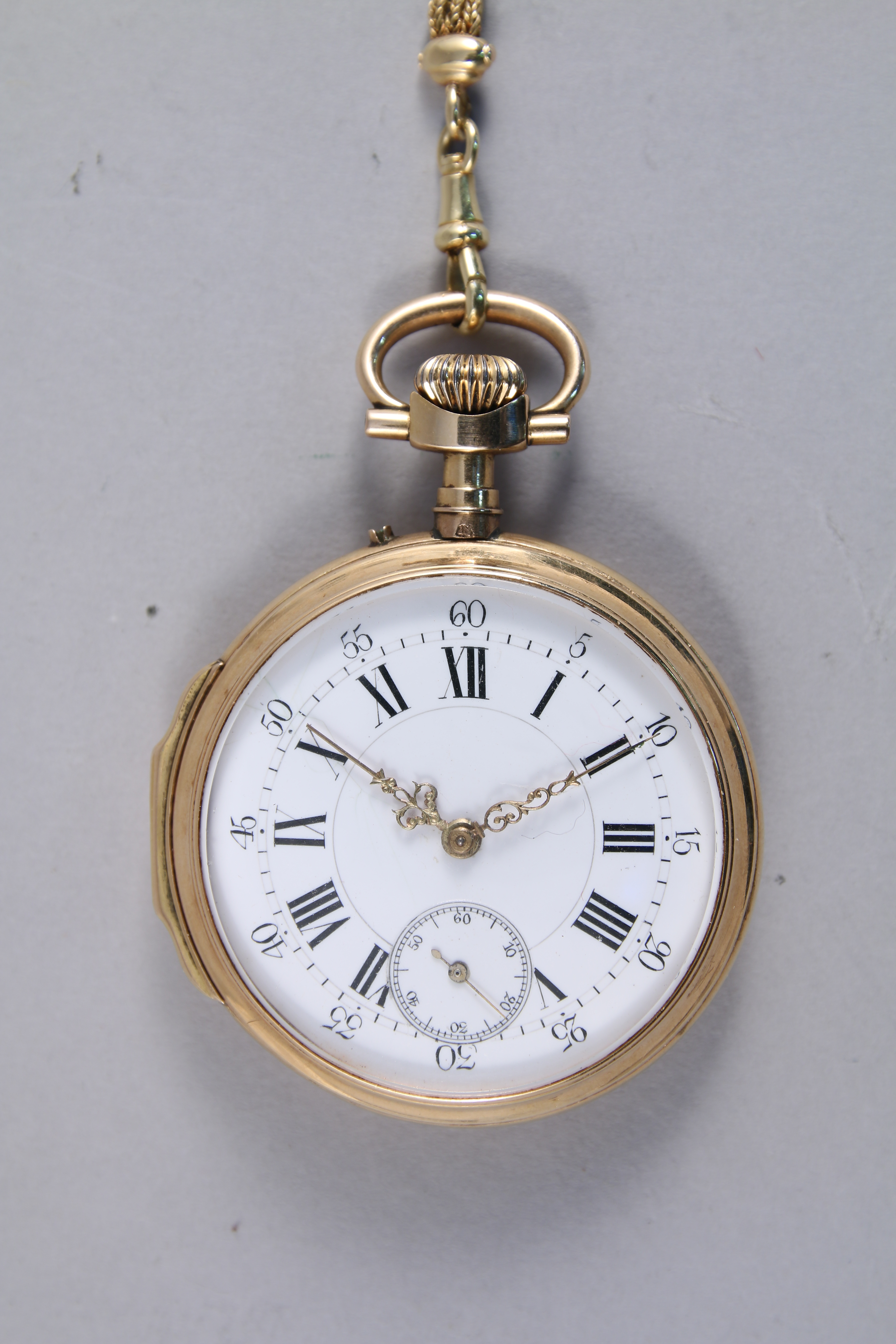 MONTRE de GOUSSET en or jaune, double cadran émaillé, gradué pour les minutes, les heures en chiffres romains, trotteuse des secondes à six heures.Lle boitier en or uni. Le cache poussière en or marqué "Genève". Échappement à ancre et remontoir à midi.