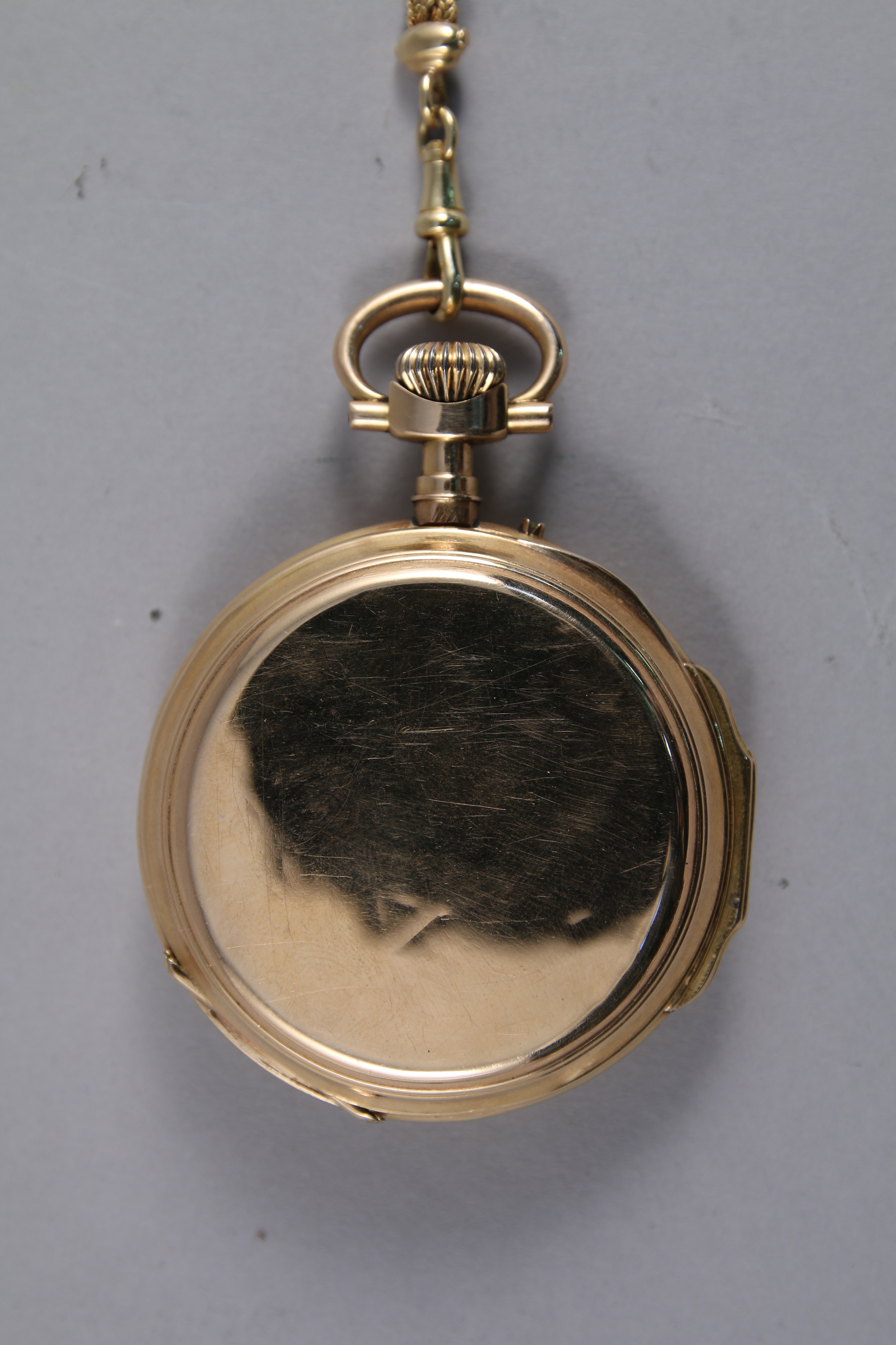 Avec une CHAÎNE GILETIÈRE en or jaune à trois lacets réunis par des cabochons orné d'une pierre noir (onyx ?) et termineé par une clé de remontoir.