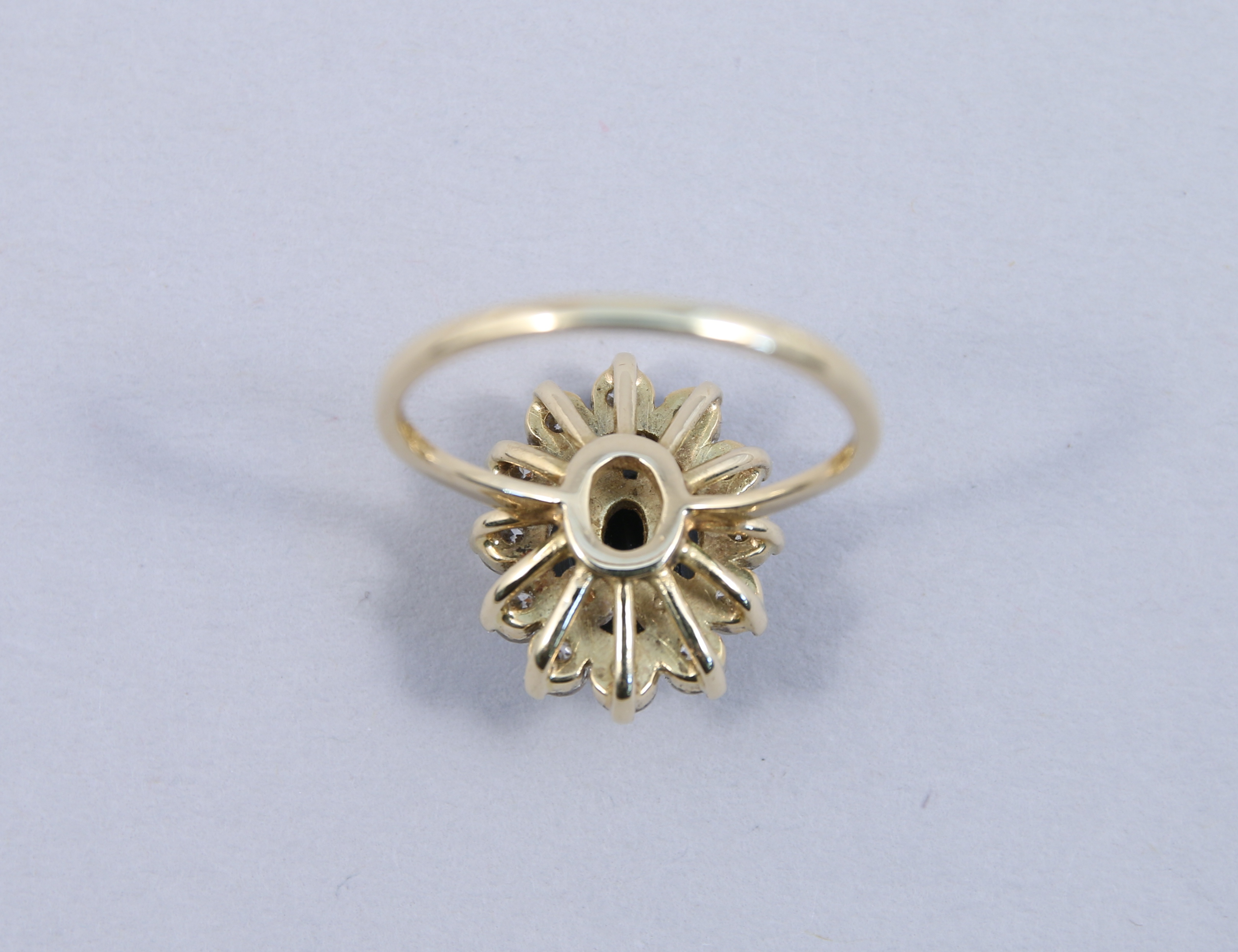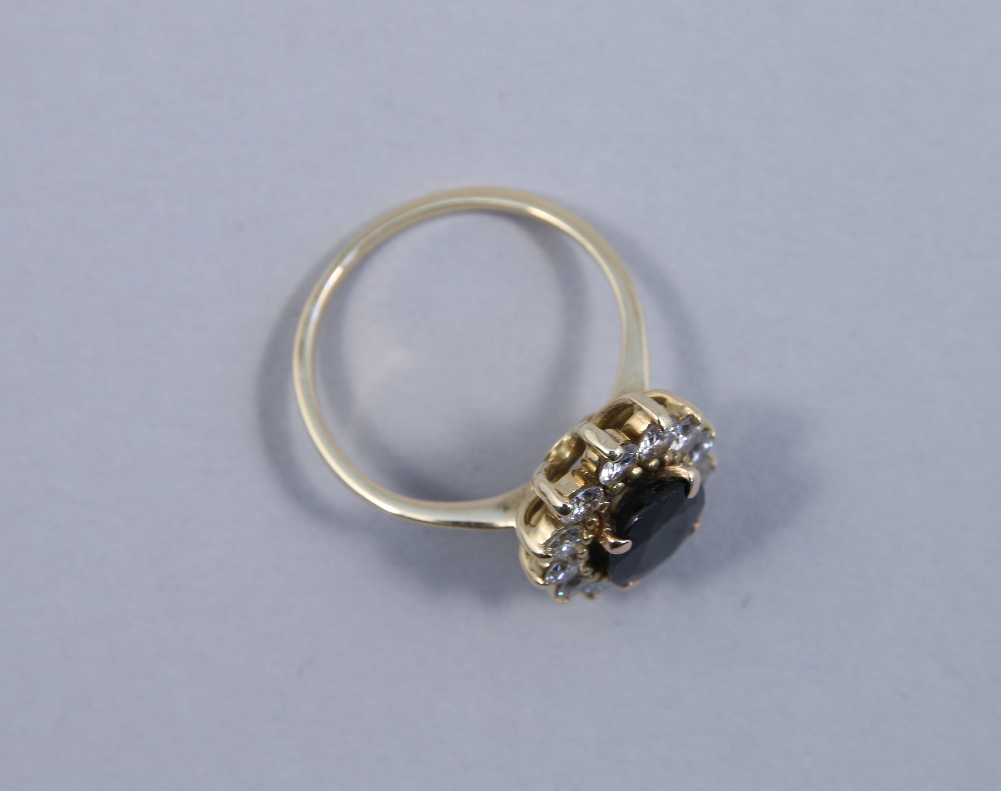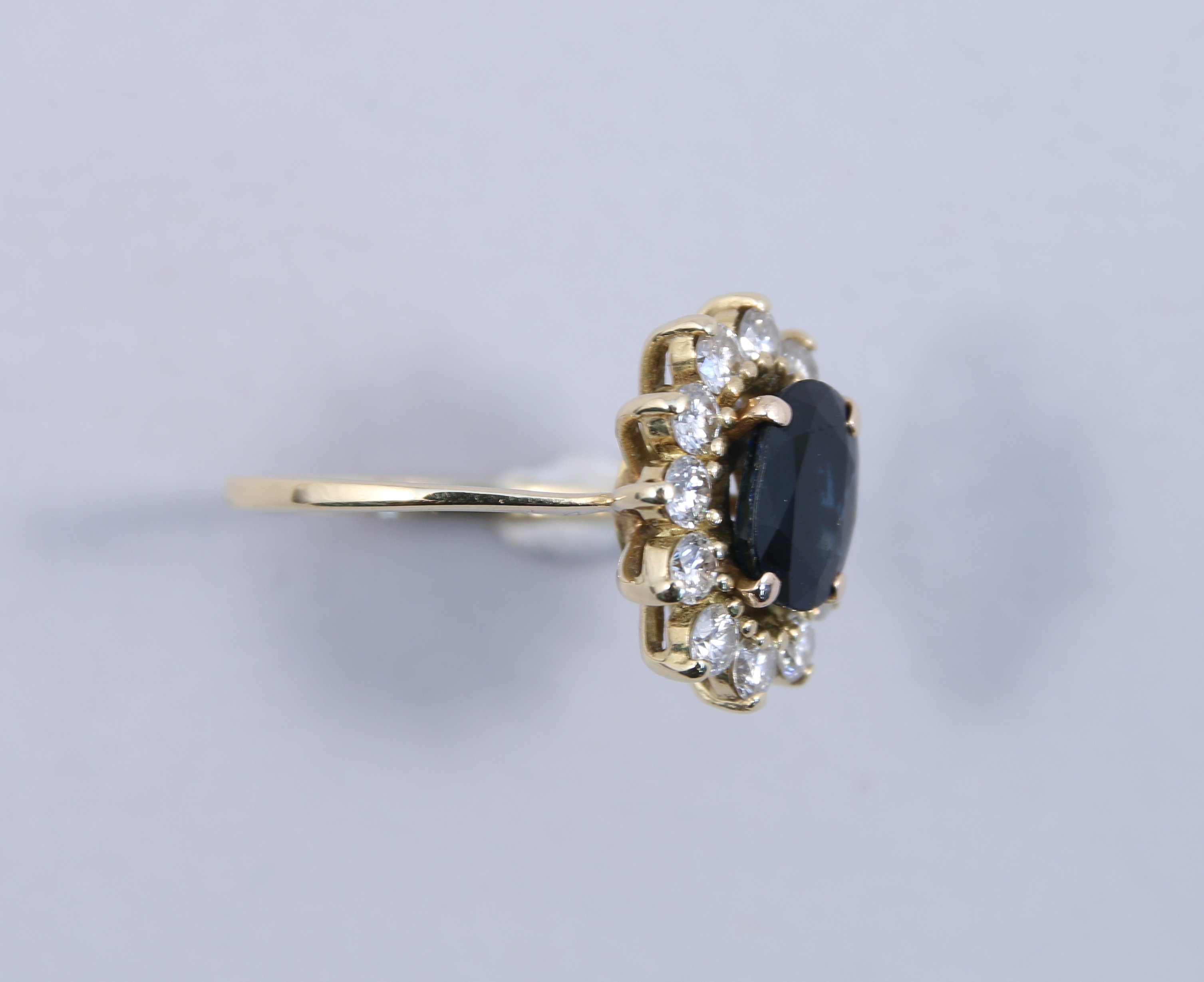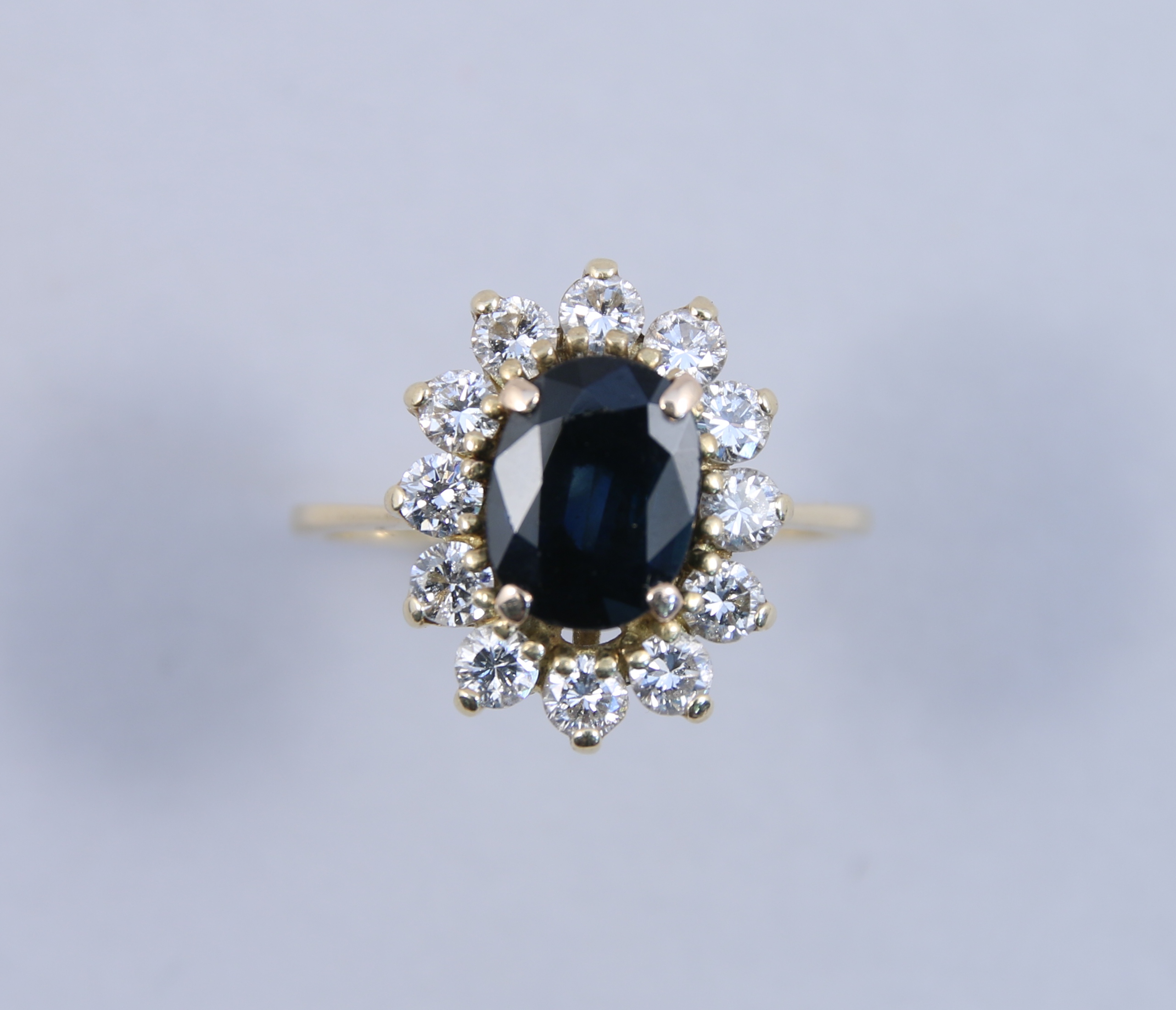 BAGUE en or jaune 750 millièmes centrée d'un SAPHIR de taille ovale, entourée de 12 DIAMANTS.