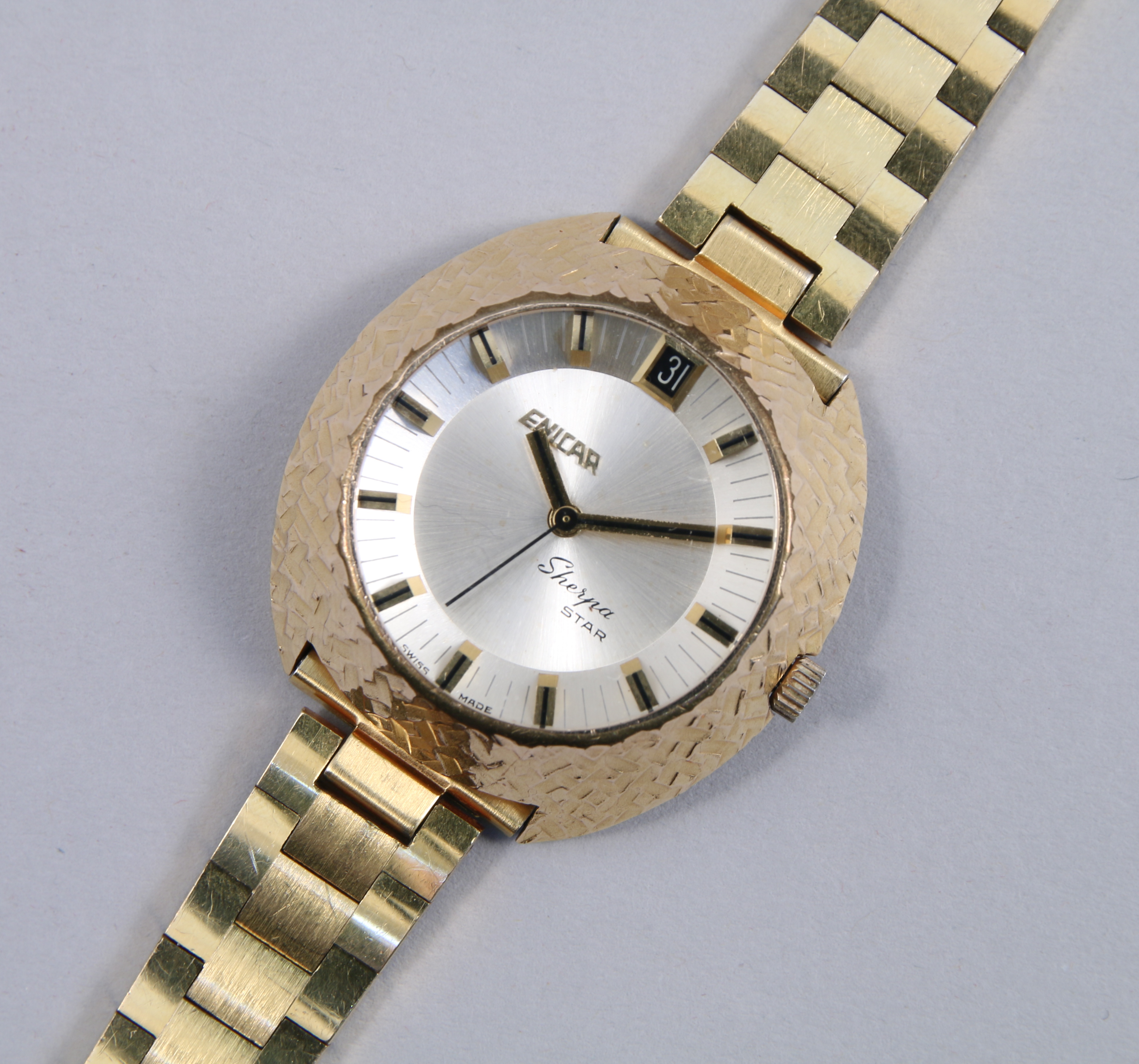 ENICAR. MONTRE-BRACELET de dame, modèle Sherpa Star, en métal doré. Haut cadran à décor martelé, fond argent, à guichet dateur. Index bâtonnets. Signé. Mouvement automatique.