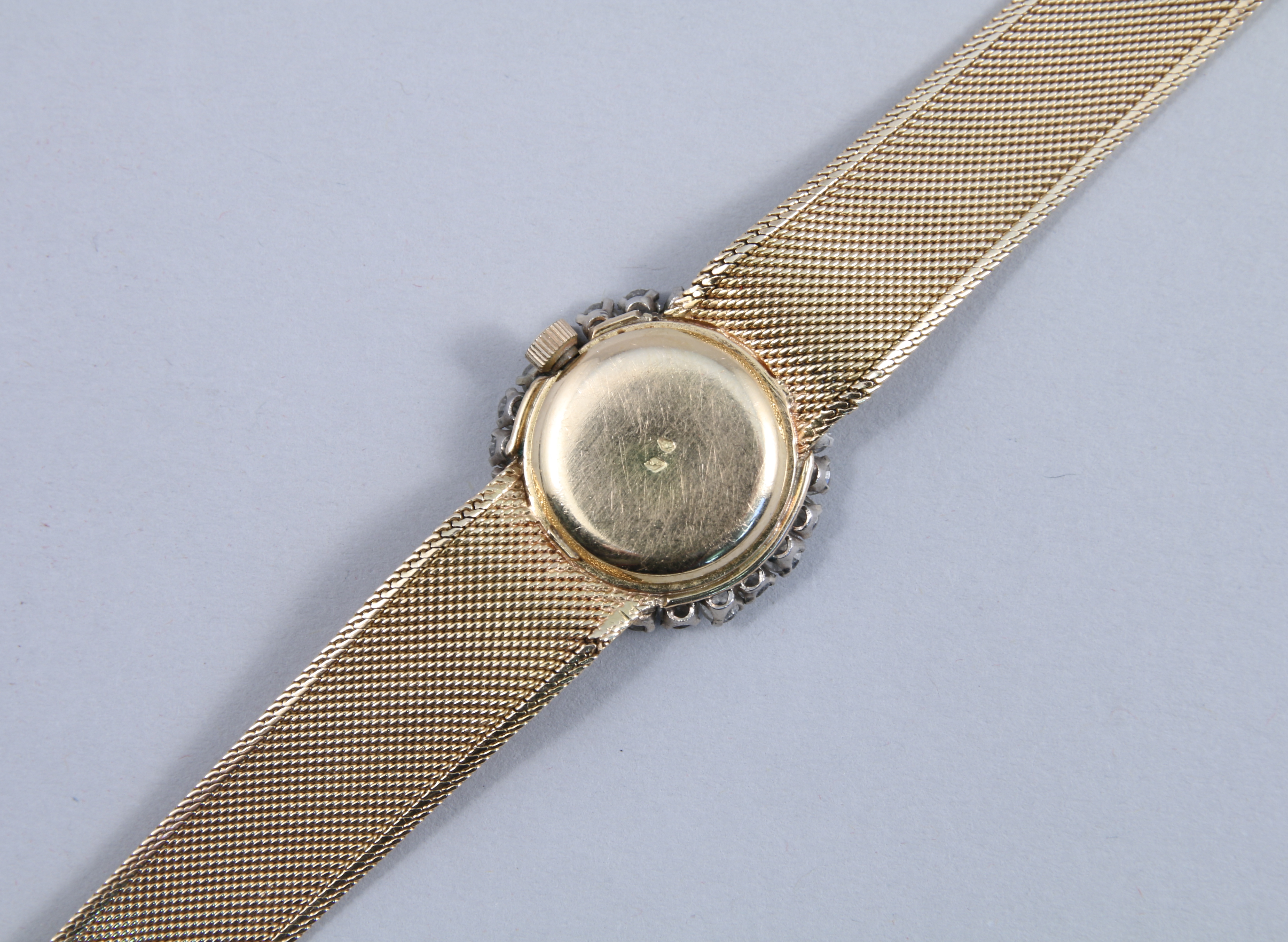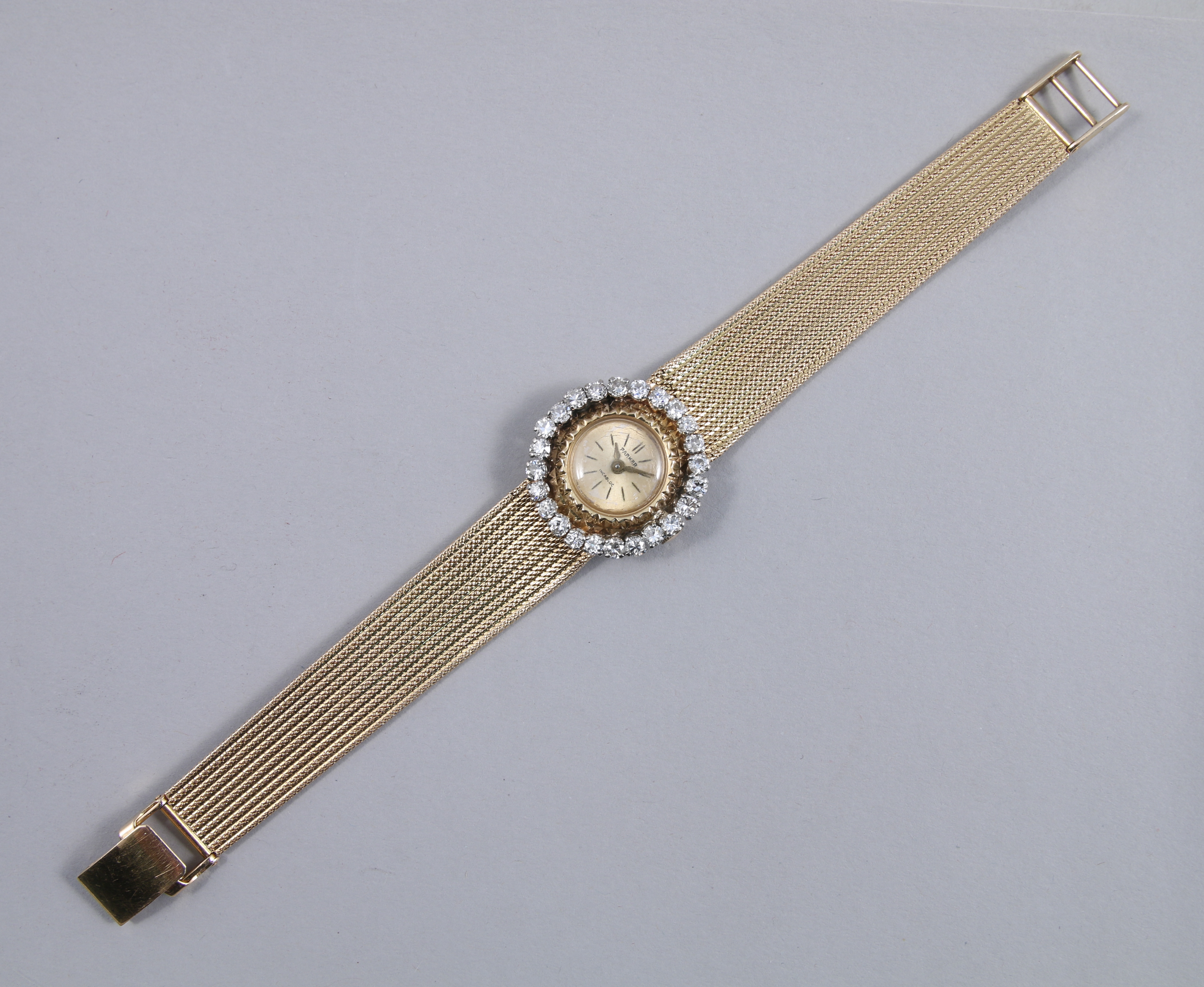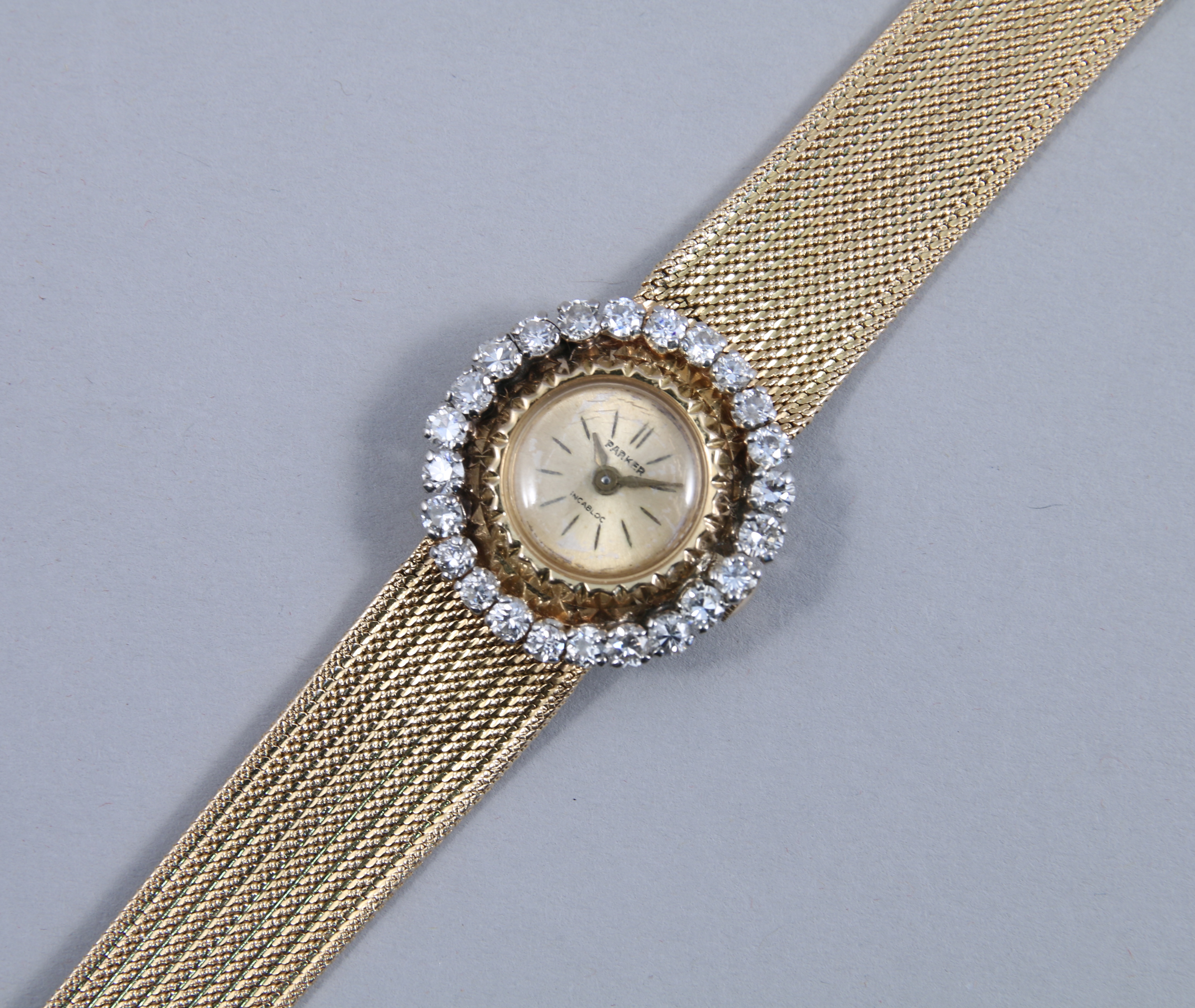 PARKER. MONTRE-BRACELET de dame en or jaune 750 millièmes. Cadran de forme rond cerclé de 24 DIAMANTS. Fond doré indiquant les heures à index bâtonnets. Système incabloc. Bracelet souple en or jaune 750 millièmes.