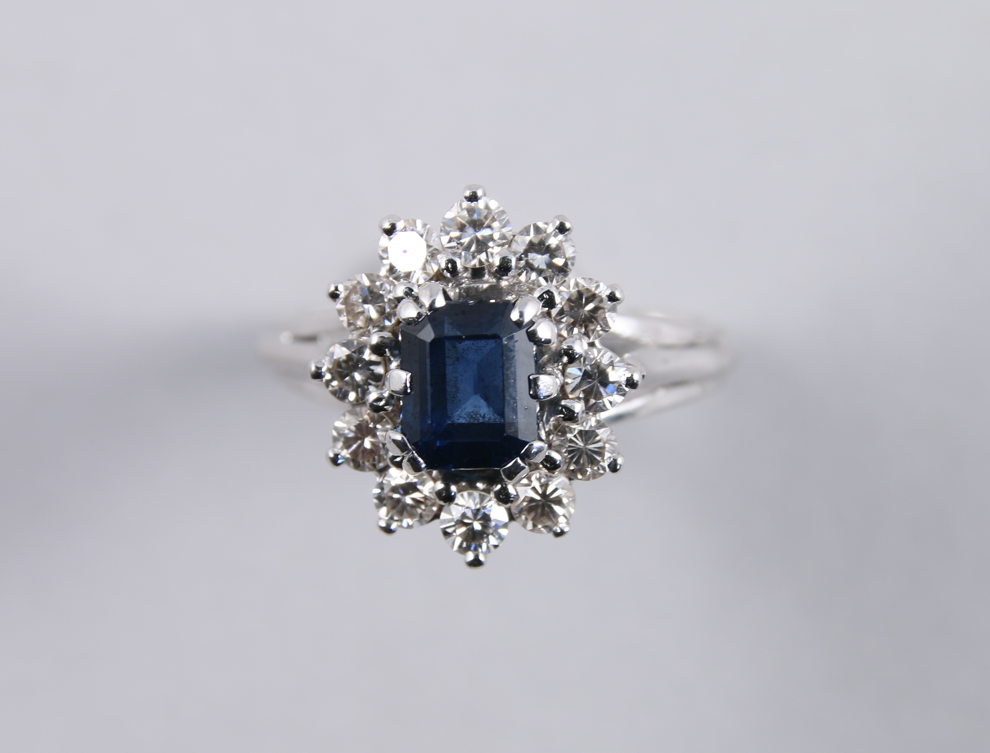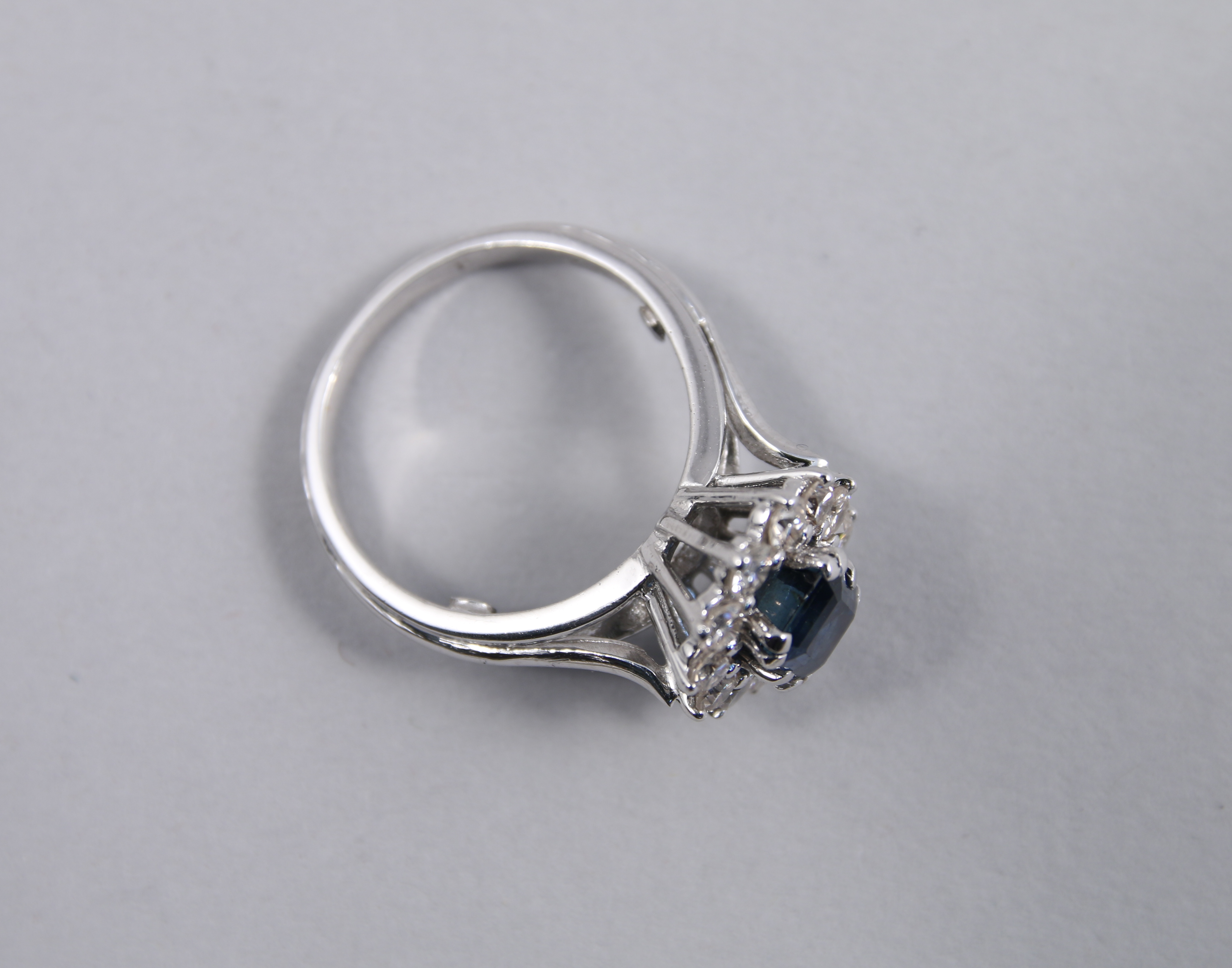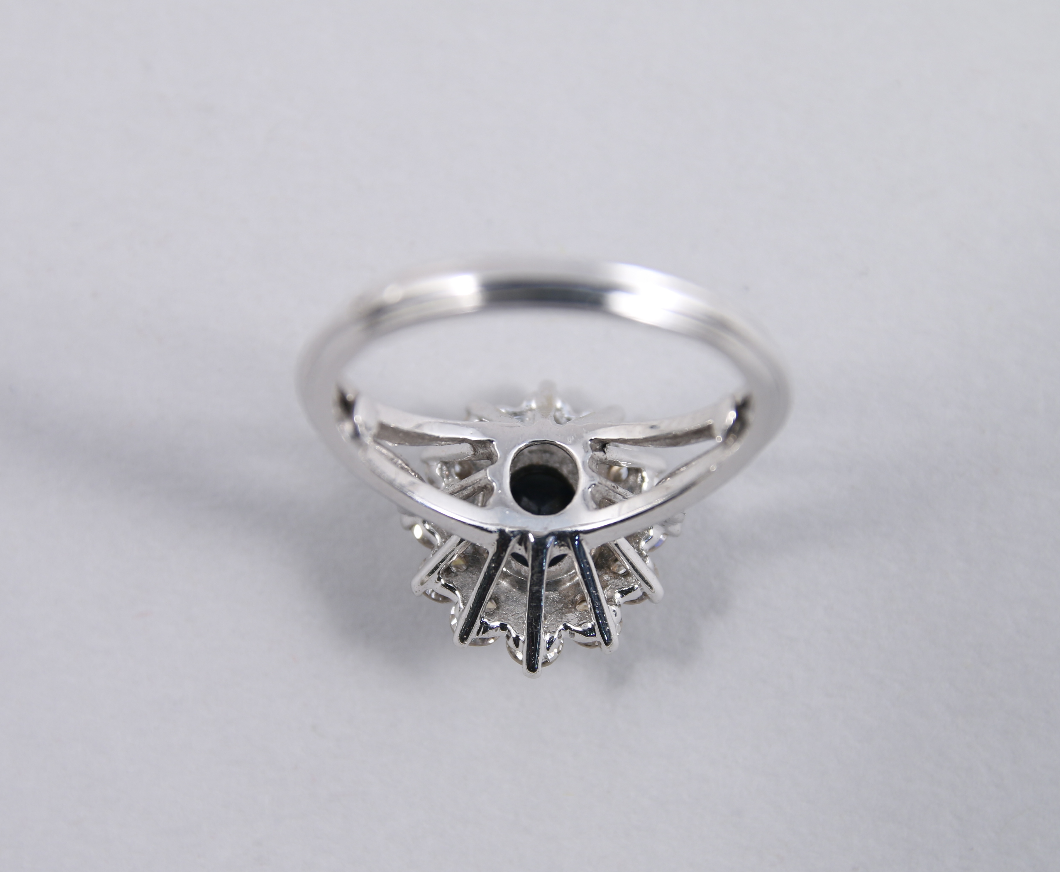 BAGUE dite POMPADOUR en or gris 750 millièmes. Elle est ornée d'un SAPHIR taille émeraude dans un entourage de 12 DIAMANTS.