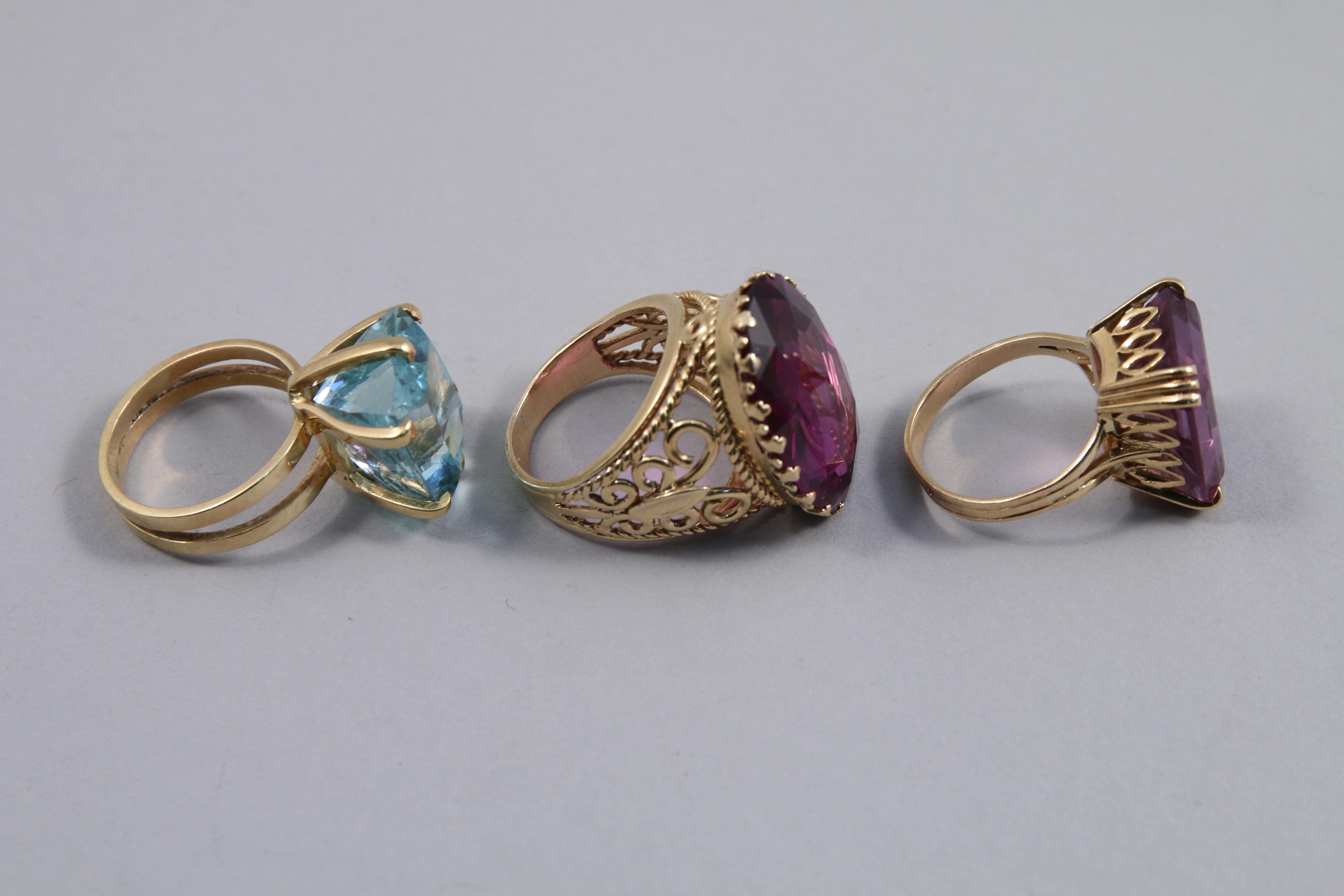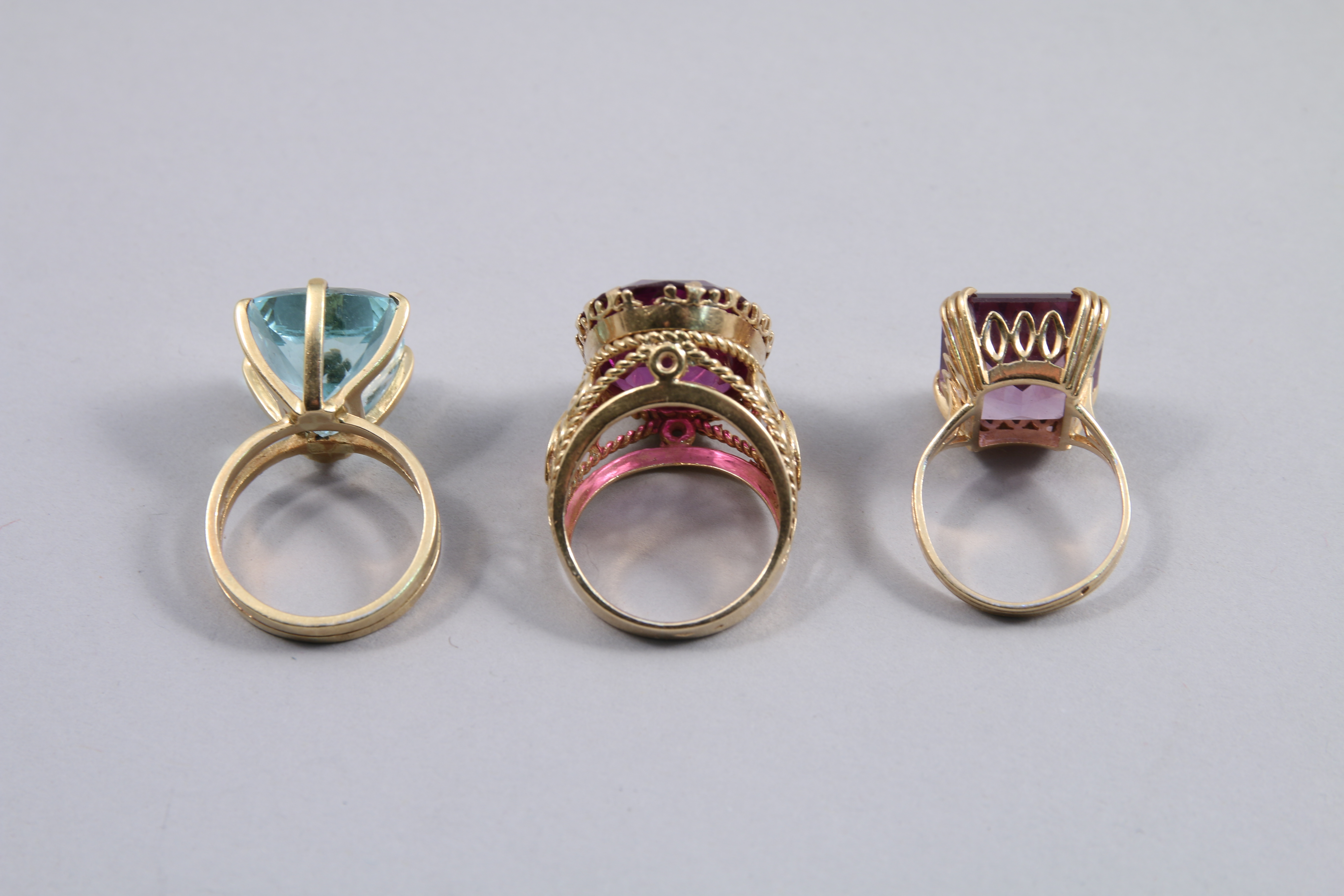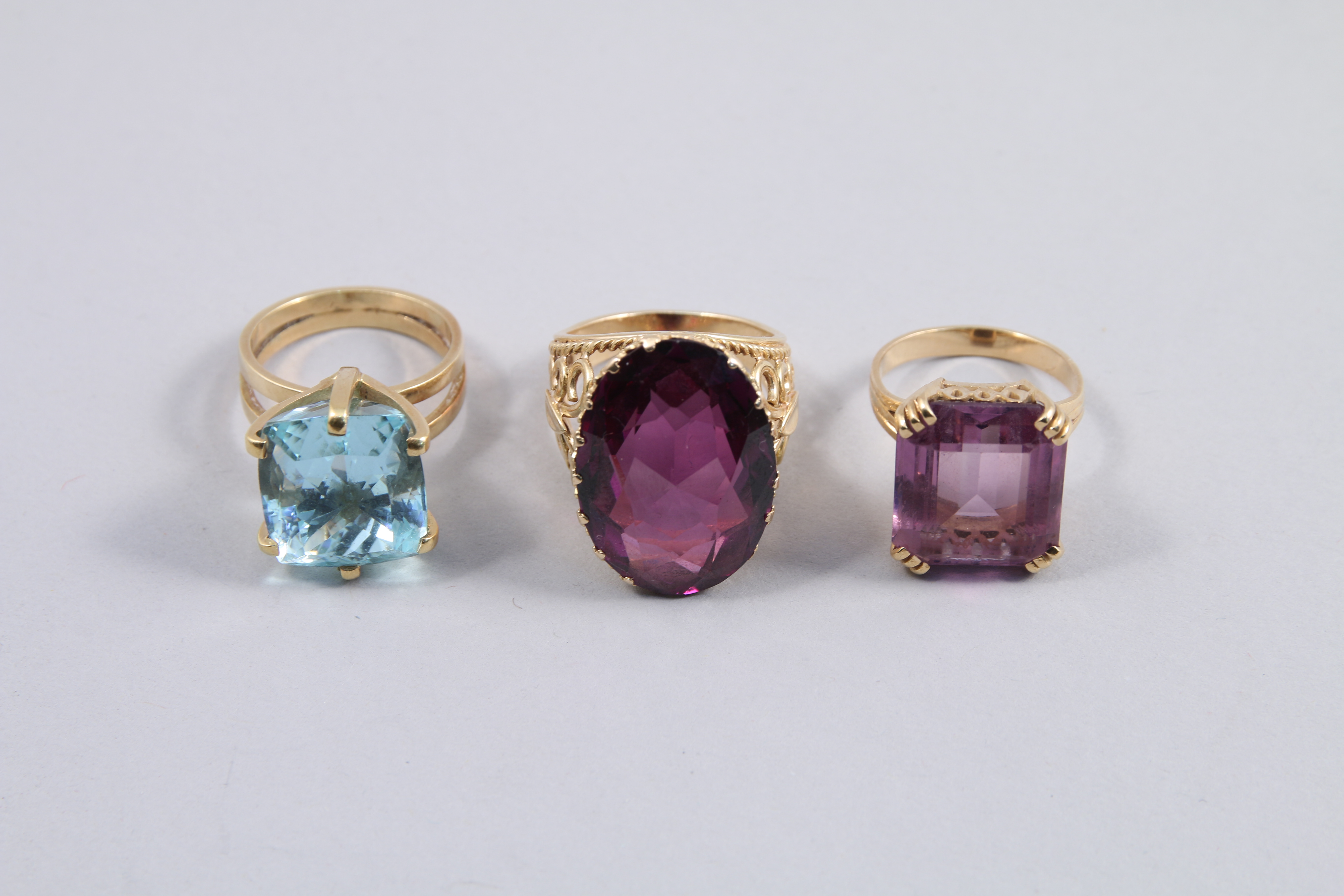 Réunion de TROIS BAGUES en or jaune 750 millièmes, chacune sertie d'une importante pierre fine dont une AMÉTHYSTE.