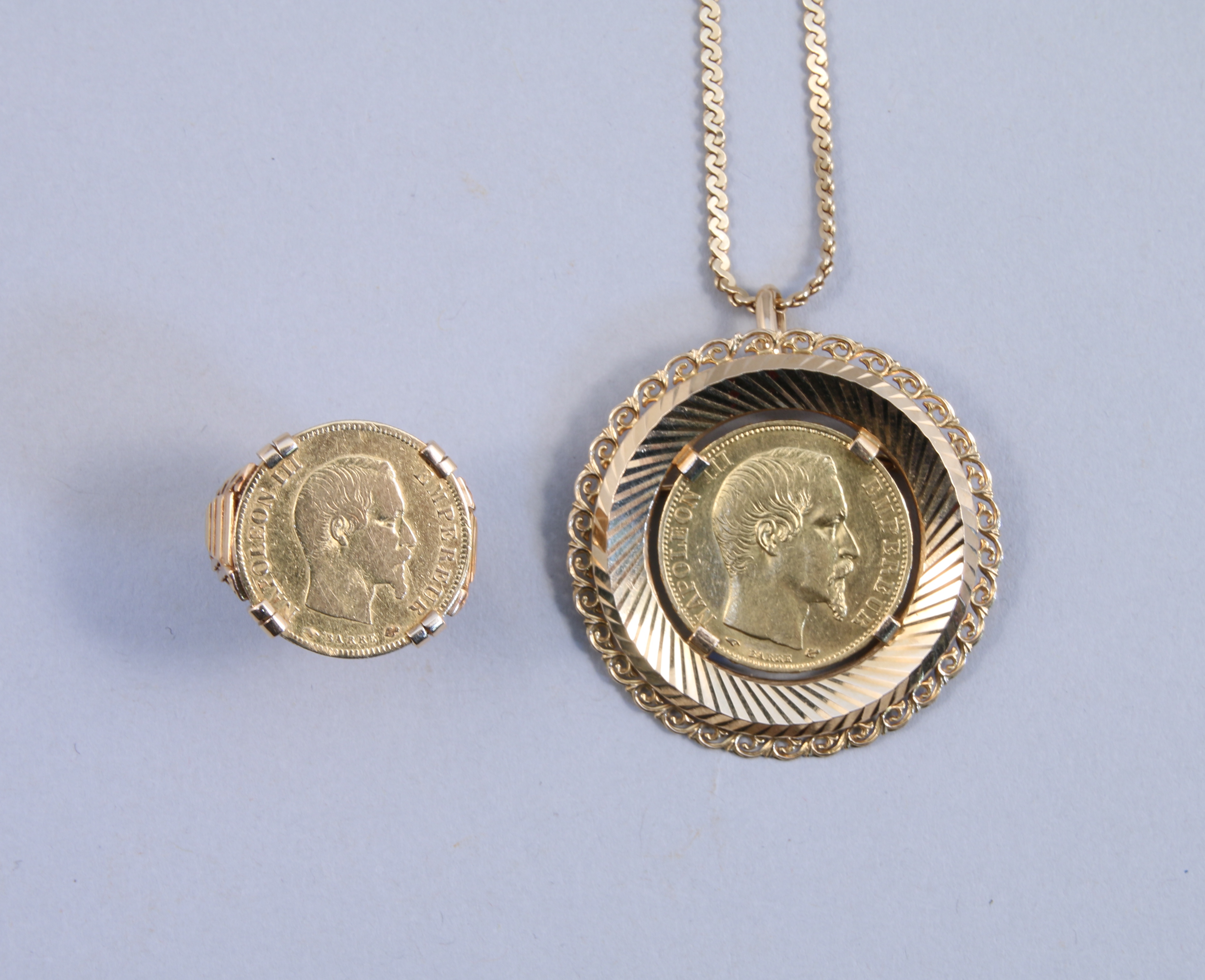 - BAGUE sertie d'une pièce de 10 F or, Napoléon III, tête nue, 1857. Poids : 7,1 g.