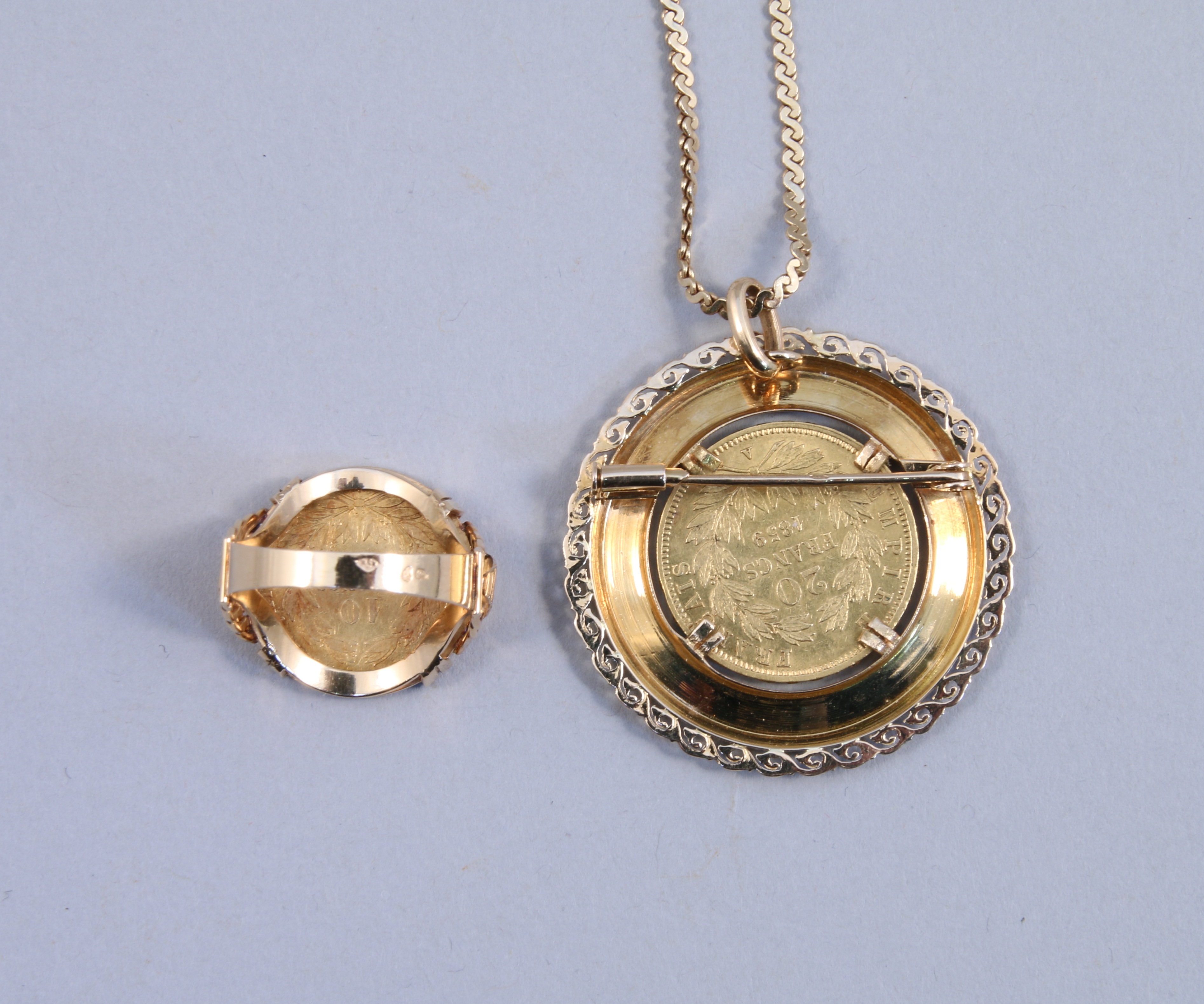 - PENDENTIF serti d'une pièce de 20 F or, Napoléon III tête nue, 1859. Monture ajourée. Chaîne en or jaune 750 millièmes. Poids : 19 g.