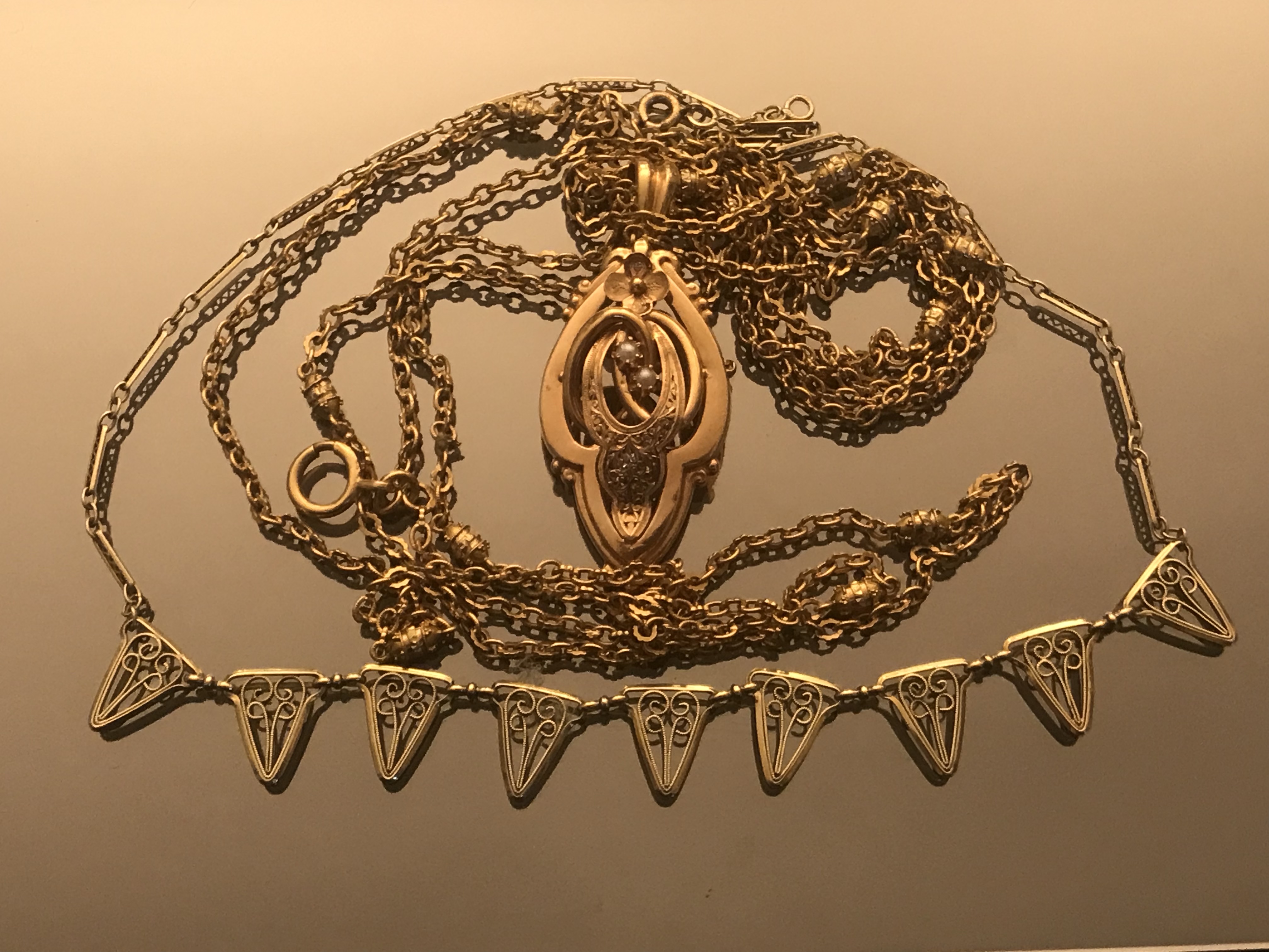 MÉDAILLON en or jaune orné de deux petties perles, monté sur une chaîne à deux lacets et mailles forçat (Long. 75 cm). Poids brut total 16,8 g.