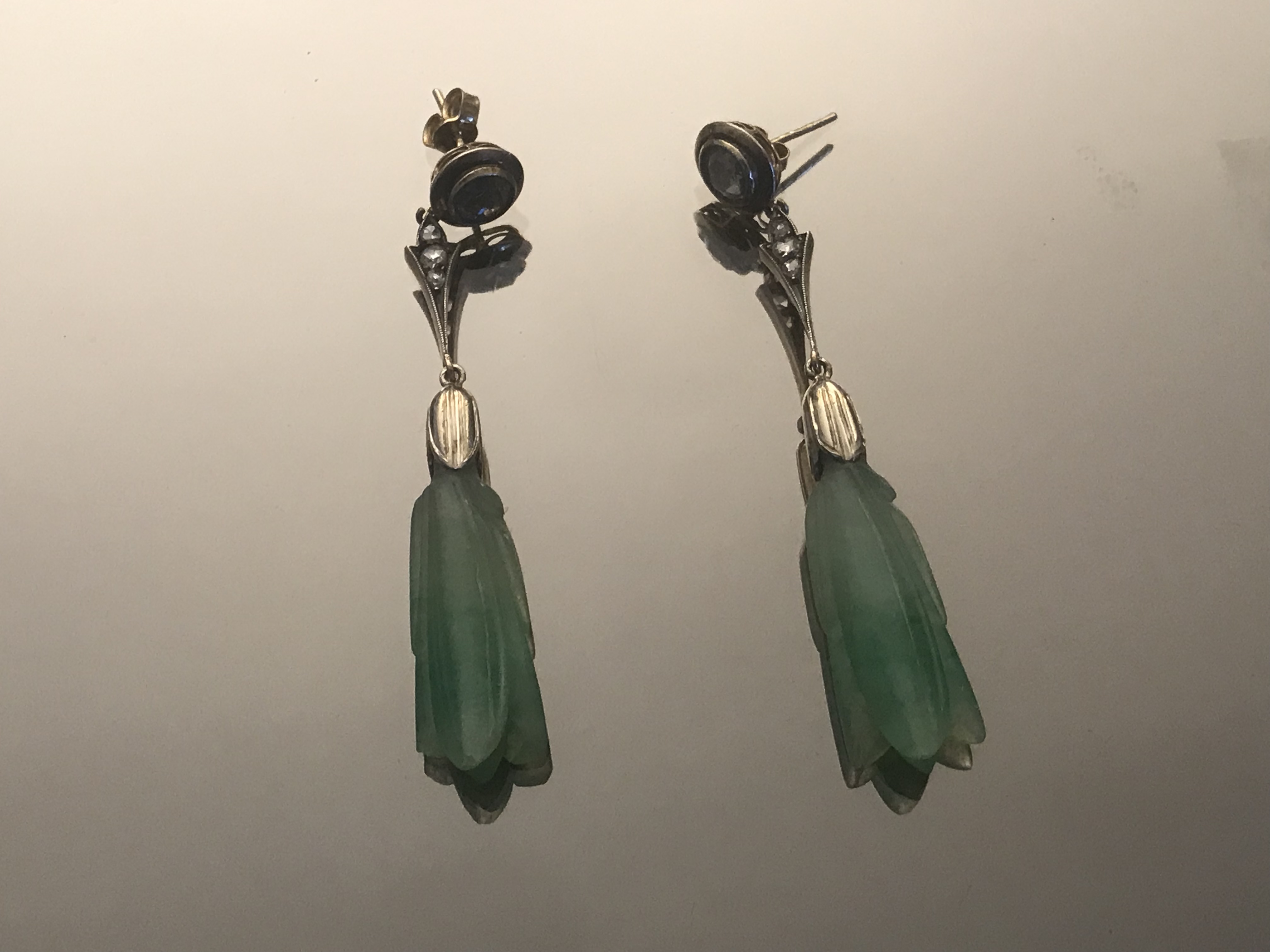 Paire de BOUCLES d'OREILLES en jade sculptée en forme de fleurs de lotus avec une monture en or et argent ornée de DIAMANTS taille en rose.