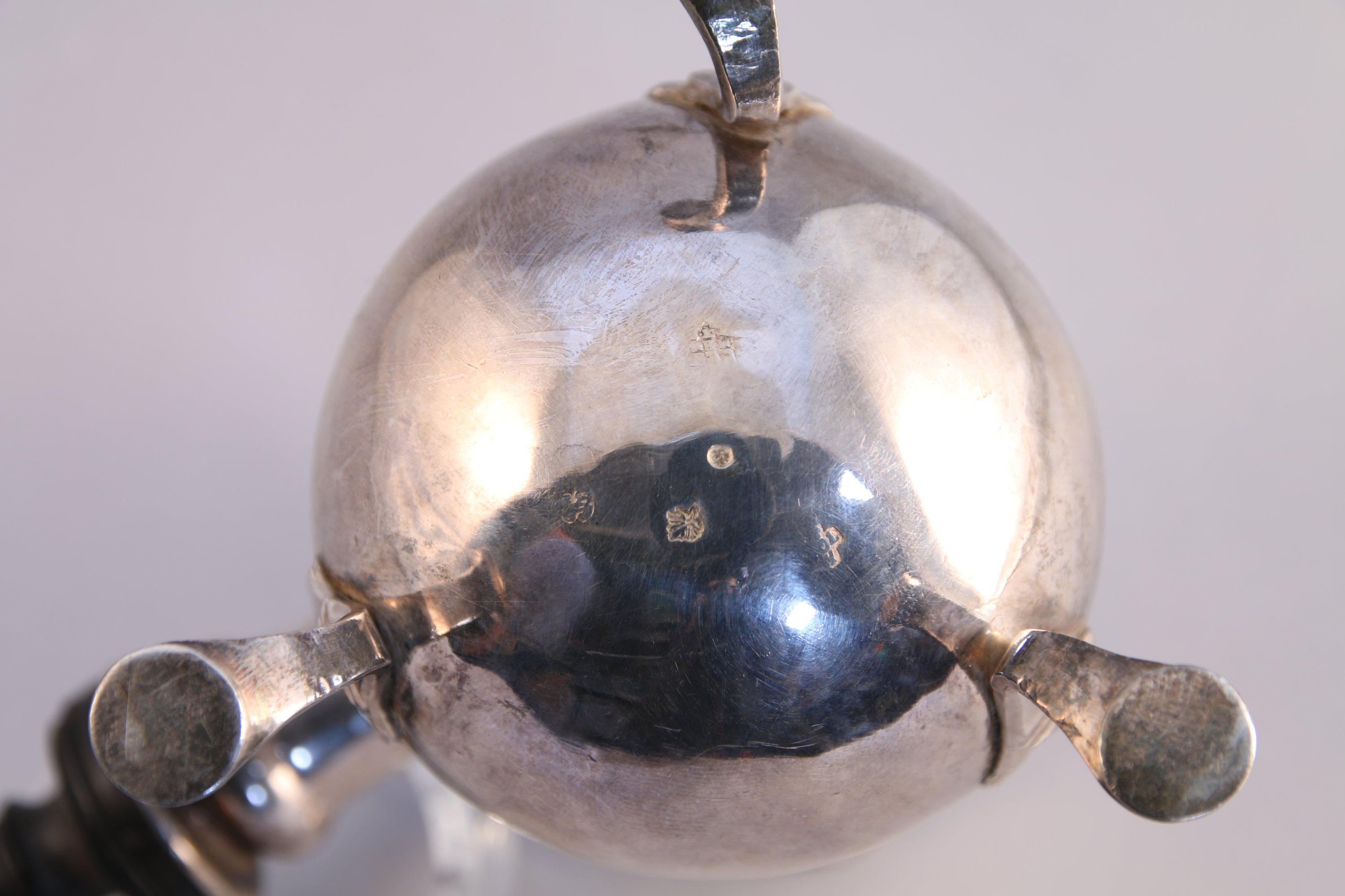 TOULOUSE. VERSEUSE piriforme dite "égoïste" en argent uni. Le fretel adopte la forme d'une rose épanouïe. Le col souligné de filets. Bec verseur dit "canard". Manche latéral en ébène tourné et noirci. Elle repose sur trois pieds cambrés à attache en cartouche sommé d'une perle.