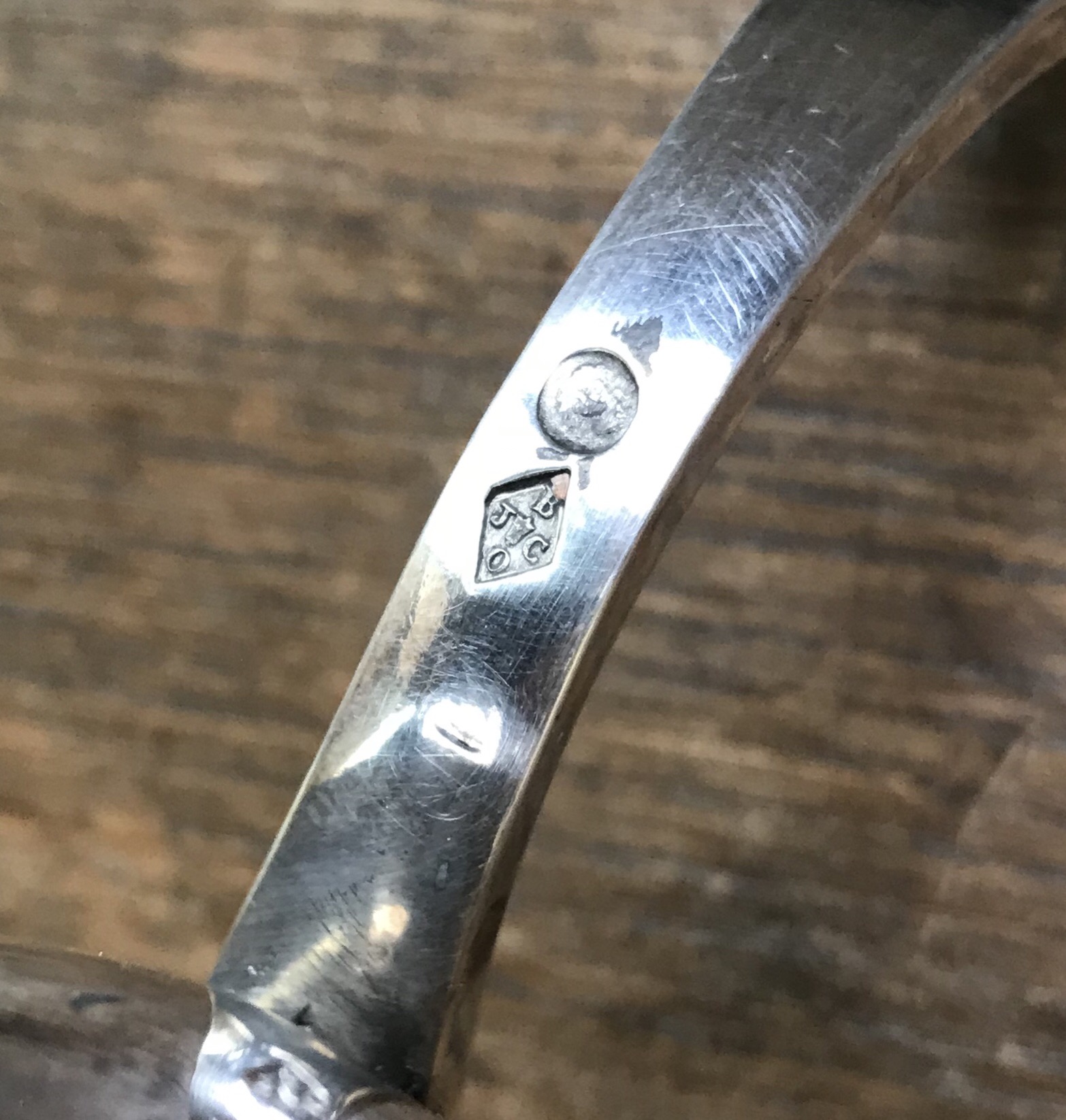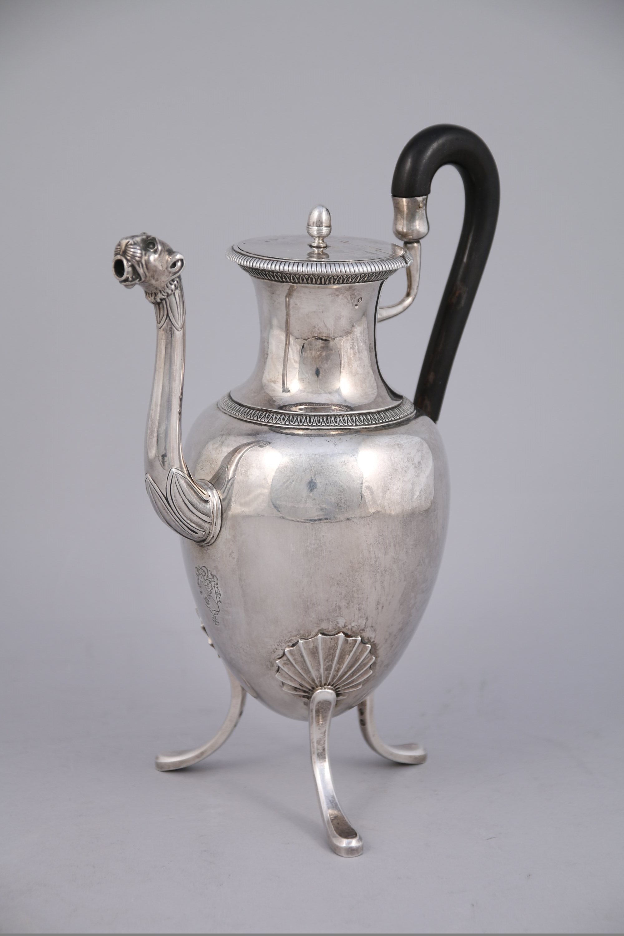 CAFETIÈRE de forme ovoïde en argent à décor de frises de feuilles d'eau et godrons. Couvercle à charnière à fretel en gland. Bec en gueule de lion. Anse en bois noirci. Elle repose sur trois pieds à larges attaches en aile de chauve-souris.