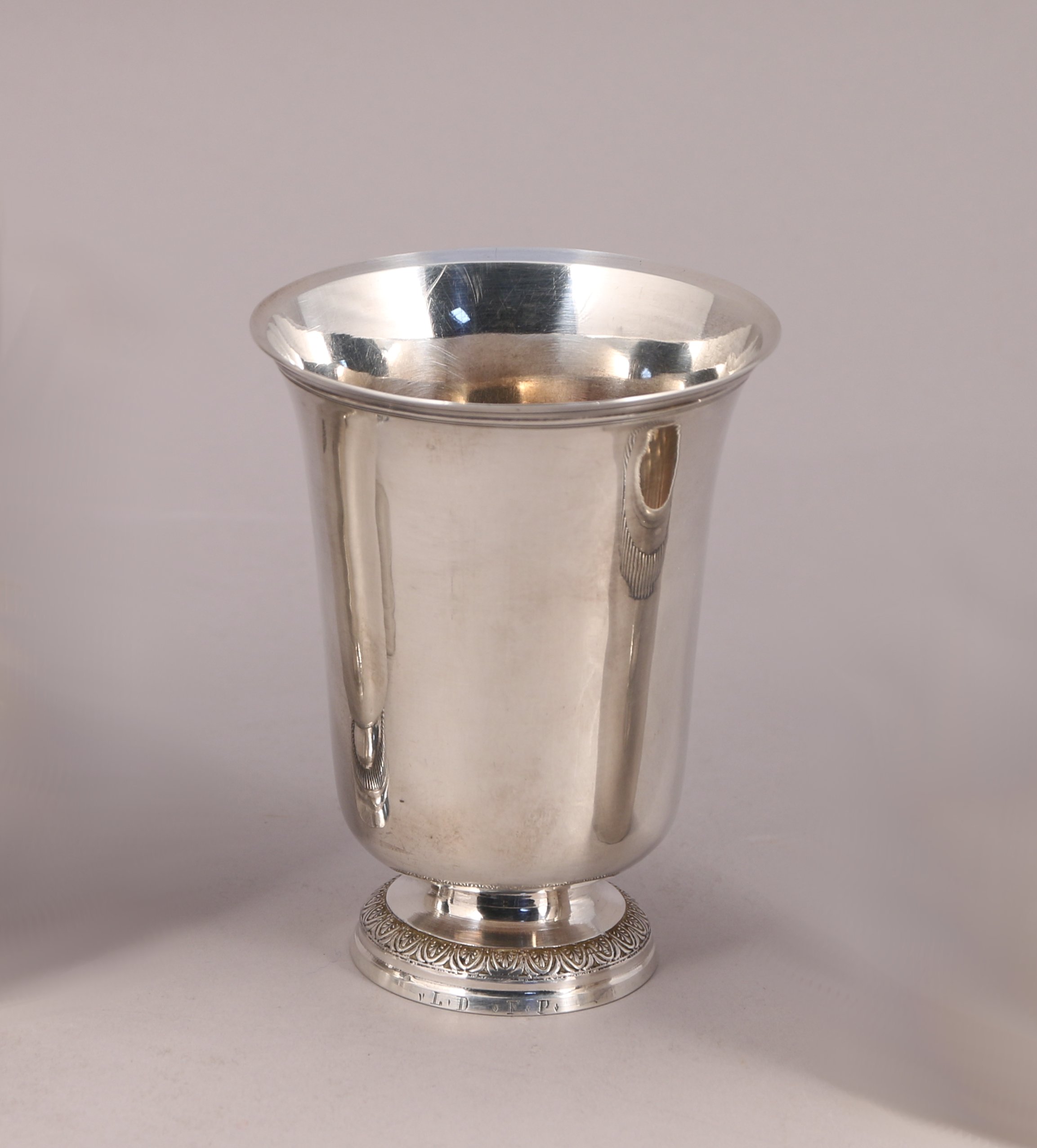 TIMBALE dite "TULIPE" en argent uni. Le col évasé souligné de filets. Elle repose sur un piédouche à frise de palmettes marqué "LD FP".