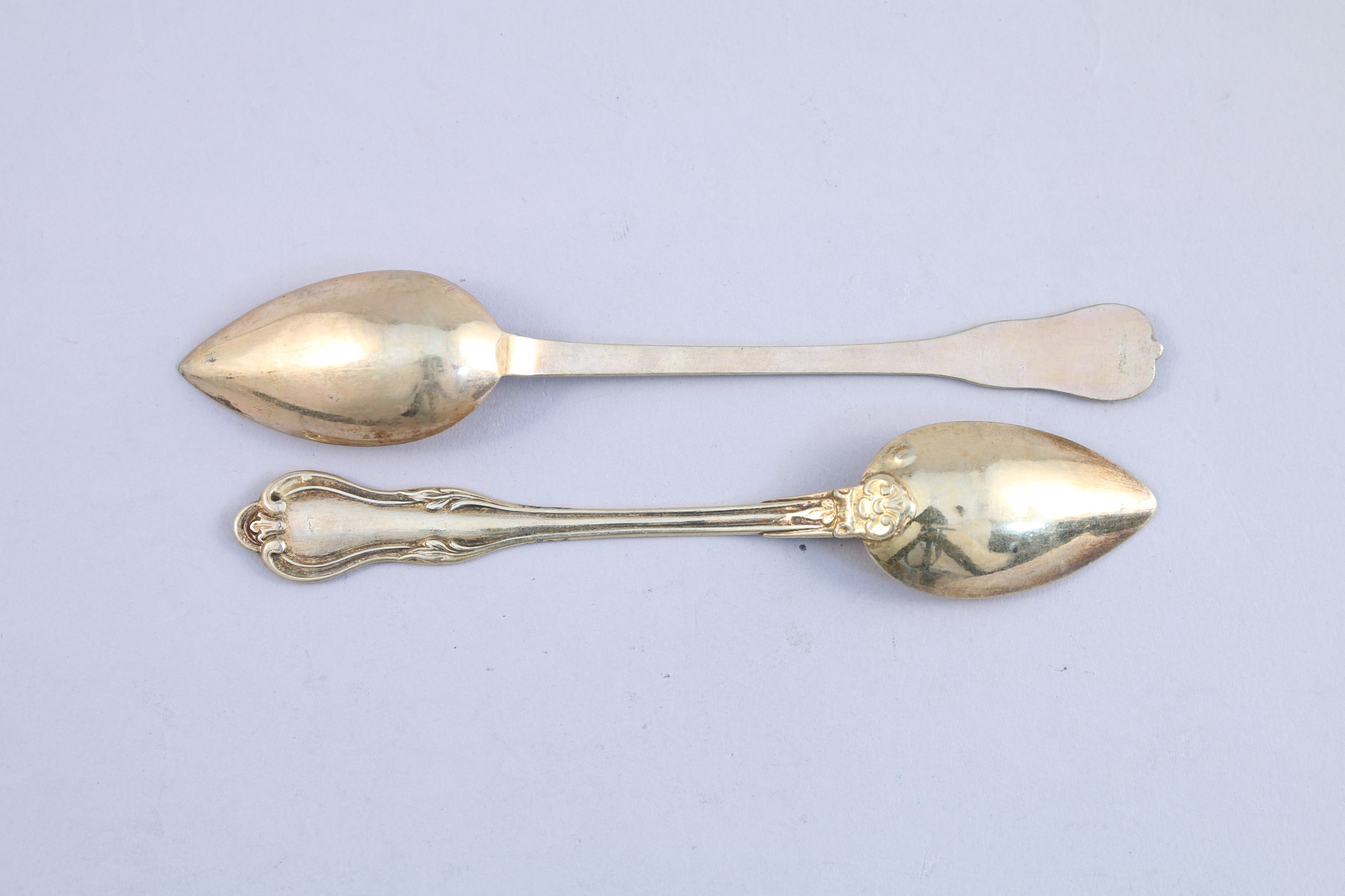 - La seconde à spatule violonée agréméntée d'acanthes et enroulements. Poinçon Minerve, fin du XIXe. Maître-orfèvre : Claude Doutre-Roussel, fabricant orfèvre au 118, rue Vieille-du-Temple à Paris.
