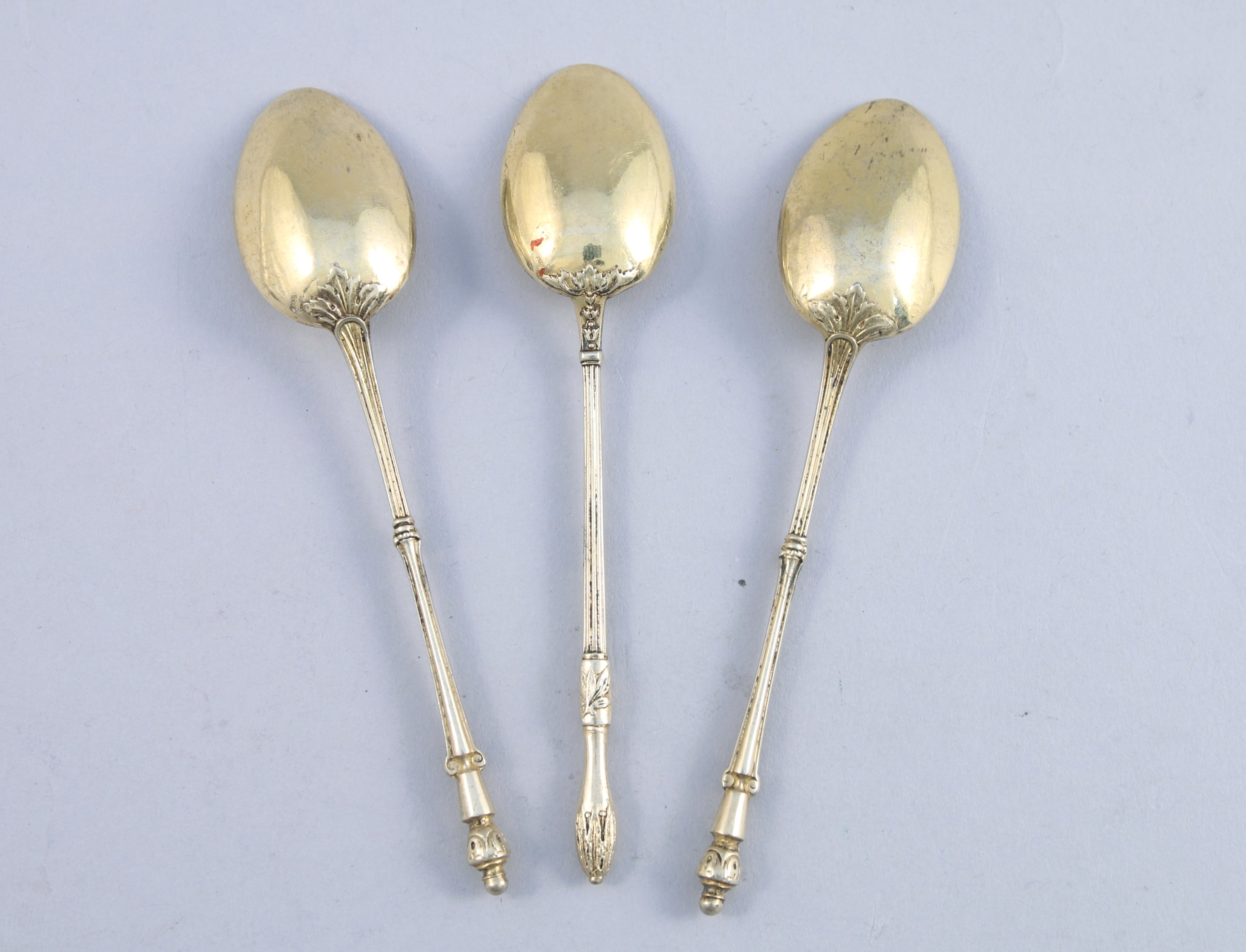 JOINT : TROIS CUILLÈRES À MOKA en vermeil, dont une paire, manche à la russe. Poinçon Minerve, XIXe. Poids : 35 g.