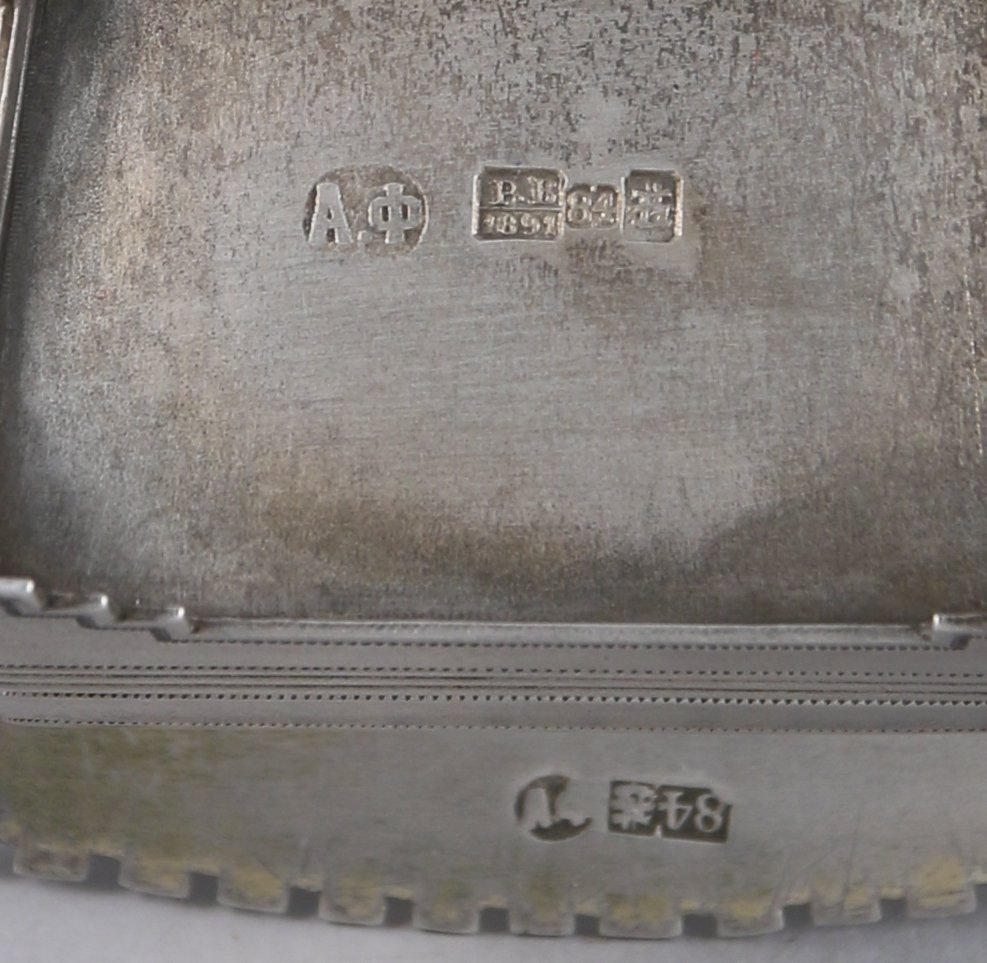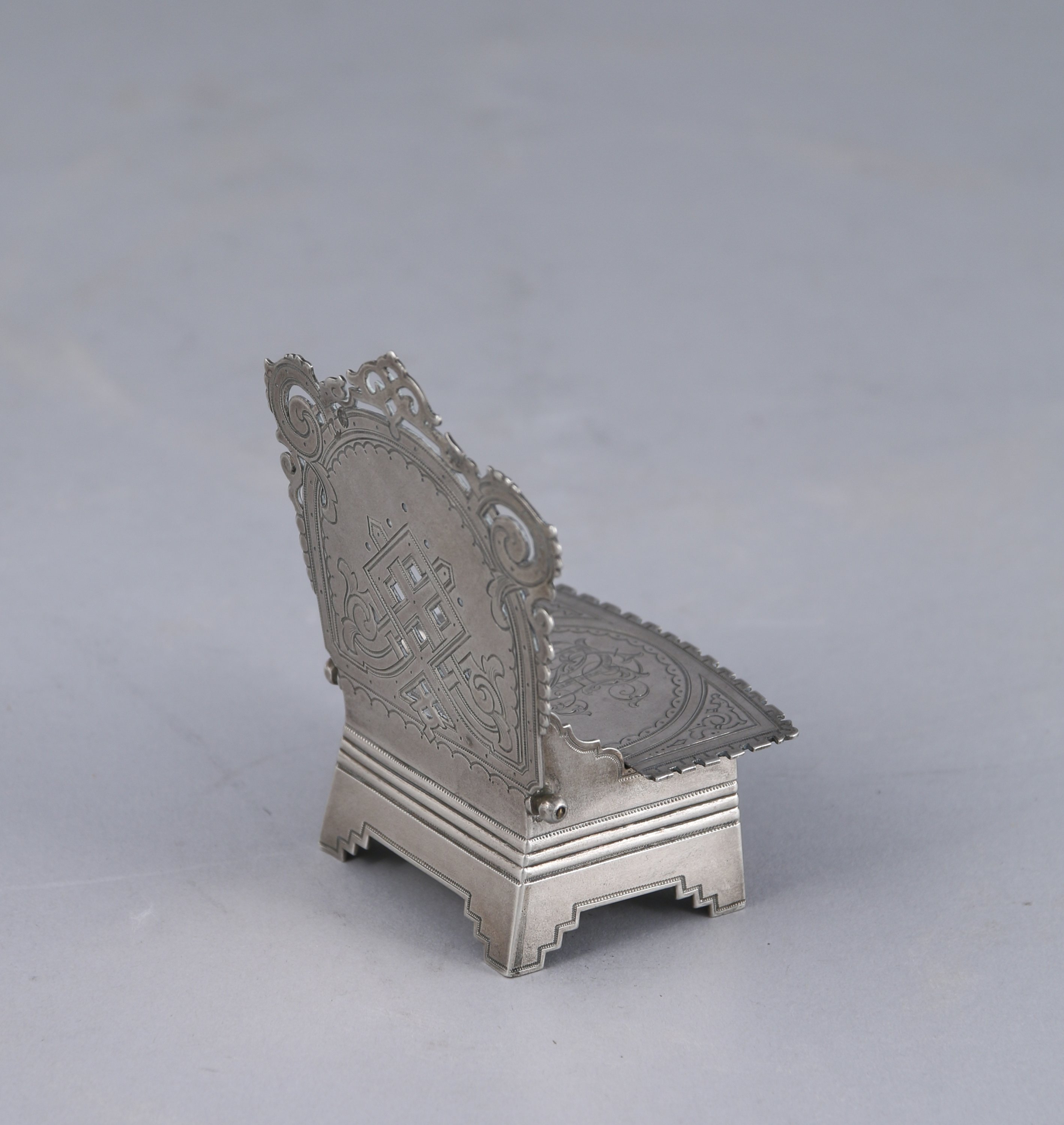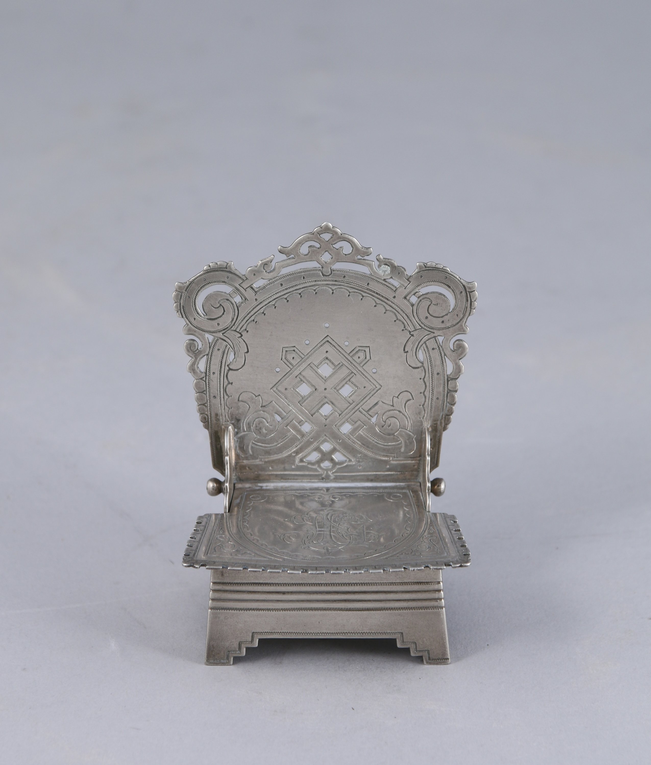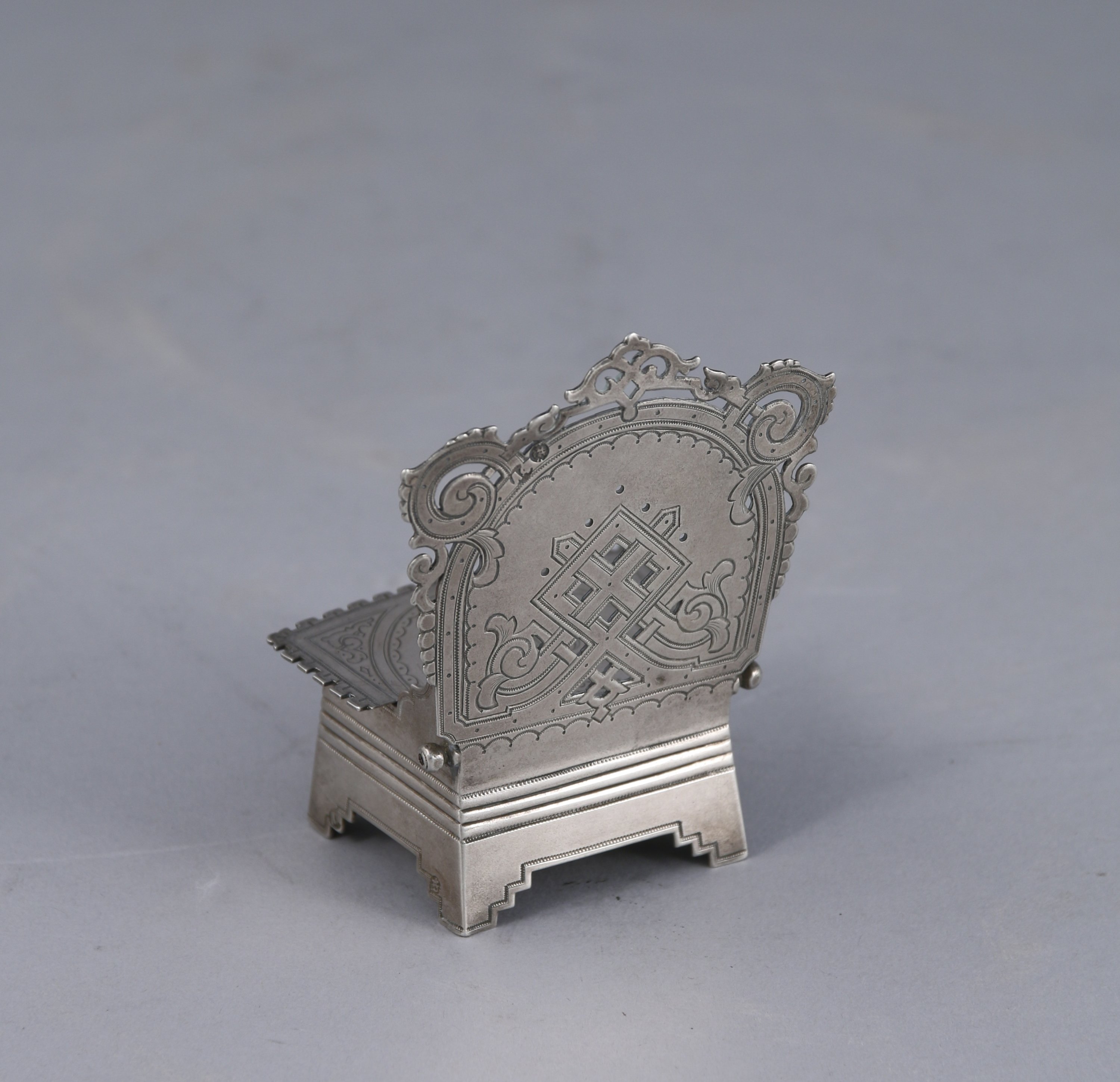 MOSCOU. SALERON adoptant la forme d'un fauteuil en argent à décor ajouré de motifs géométriques et en roulements feuillagés. L'assise monogrammé "PHL". Il repose sur quatre pieds à degrés. L'intérieur vermeillé.